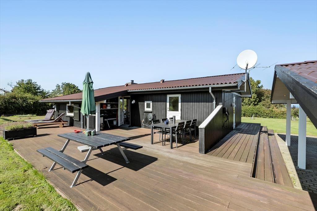 Wenn du das große, hoch gelegene Grundstück betrittst, spürst du sofort, dass sich die Welt hier langsamer dreht. Du parkst dein Auto im Carport, der nicht nur vor Sonne und Regen schützt, sondern auch die Möglichkeit bietet, dein Elektroauto aufzuladen. Dies macht deine Ankunft besonders komfortabel – vor allem, wenn du mit vollen Tüten vom Einkauf zurückkehrst. Du kannst das Meer erahnen, das nur 700 Meter entfernt liegt. Rund um das Haus erstreckt sich eine große Holzterrasse, die zum Entspannen und zu gemütlichen Grillabenden einlädt. Hier ist Platz für alles – von einem Liegestuhl in der Ecke, in dem du den Morgenkaffee genießen kannst, bis zu einem großen Tisch, an dem die Familie zu den Mahlzeiten zusammenkommt. Die Kinder laufen auf den Rasen, wo sie Schaukeln und einen Sandkasten entdecken. Ihr Lachen erfüllt die Luft, während sie ungestört spielen und du lächelst bei dem Gedanken an all die Stunden voller Spiel und Spaß. Die Terrasse gibt dir die Möglichkeit, sie im Auge zu behalten, während du selbst einen ruhigen Moment in der Sonne genießt.
