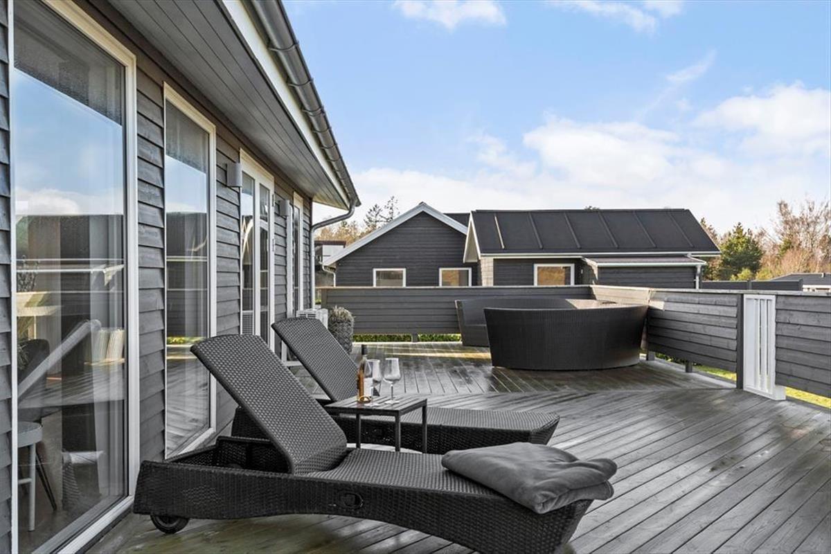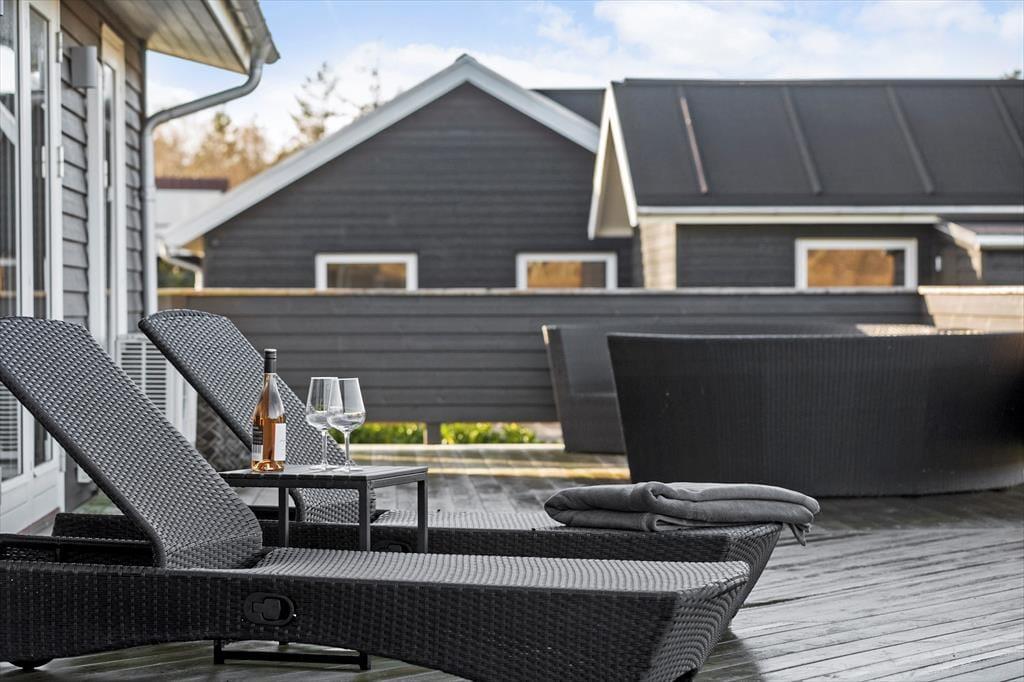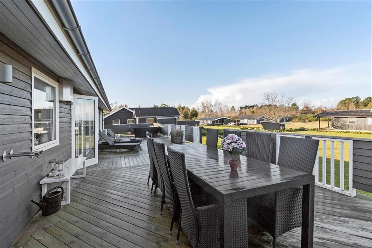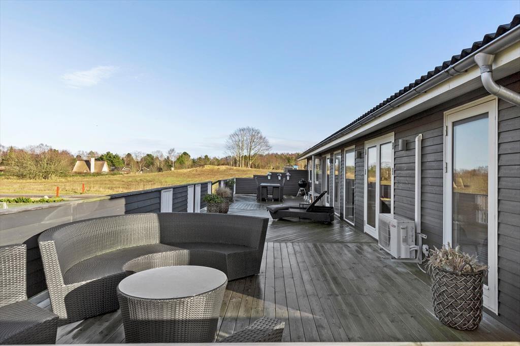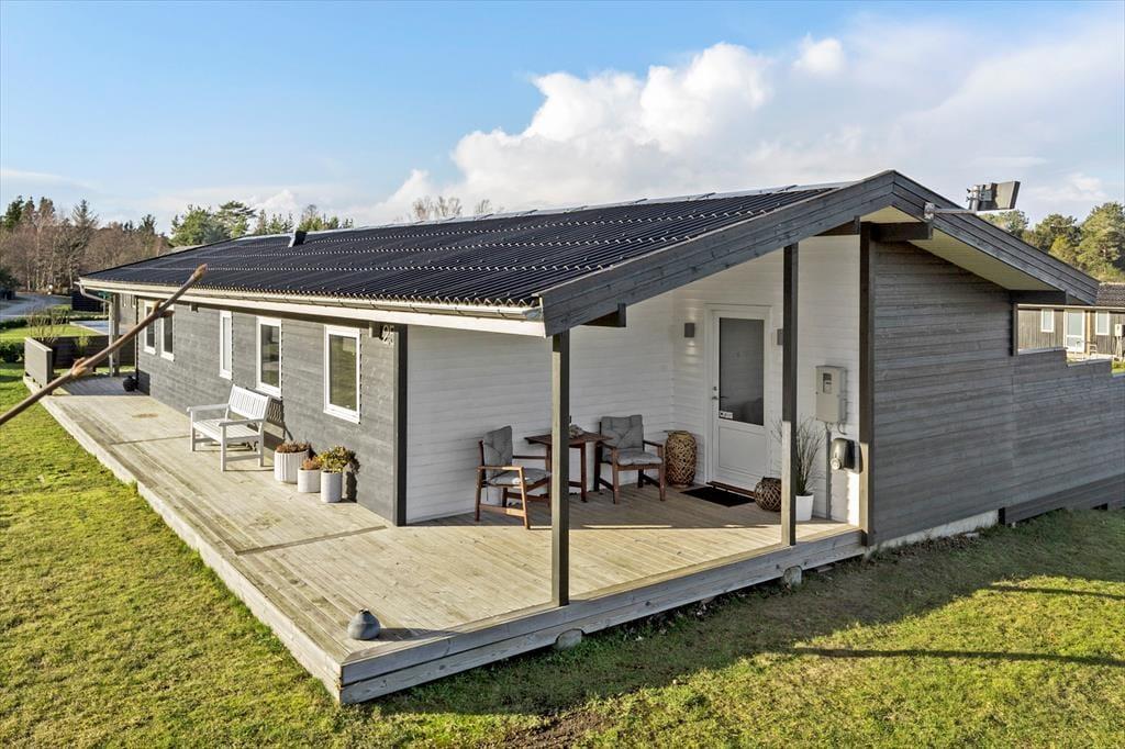 Die Terrasse ist das Herzstück deines Ferienhausgrundstücks. Sie ist teilweise überdacht und umzäunt. Dadurch kannst du dich ganz nach persönlicher Vorliebe für einen sonnenverwöhnten oder schattigen Aufenthaltsplatz entscheiden. Gartenmöbel laden zu gemütlichen Mahlzeiten im Freien ein. In den Loungemöbeln kannst du dich wunderbar mit einem spannenden Buch niederlassen. Liegestühle für ausgedehnte Sonnenbäder stehen ebenfalls bereit. Während die Kinder vergnügt auf dem Rasen umhertollen, bereitest du in aller Ruhe einen stimmungsvollen Grillabend vor. Nach dem Essen könnt ihr zusammen Fußball spielen oder anderen unterhaltsamen Outdoor-Aktivitäten nachgehen. Laue Sommerabende, die von der untergehenden Sonne in schönste Farbtöne getaucht werden, lasst ihr gemeinsam mit eurem Lieblingsgetränk auf der Terrasse ausklingen. Hier entstehen Urlaubserinnerungen - geprägt von Lachen, Gemeinsamkeit und Ferienhausstimmung.