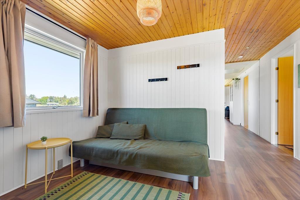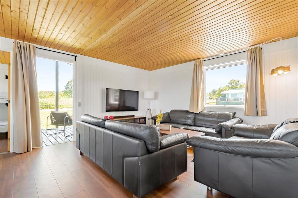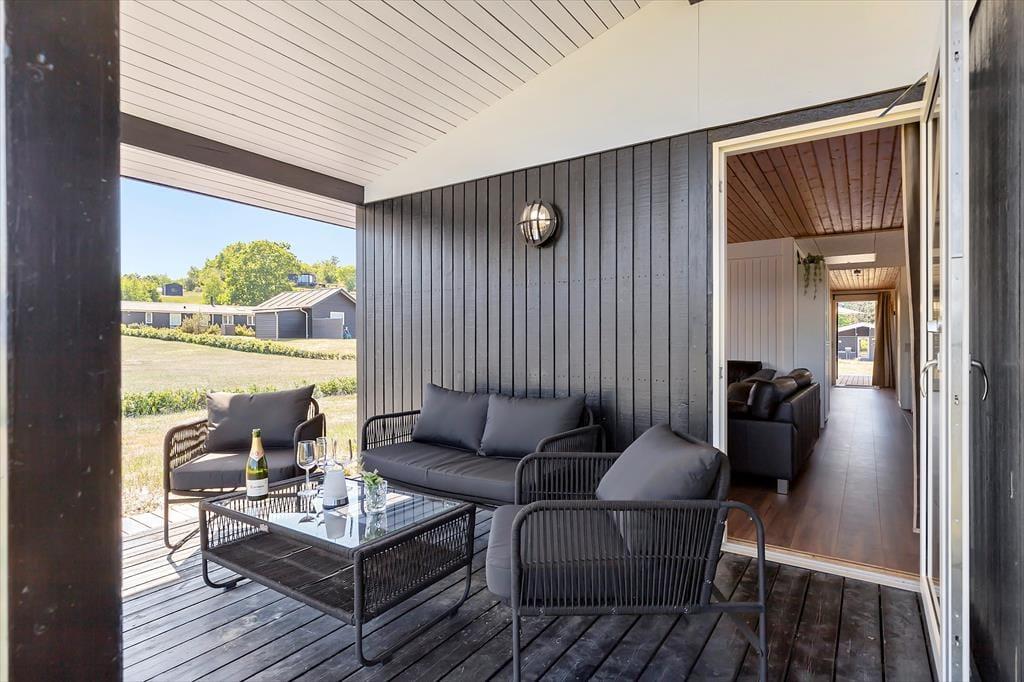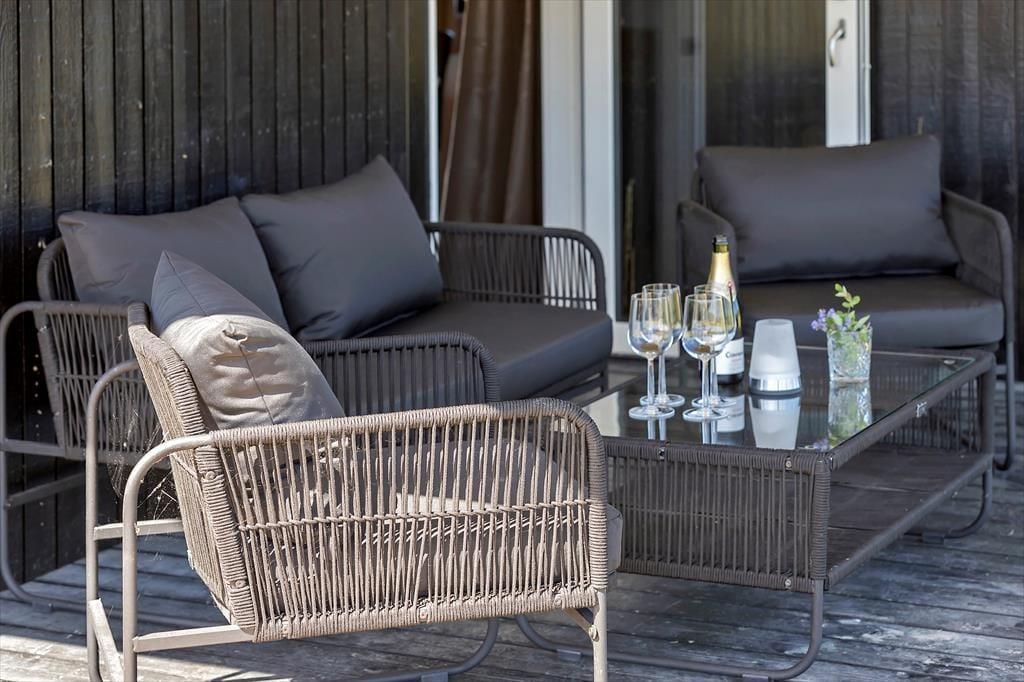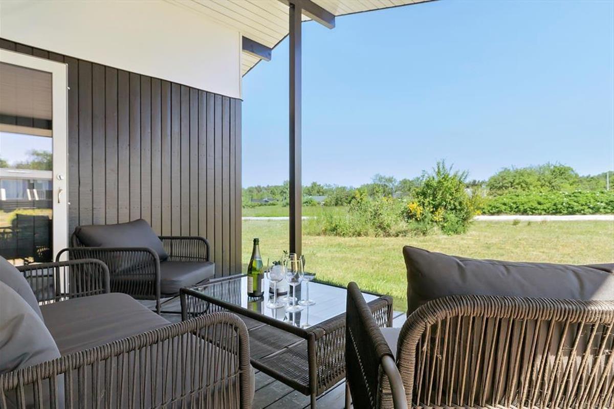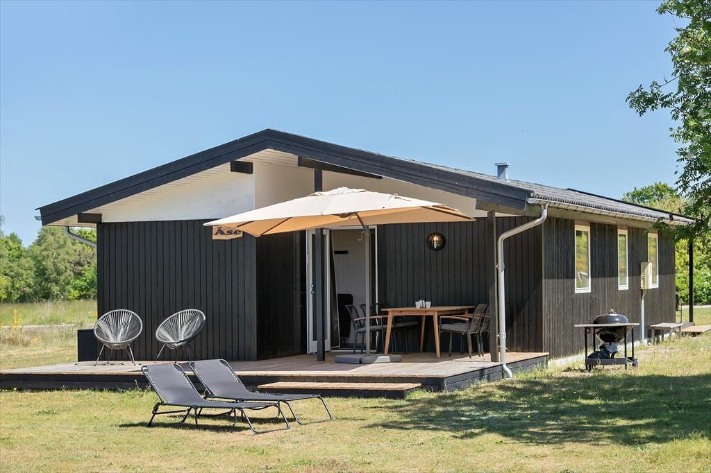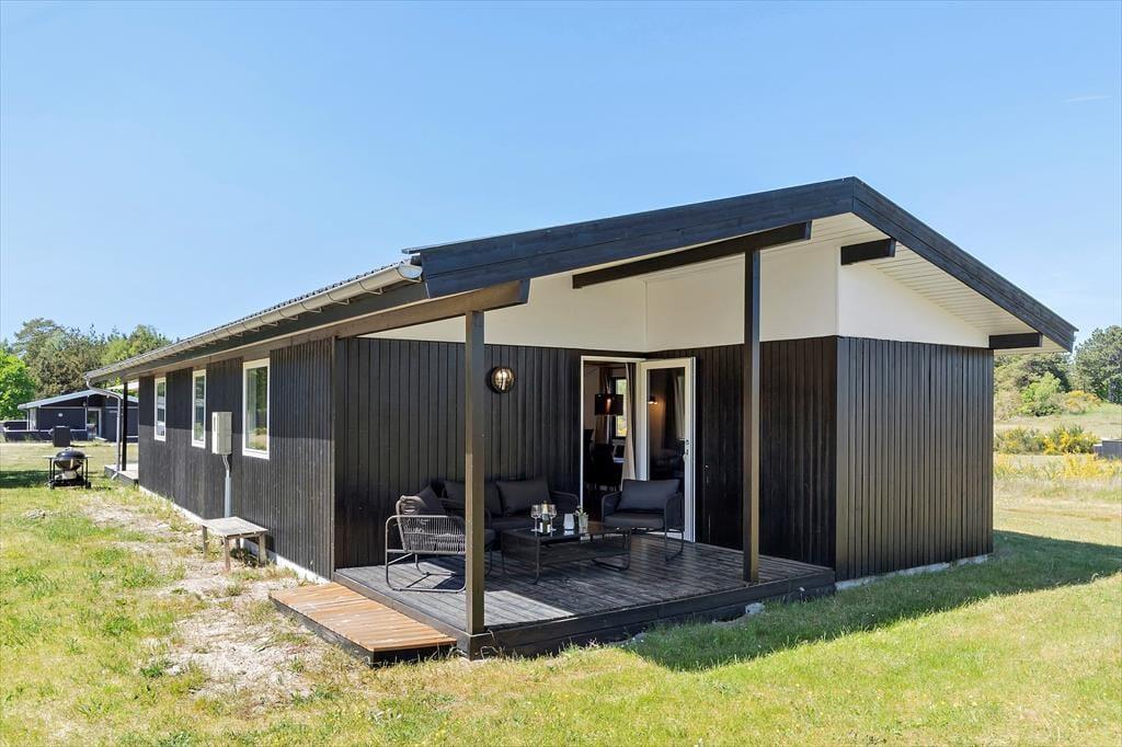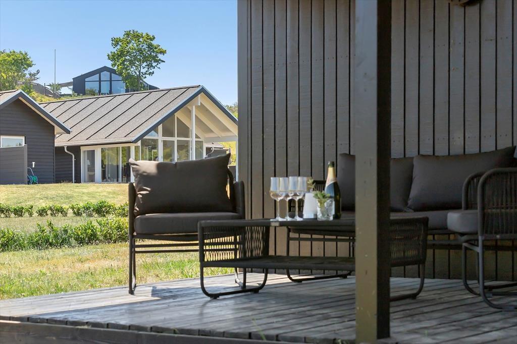 Nur 350 Meter vor deiner Haustür erstreckt sich der schöne, kinderfreundliche Strand. Das ansprechende, ebene Grundstück eignet sich bestens zum Ballspielen und für zahllose andere unterhaltsame Outdoor-Aktivitäten. An dein Ferienhaus schließen zwei sonnenverwöhnte Terrassen - eine an der Ostseite vor dem Eingang und eine Westterrasse, die vom Wohnraum aus zugänglich ist. Auf der Ostterrasse kannst du es dir wunderbar mit einem frischen Kaffee in der Morgensonne gemütlich machen. Später am Tag wird es dich auf die Westterrasse ziehen, die mit ihren Loungemöbeln und einem Grill unter anderem zum Genießen der langen, lauen Sommerabende einlädt.