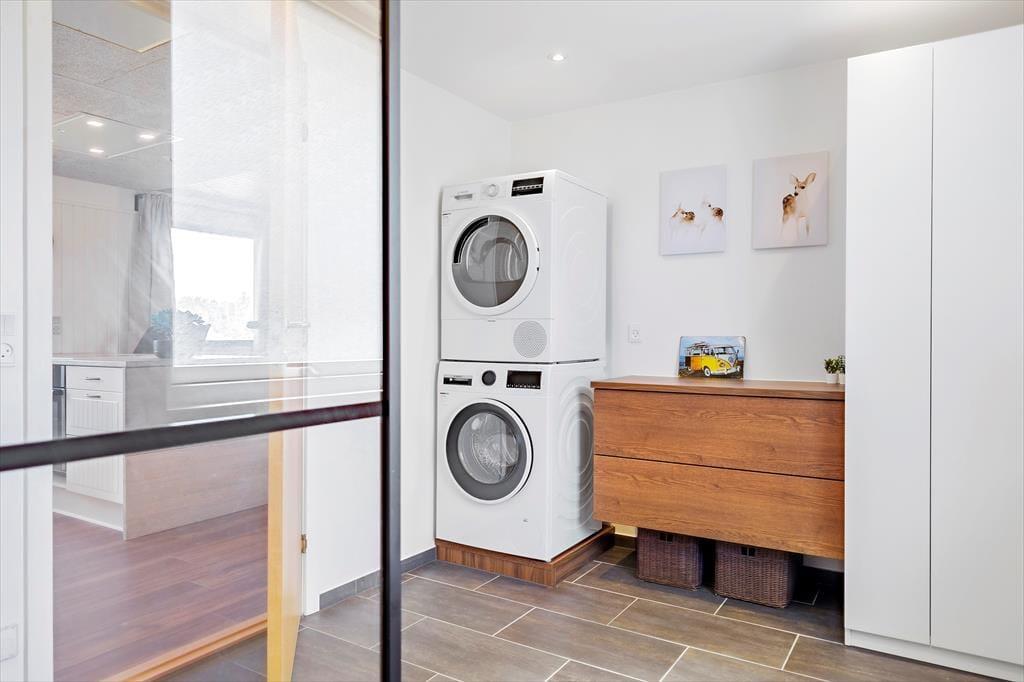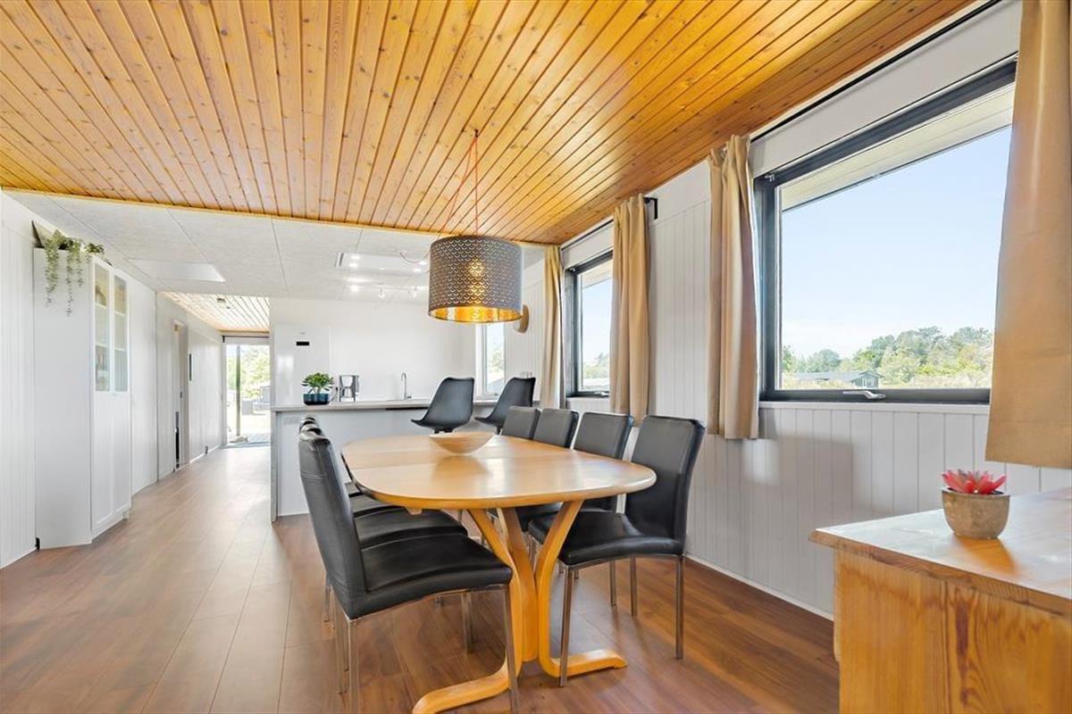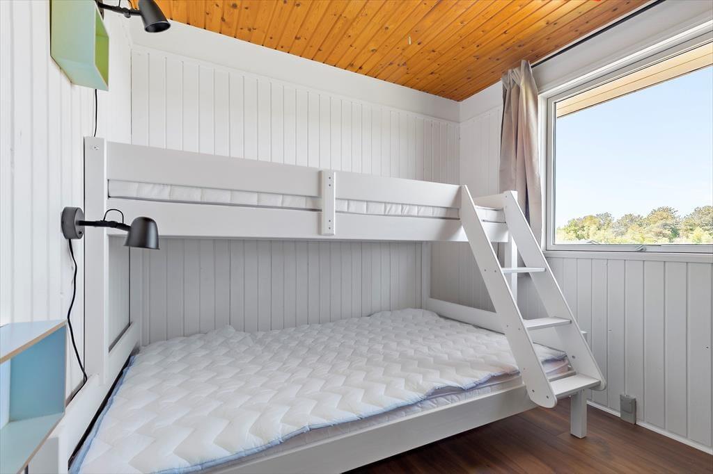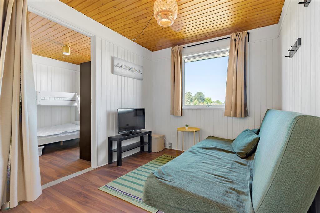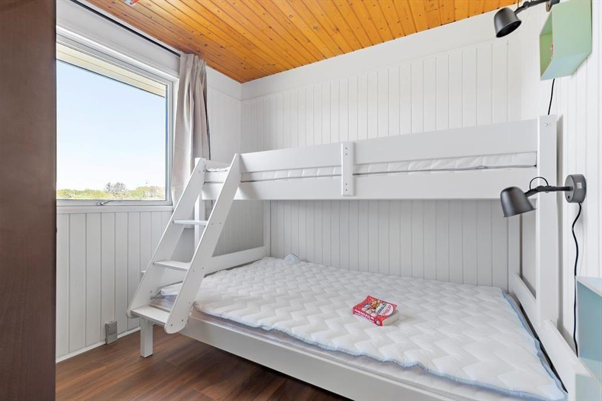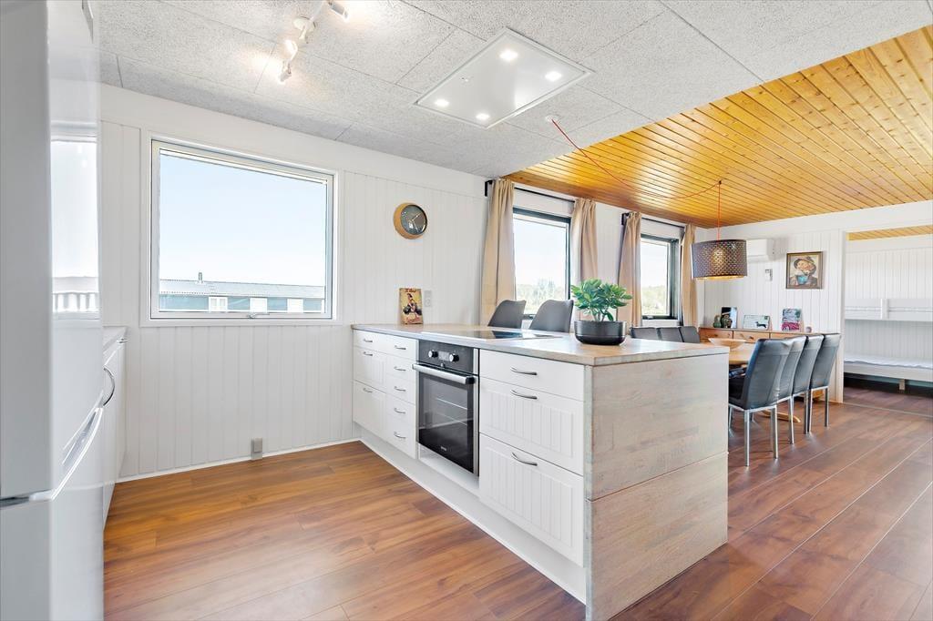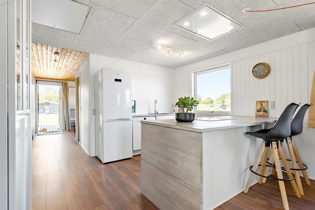 Freu dich bereits jetzt auf einen tollen Familienurlaub in diesem Ferienhaus, das einen schönen Rahmen für unvergessliche Urlaubserlebnisse bietet. Das geräumige Mietobjekt beinhaltet eine neue, moderne Küche, in der du deiner Kreativität beim Kochen freien Lauf lassen kannst. Die Kücheninsel fungiert nicht nur als Arbeitsplatz, sondern Dank der Hocker zugleich als Bartresen, den alle gerne nutzen. Die offene Küche harmoniert gut mit dem Essbereich und dem gemütlichen Wohnraum, in dem komfortable Polstersitzmöbel und ein Fernseher zu erholsamen Stunden nach einem langen, erlebnisreichen Urlaubstag einladen. Die Schlafplätze verteilen sich auf drei Schlafräume, von denen einer mit einem Doppelbett eingerichtet ist. Im zweiten Raum triffst du ein Etagenbett und im dritten auf ein Doppelbett und ein darüber angebrachtes Hochbett für eine Person - am besten für ein Kind. In einem Winkel des Eingangsbereiches stehen ein doppeltes Schlafsofa und ein Fernseher zur Verfügung. Dadurch bieten sich schöne Rückzugsmöglichkeiten zum Lesen, zum Anschauen eines spannenden Films und zum Spielen. Schlussendlich muss das tolle, neue Badezimmer erwähnt werden, das mit einer großen Duschkabine, einer Waschmaschine und einem Wäschetrockner zu überzeugen weiß.
