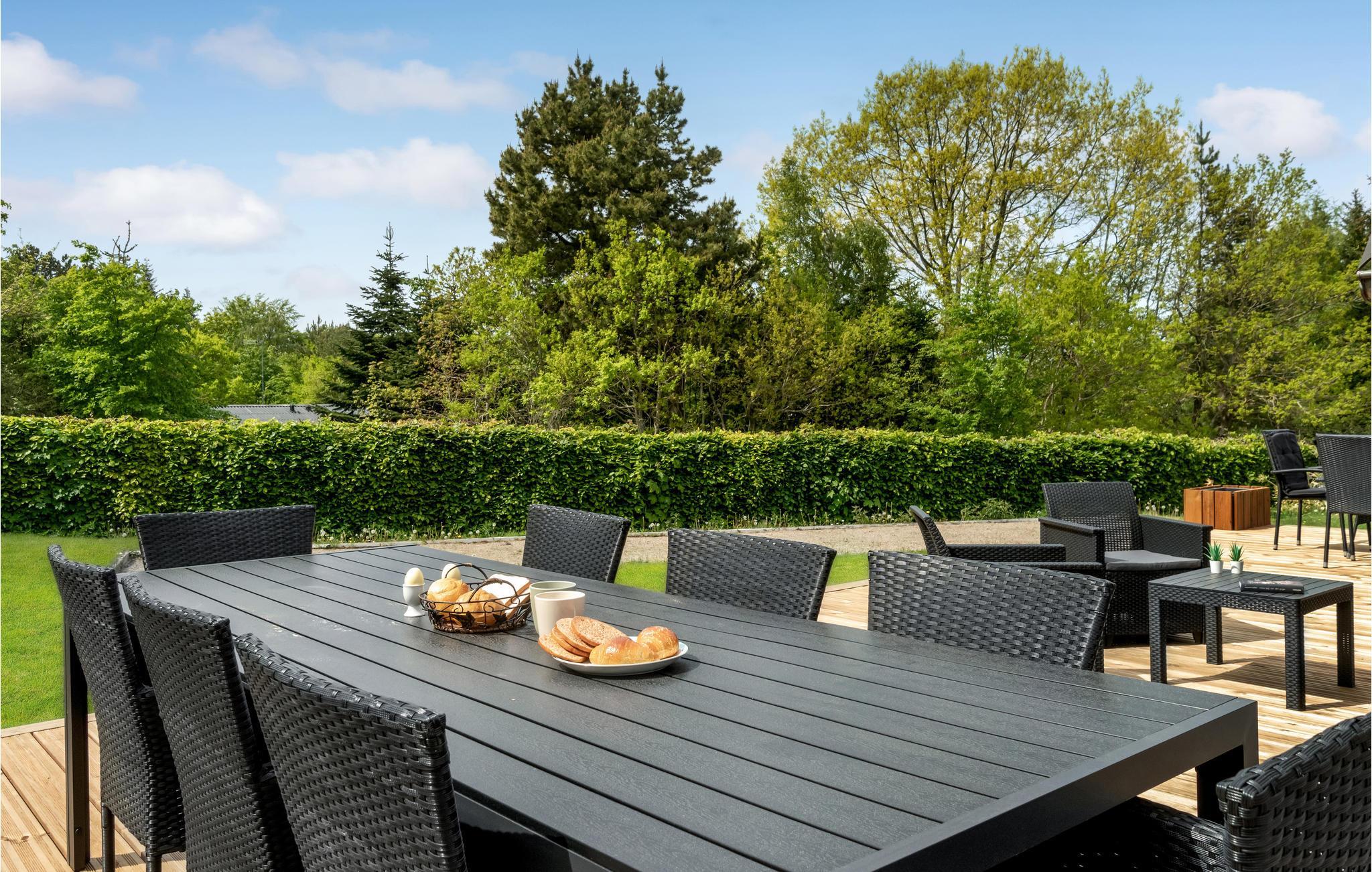 Gezellig vakantiehuis nabij Bønnerup Strand met uitzicht op groen, open terras en houtkachel voor een ontspannen verblijf.