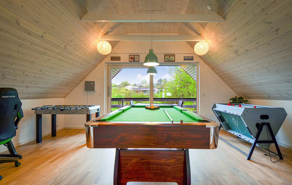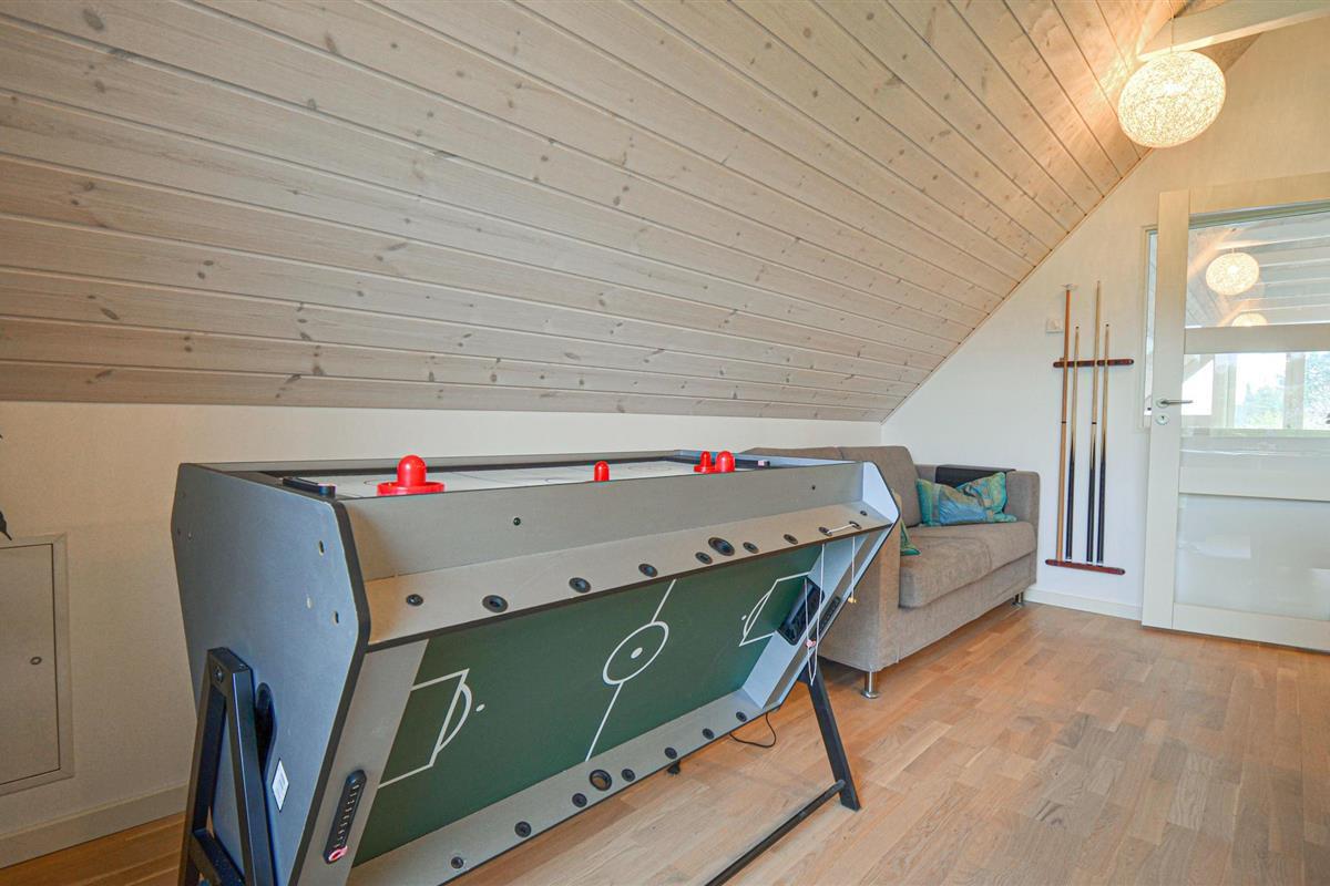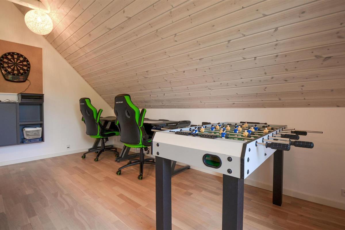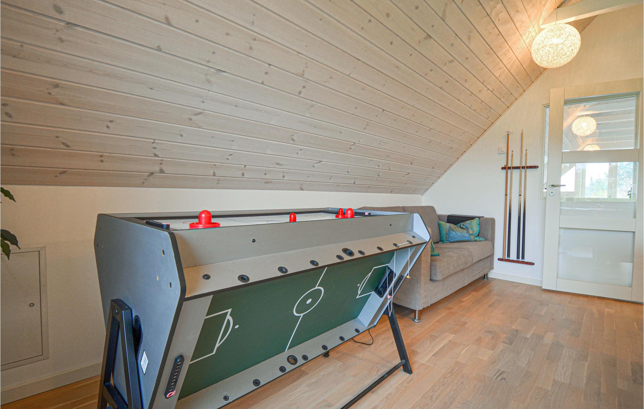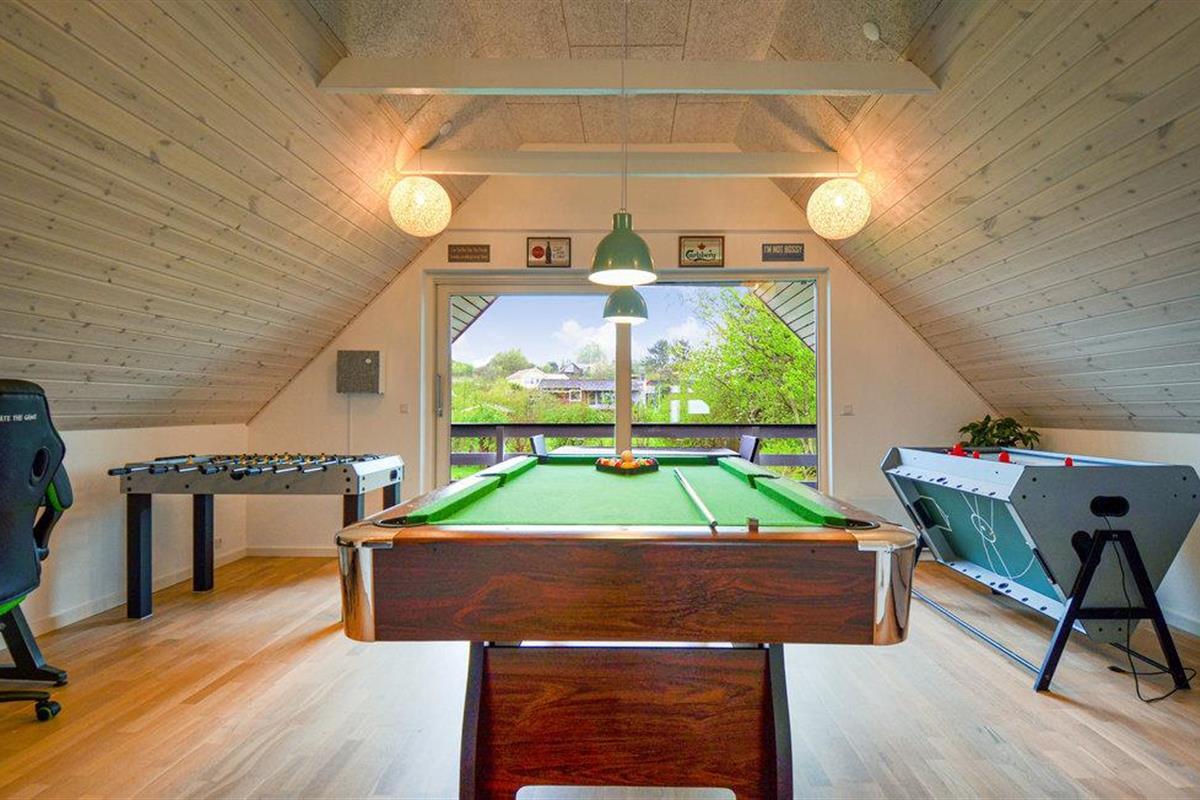 In Bønnerup vindt u dit ongewoon mooie vakantiehuis op 2 verdiepingen met een activiteitenruimte op de 1e verdieping waar u kunt biljarten, tafelvoetballen of airhockeyen. Het huis is uitgerust met 4 mooie slaapkamers, waarvan één op de 1e verdieping, samen met een tv-kamer. Op de begane grond bevindt zich de grote, goed uitgeruste woonkamer, die in open verbinding staat met de keuken. De prachtige houtkachel en een eettafel met plaats voor alle gasten zijn hier ook te vinden. Er zijn ook 2 prachtige badkamers - een met infrarood sauna en whirlpool voor 2 personen. Geniet van uw vakantie op het enorme houten terras, waar u op het overdekte gedeelte tot laat in de avond kunt genieten van mooie zomeravonden. Het huis heeft glasvezel internet.
