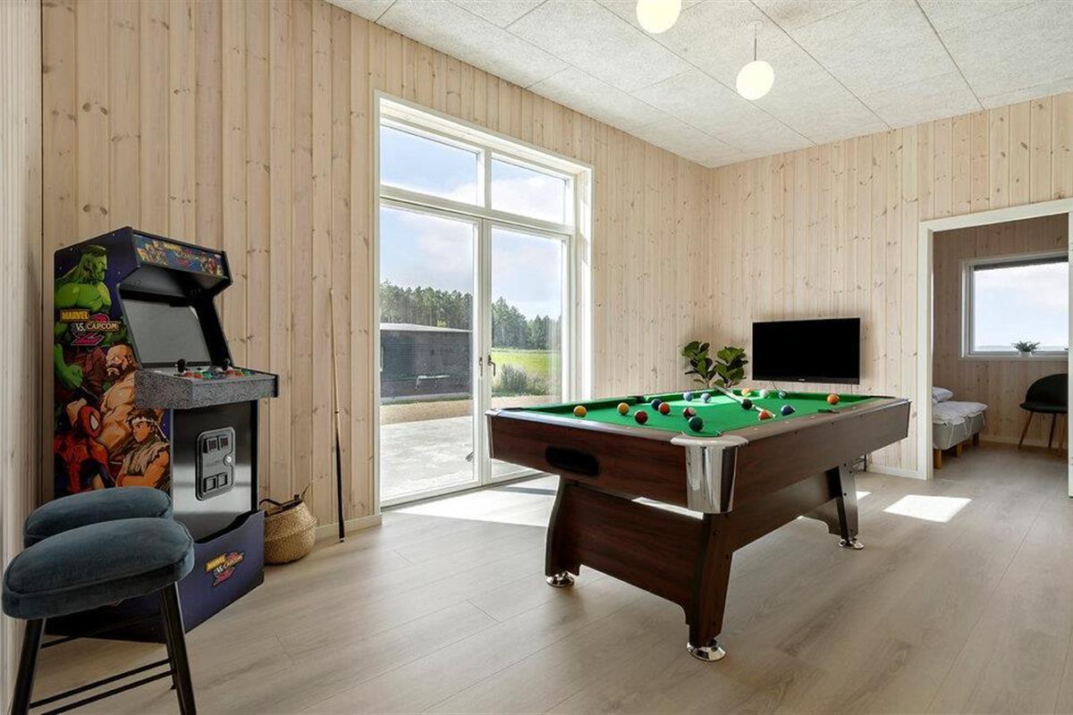 Dit moderne en comfortabel ingerichte vakantiehuis biedt veel ruimte voor langverwachte familiebijeenkomsten of een gezellige vakantie met vrienden. Vier gezellige maaltijden aan de lange eettafel, speel biljart of tafeltennis of op de arcademachine terwijl anderen ontspannen in de sauna of whirlpool, en maak het jezelf gemakkelijk op uitnodigende banken.