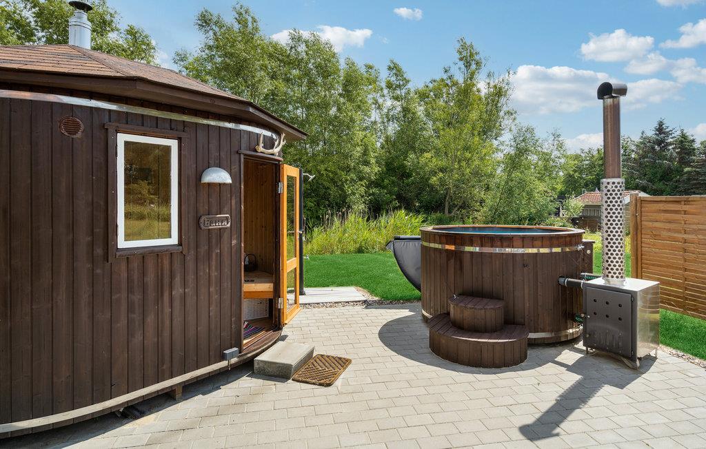 Geniet buiten volop van de zon, maak het jezelf gemakkelijk op het terras en geniet van rustgevende baden in de open lucht in het Finse houten bad.