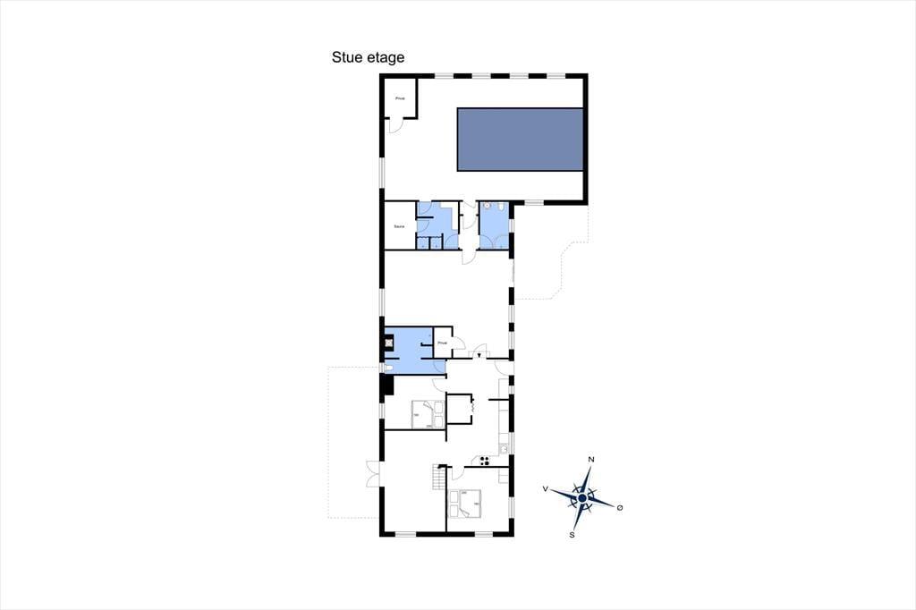 Nicht weniger als 385 m² verteilen sich auf die zwei Etagen des Ferienhauses, und sowohl oben als auch unten präsentieren sich die Räume hell und einladend. Dank der großzügigen Fläche und der durchdachten Einrichtung können Sie problemlos eine große Gruppe in den Urlaub einladen. Der Grundriss bietet unter anderem fünf Schlafzimmer und ganze drei Badezimmer, sodass 11 Personen mühelos zusammen entspannen können. Auch innen gibt es mehrere Aufenthaltsräume: Im ersten Stock gibt es ein Durchgangszimmer mit Tischfußball, während das Erdgeschoss ein großes Wohnzimmer und ein ebenso großes Esszimmer mit offener Verbindung zur gut ausgestatteten Küche bietet. Natürlich ist es auch naheliegend, sich im Poolbereich des Ferienhauses zu versammeln, wo Sie in die Sauna gehen und im Swimmingpool planschen können, der die Maße 7 x 4 x 1,30 Meter hat.