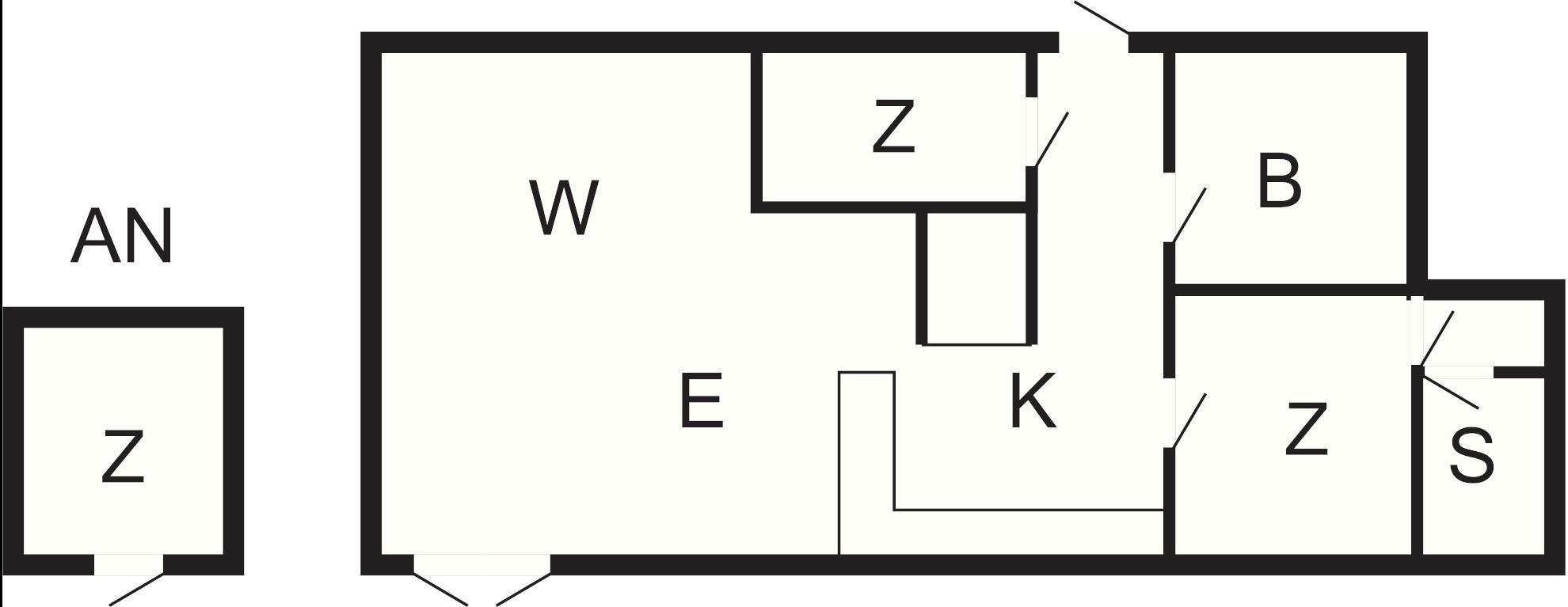 Dieses geräumige Ferienhaus mit 87 m² Wohnfläche ist ideal für eine große Familie oder Gruppe und bietet Schlafmöglichkeiten für bis zu acht Gäste verteilt auf drei Schlafzimmer und einen kleinen, separaten Annex. Das Haupthaus bietet zwei Doppelbetten und zwei Kojen, während im Annex nebenan zwei Einzelbetten bereitstehen. Das Herzstück des Haupthauses ist der große, offen kombinierte Wohn-/Essbereich mit einem gemütlichen Kaminofen, einem Fernseher und einem DVD-Player für gesellige Abende. Die funktionale Küche ist mit einem Elektroherd, einem Kühlschrank und einer Kaffeemaschine ausgestattet. Ein Badezimmer mit Dusche sorgt für einen komfortablen Aufenthalt.