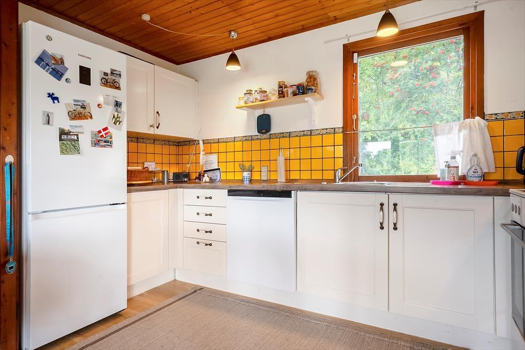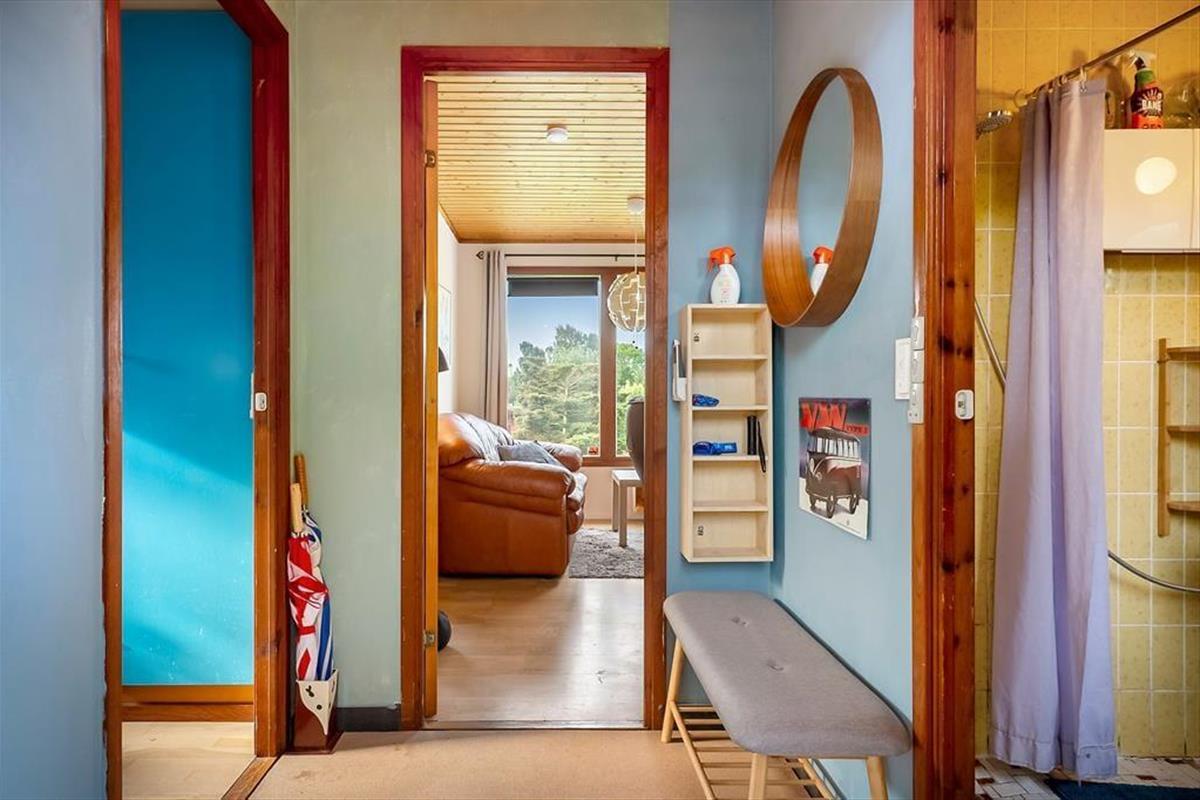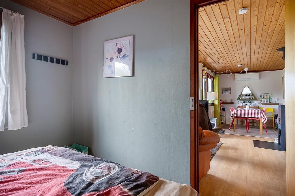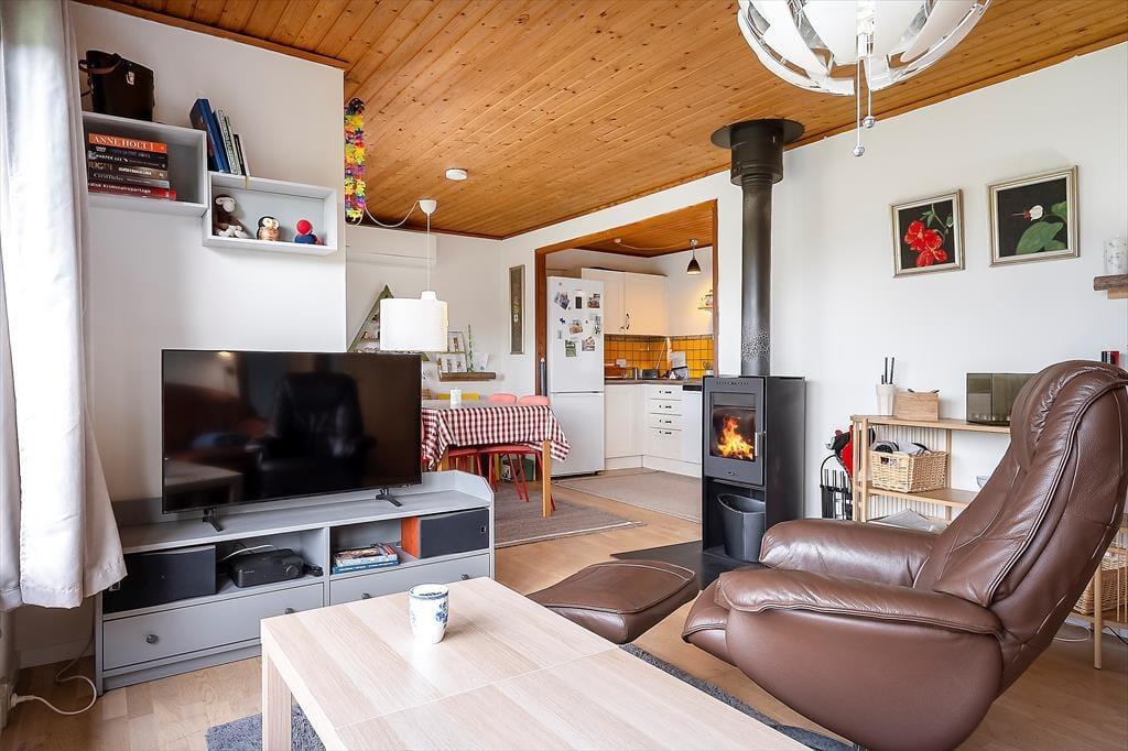 Hier können Sie Ihren Geschäften nachgehen und die Natur genießen. Das Haus verfügt über eine offene Wohnküche. Hier können Sie gemeinsam kochen und gleichzeitig die Ausflüge für den nächsten Tag planen. Die Kinder können fernsehen, und an kalten Tagen können Sie den Holzofen anheizen. Es gibt zwei Schlafzimmer, eines mit Doppelbett und eines mit einem Doppelschlafsofa. Hier können Sie sich gut zurückziehen und ein gutes Buch lesen oder ein Nickerchen machen. Das Badezimmer verfügt über Toilette, Waschbecken und Dusche. Das Haus wird mit einer Wärmepumpe und einem Holzofen beheizt. Vom Wohnzimmer aus gelangen Sie auf die schöne, hoch gelegene Holzterrasse.