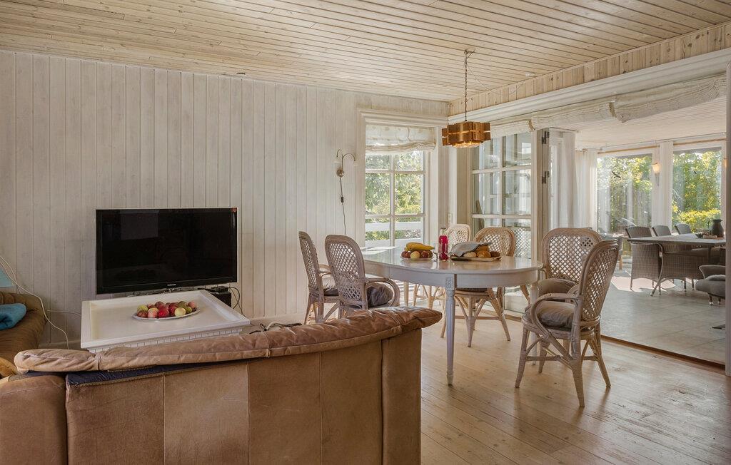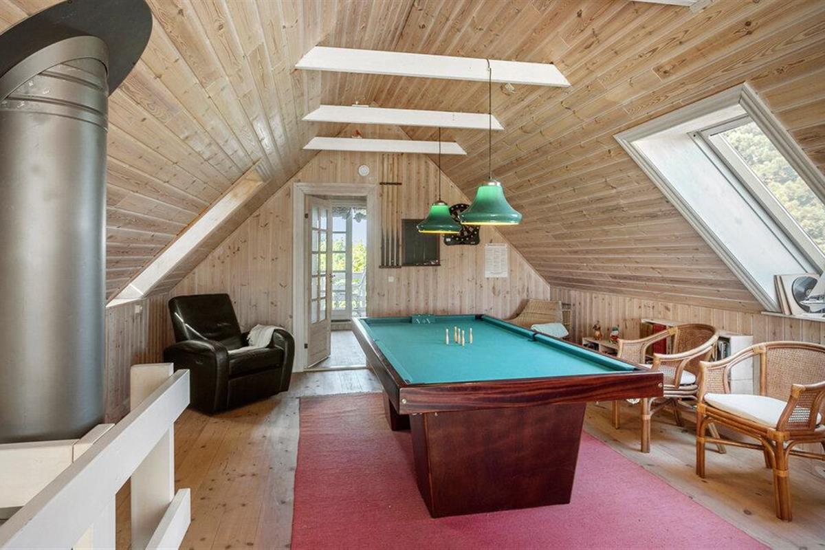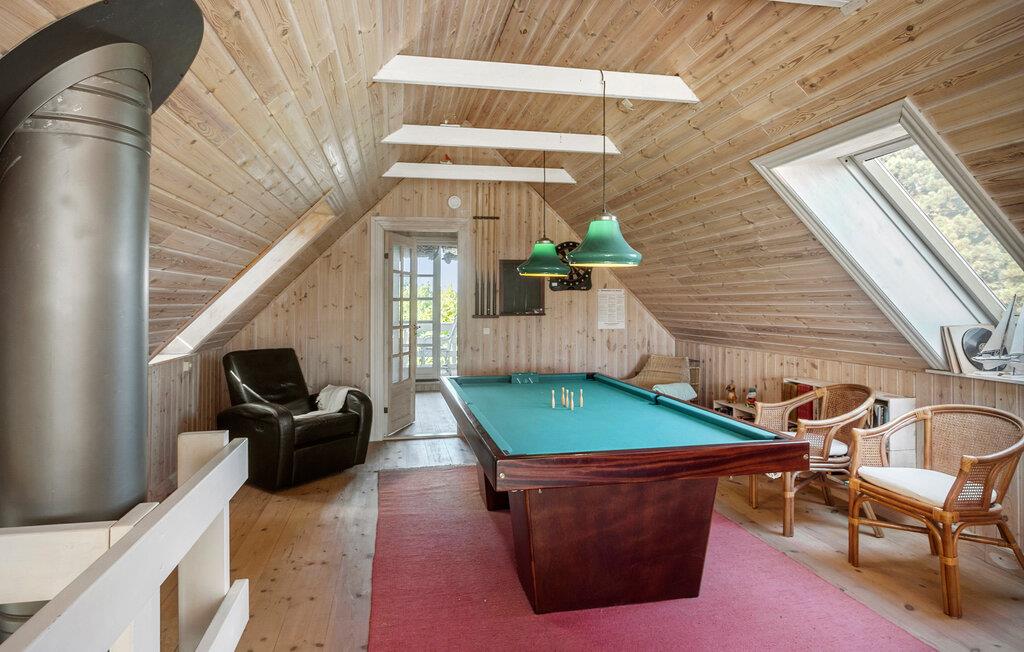 Een warme en gezellige sfeer wacht op je in dit uitnodigende vakantiehuis, dat traditioneel comfort combineert met moderne gezelligheid. Begin je dag ontspannen met een kopje koffie en een heerlijk ontbijt aan de stijlvolle houten eettafel met uitzicht op de betoverende tuin. De woonruimte nodigt je uit om te blijven hangen en te ontspannen op de comfortabele bank. Gebruik de activiteitenruimte op de bovenverdieping om een potje biljart of darts te spelen. Vanaf het balkon hierboven heb je ook een prachtig uitzicht op de zee vlakbij.