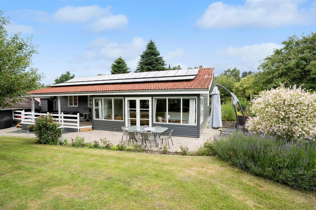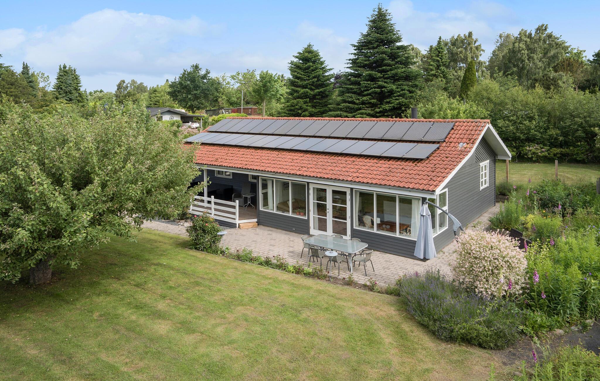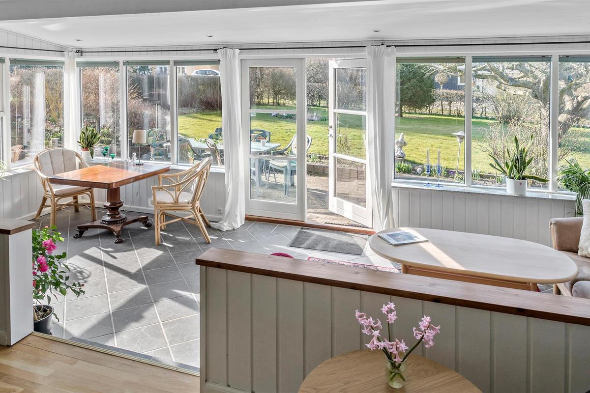 Charmant vakantiehuis bij Bakkebølle Strand met serre, houtkachel en ruime tuin voor een ontspannen verblijf.