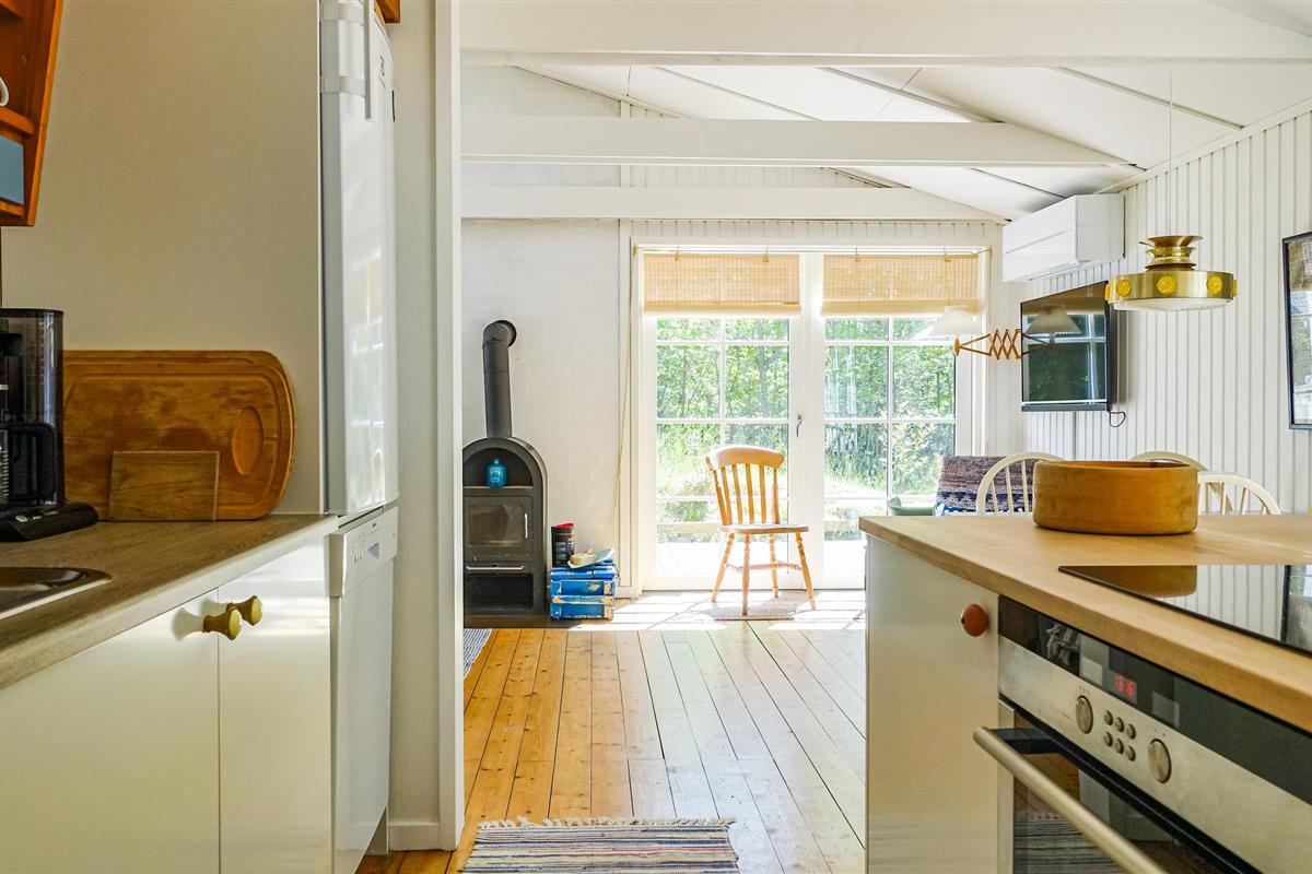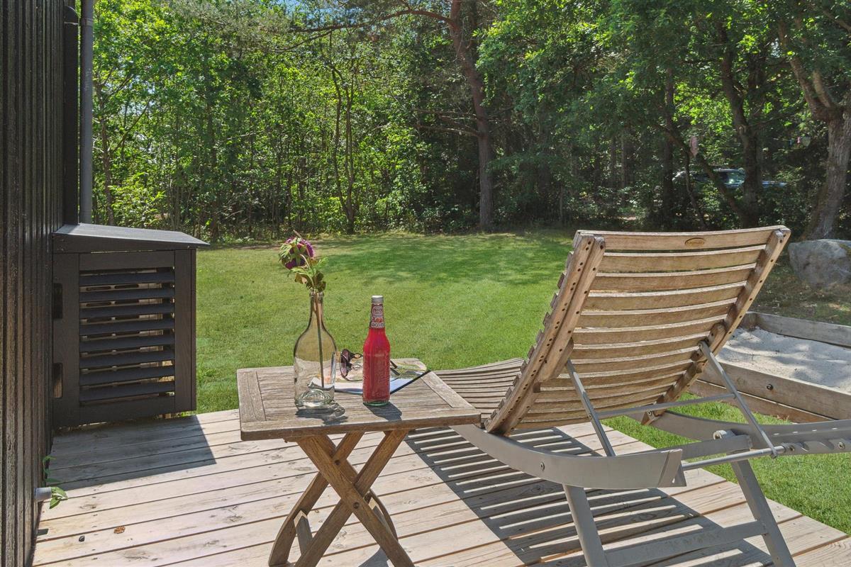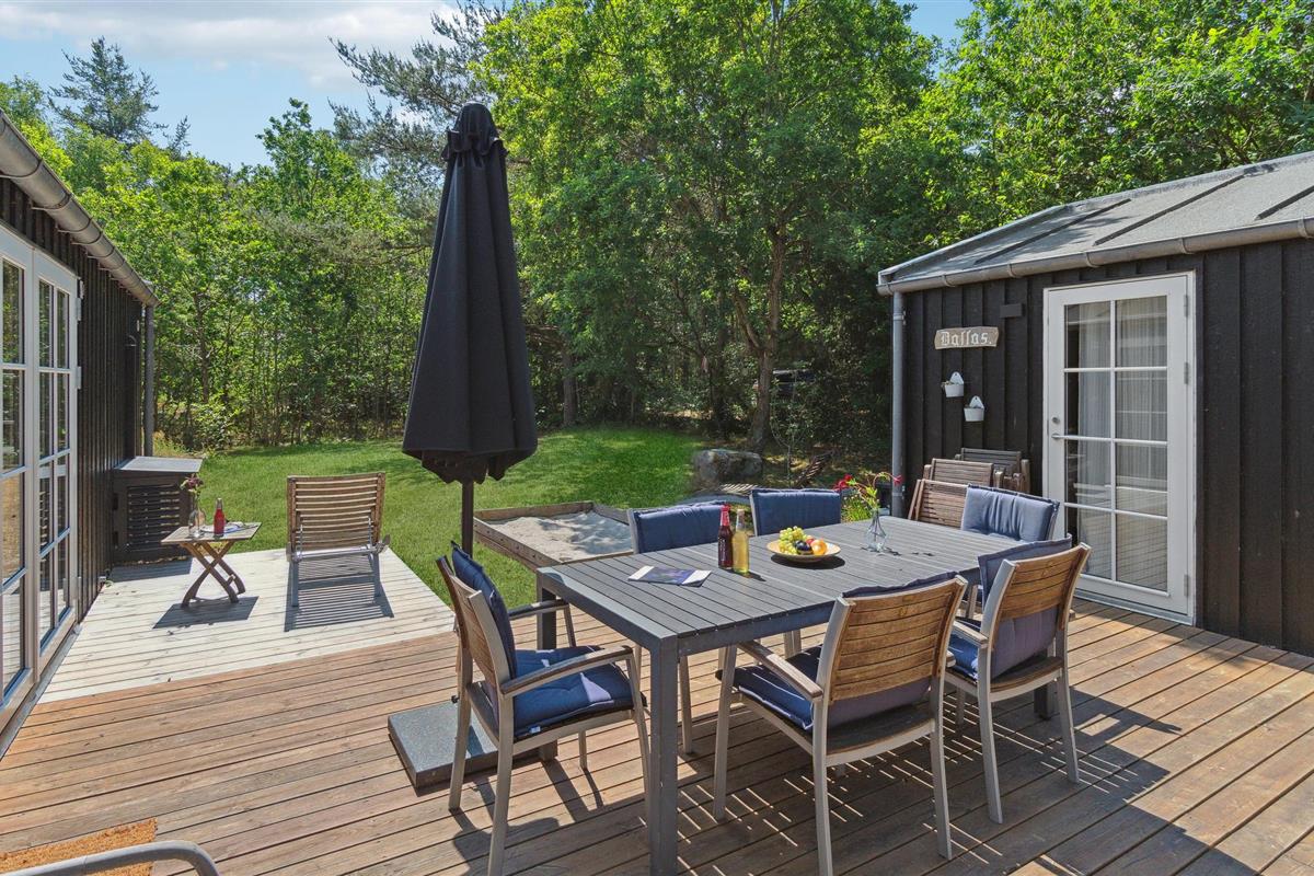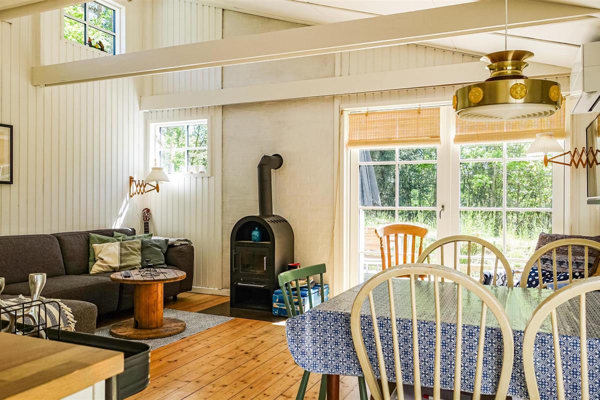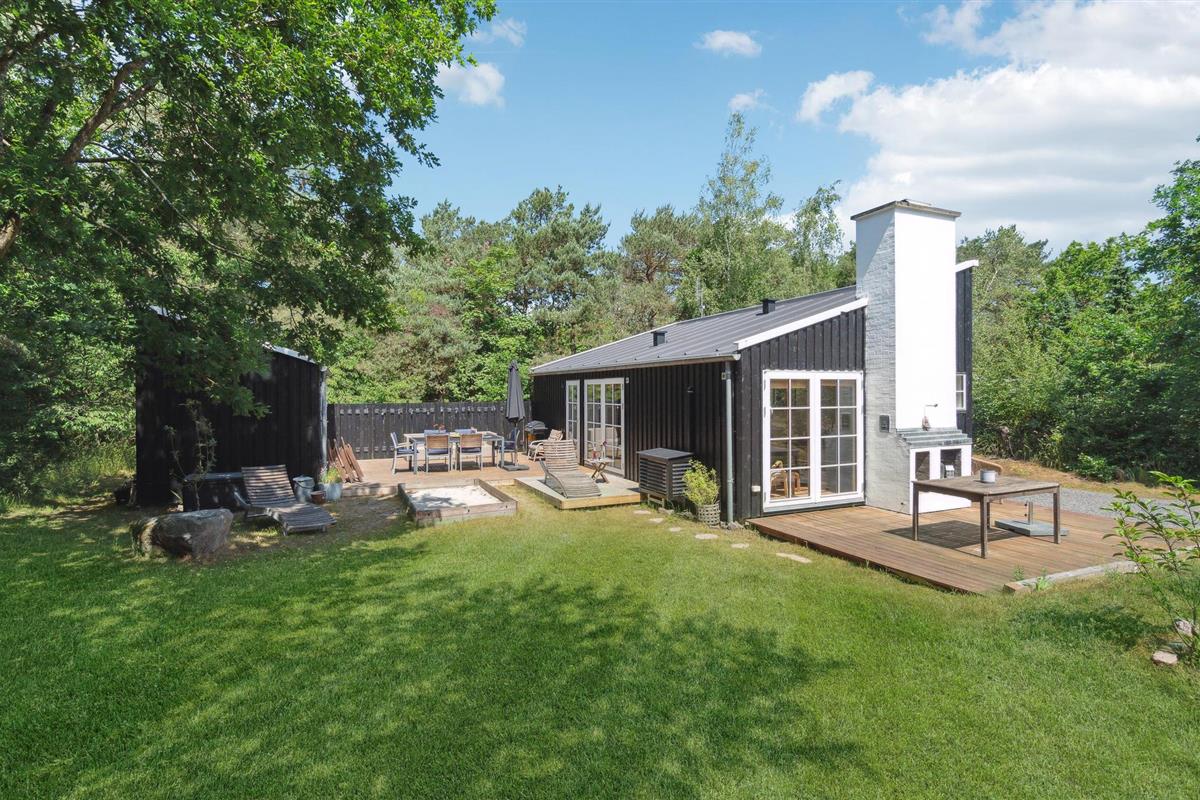 Het huis ligt afgelegen op een prachtig groot natuurgrondstuk, op slechts 600 meter van het kindvriendelijke zandstrand en de gezellige omgeving. Ontspan in de mooie woonkamer, die helemaal open is tot aan de puntgevel en vanuit vele hoeken licht binnenlaat door ramen in het plafond. Als het buiten regent en rilt, kun je knus bij de open haard zitten, en als de zon schijnt, open je gewoon de deuren en stap je het groen in. Je kunt je ook verheugen op het koken in de goed uitgeruste keuken, terwijl de rest van het huis verschillende geweldige faciliteiten heeft, waaronder een grote badkamer met spa en sauna. Naast de twee slaapkamers in het huis is er ook een loft en een bijgebouw met een tweepersoonsbed.