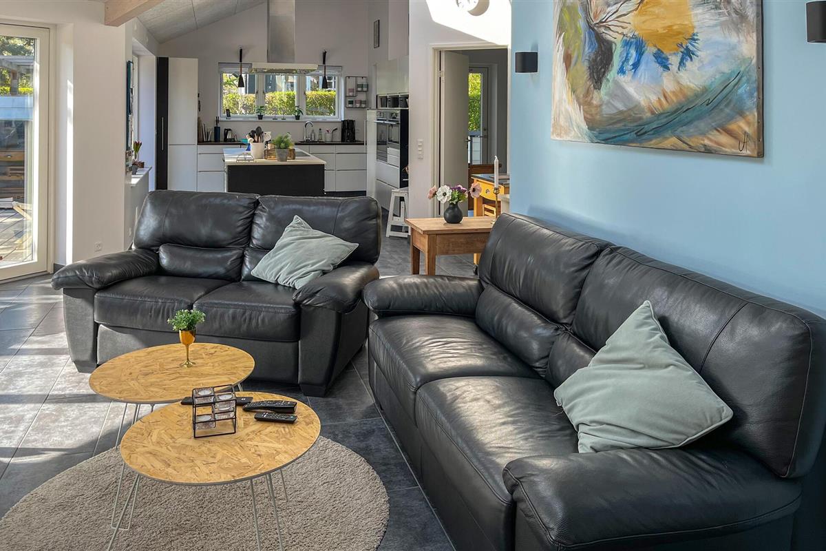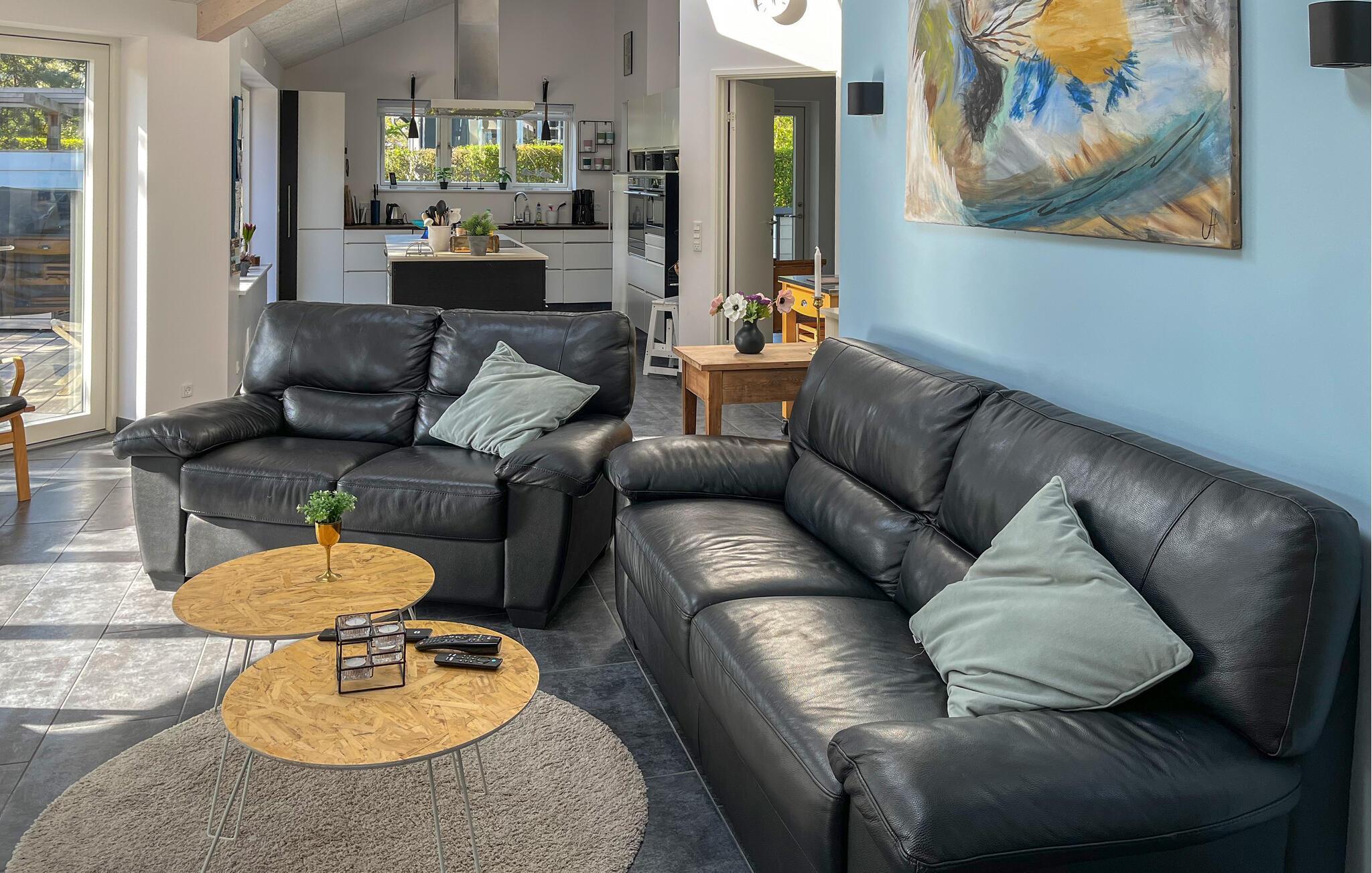 Het hele interieur is open naar de gevel en heeft vloerverwarming, wat zorgt voor een aangename sfeer. De keuken is verbonden met de grote woonkamer, zodat u rustig en zonder stress kunt koken terwijl u in de woonkamer met de kinderen kletst. Je kunt het jezelf gemakkelijk maken in de in totaal drie slaapkamers, waarvan er twee een tv hebben. Ook zijn er twee goede boxspringmatrassen op de zolder.