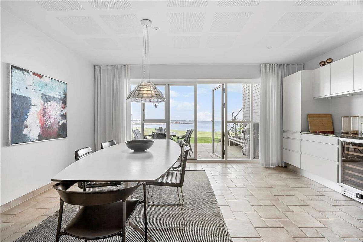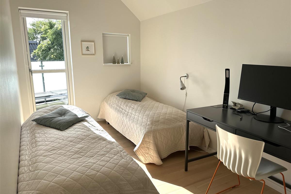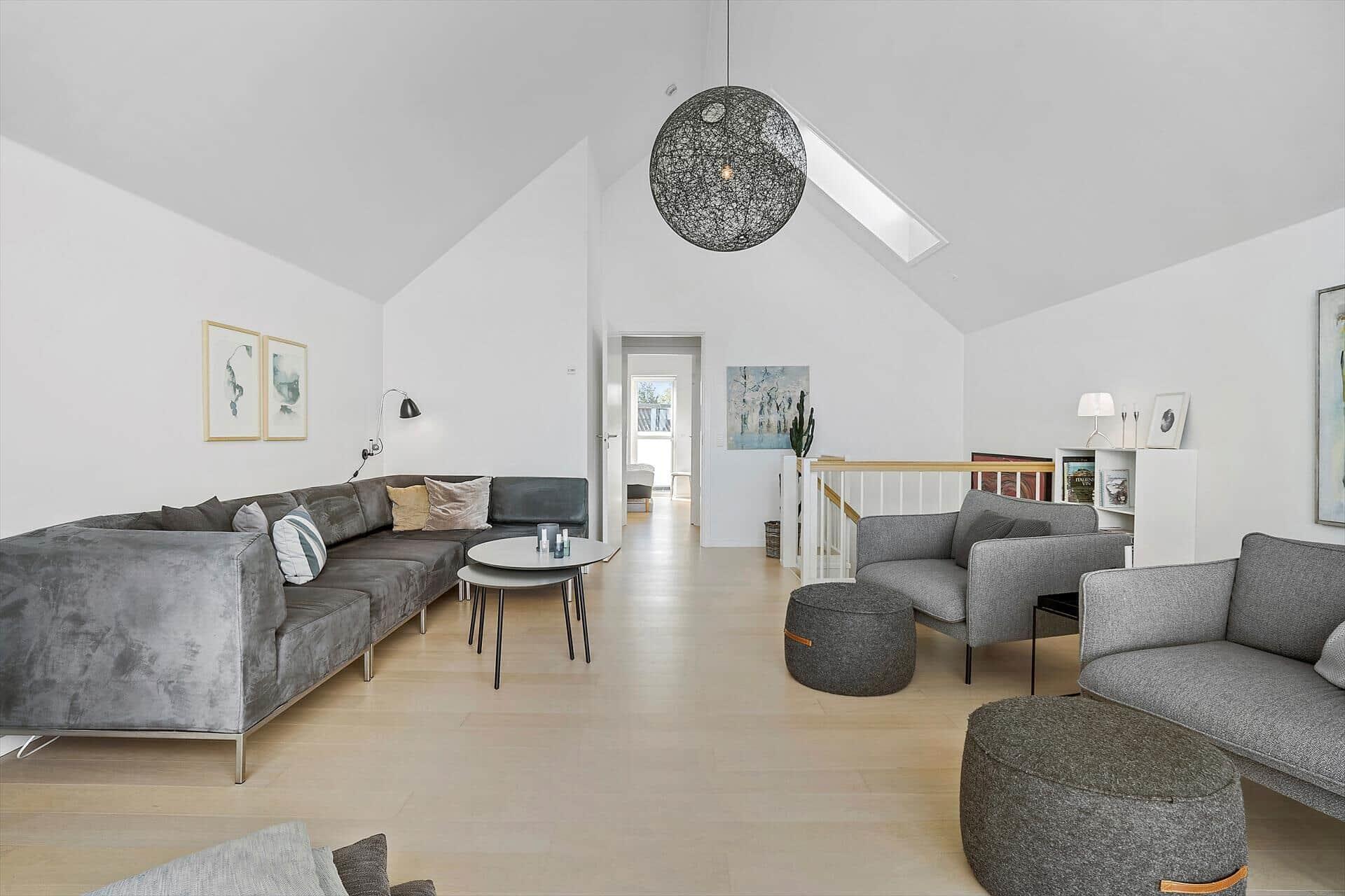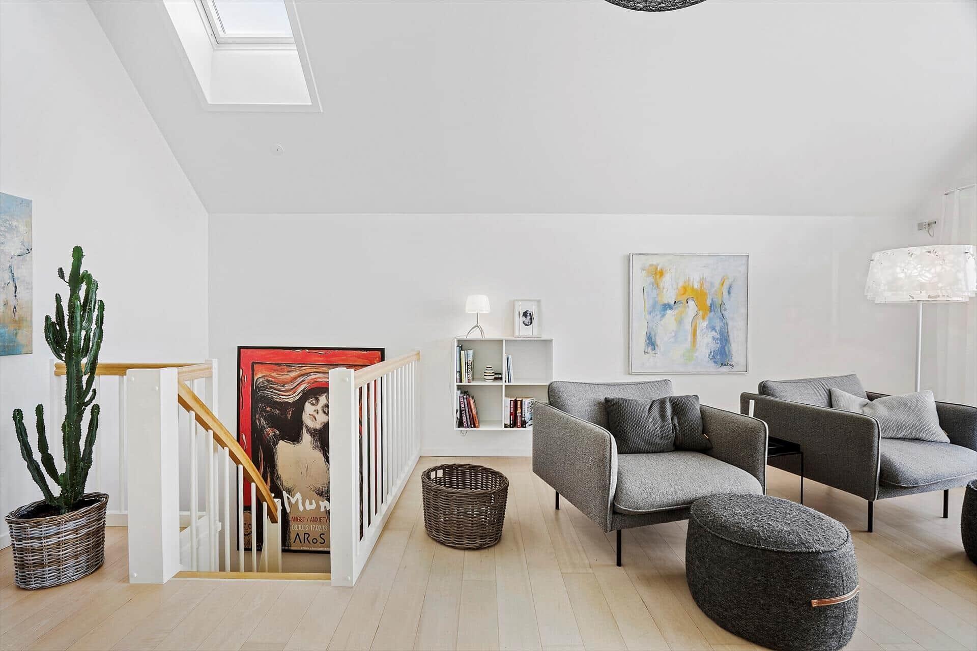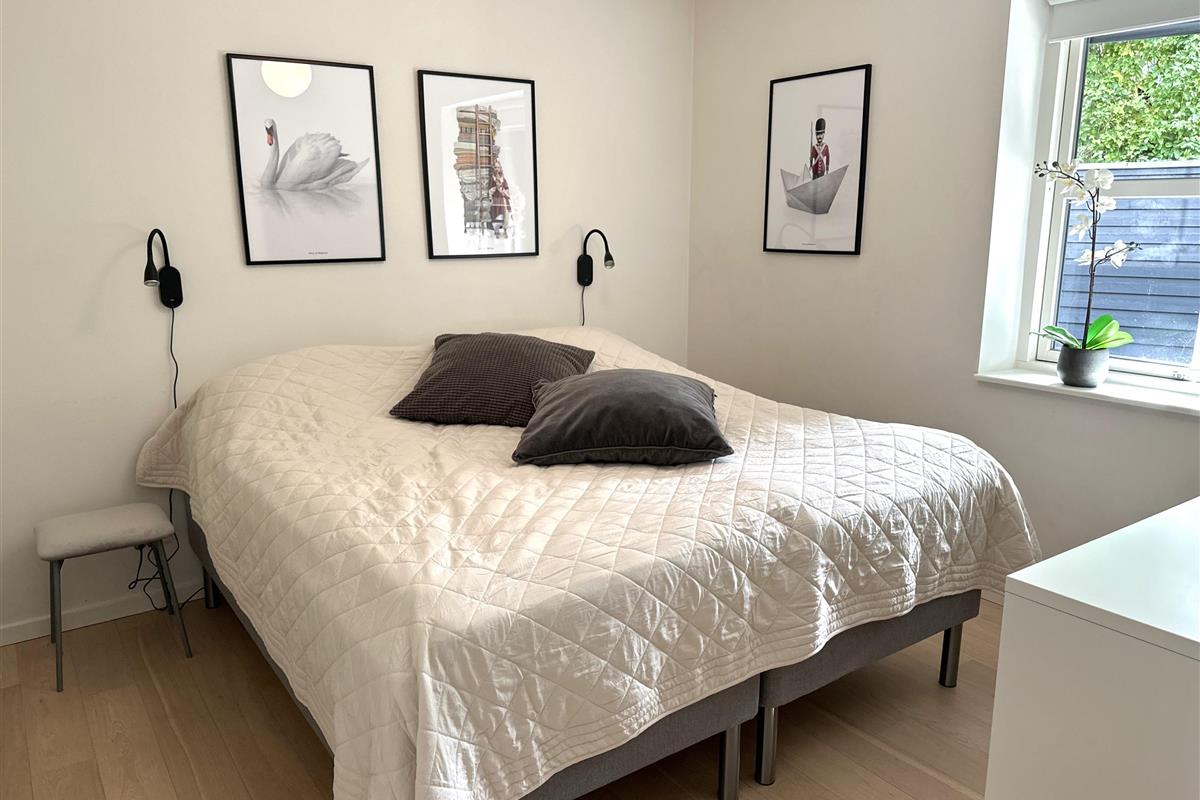 On the ground floor, you will find the entrance hall, a bedroom with a double bed and a bright bathroom, as well as a washing machine and dryer. The heart of the home is the open-plan kitchen and living room, where you will immediately be drawn to the large windows offering wonderful views of the Kattegat. Here you can cook, eat and relax with the sea in the background. Meals can be enjoyed at the dining table or on the partially covered terrace, where the sunrise and morning coffee become a very special experience.