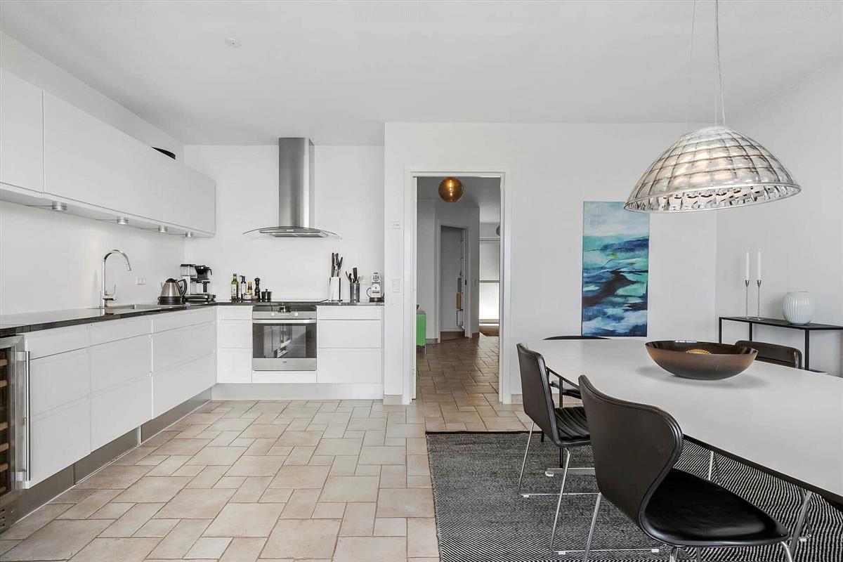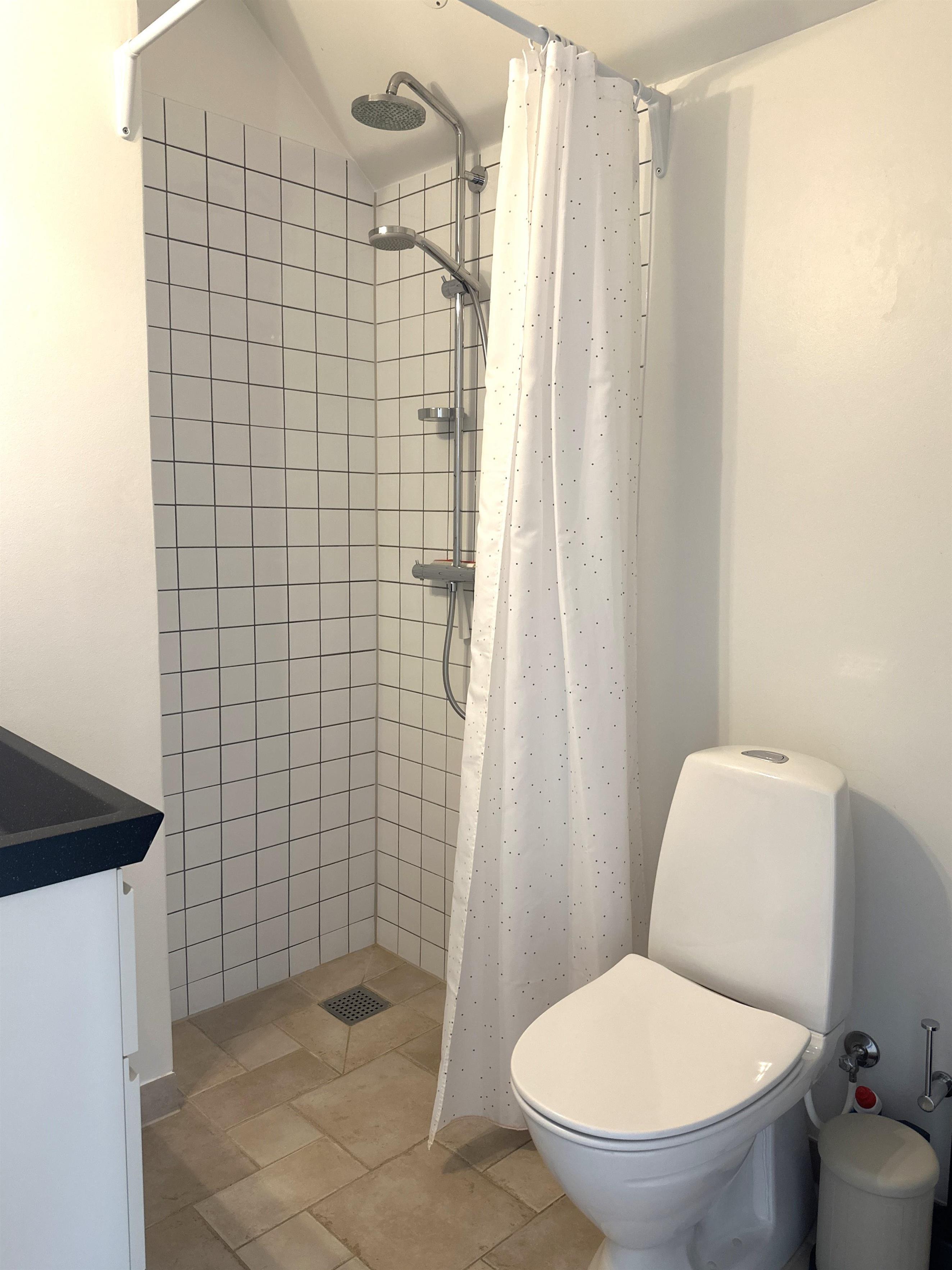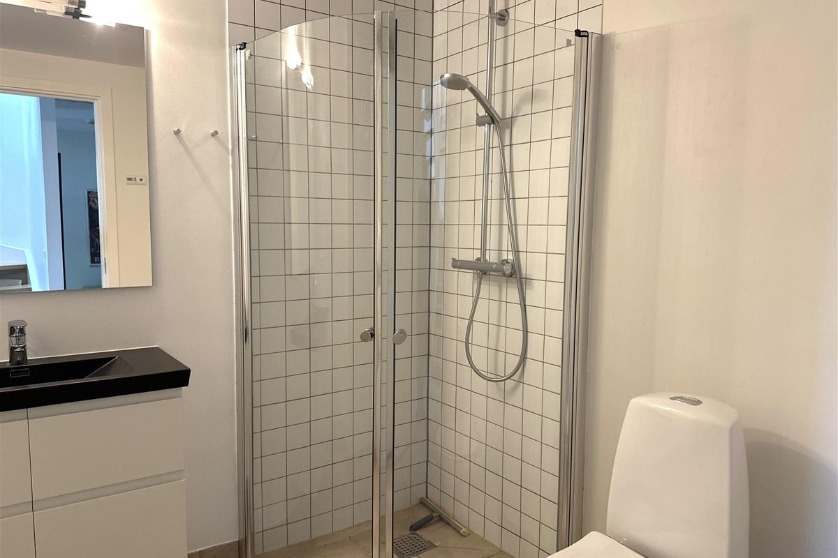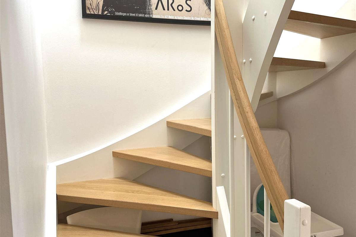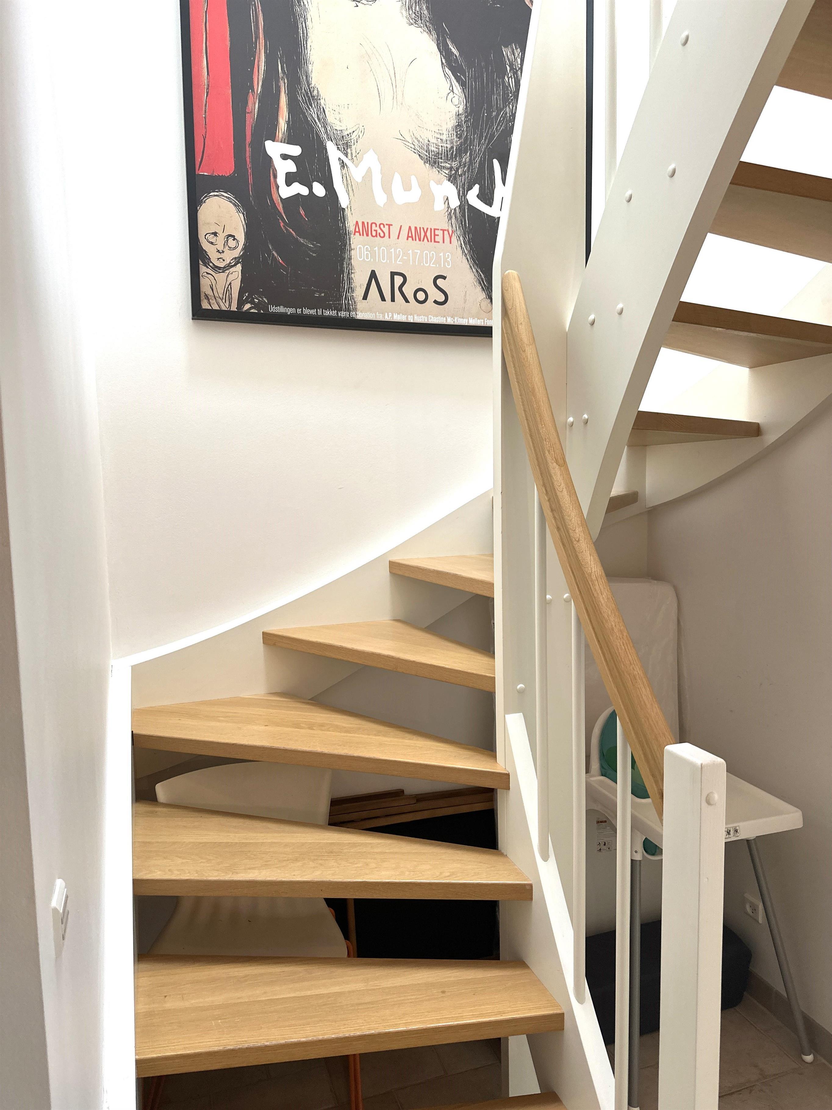 On the ground floor, you will find the entrance hall, a bedroom with a double bed and a bright bathroom, as well as a washing machine and dryer. The heart of the home is the open-plan kitchen and living room, where you will immediately be drawn to the large windows offering wonderful views of the Kattegat. Here you can cook, eat and relax with the sea in the background. Meals can be enjoyed at the dining table or on the partially covered terrace, where the sunrise and morning coffee become a very special experience.