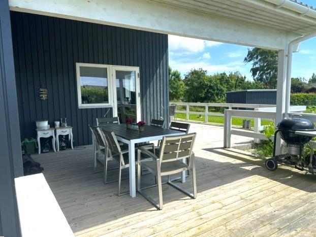The living room has direct access to a large, partially covered wooden terrace with comfortable garden furniture and a barbecue – perfect for cosy dinners and relaxed evenings under the open sky.