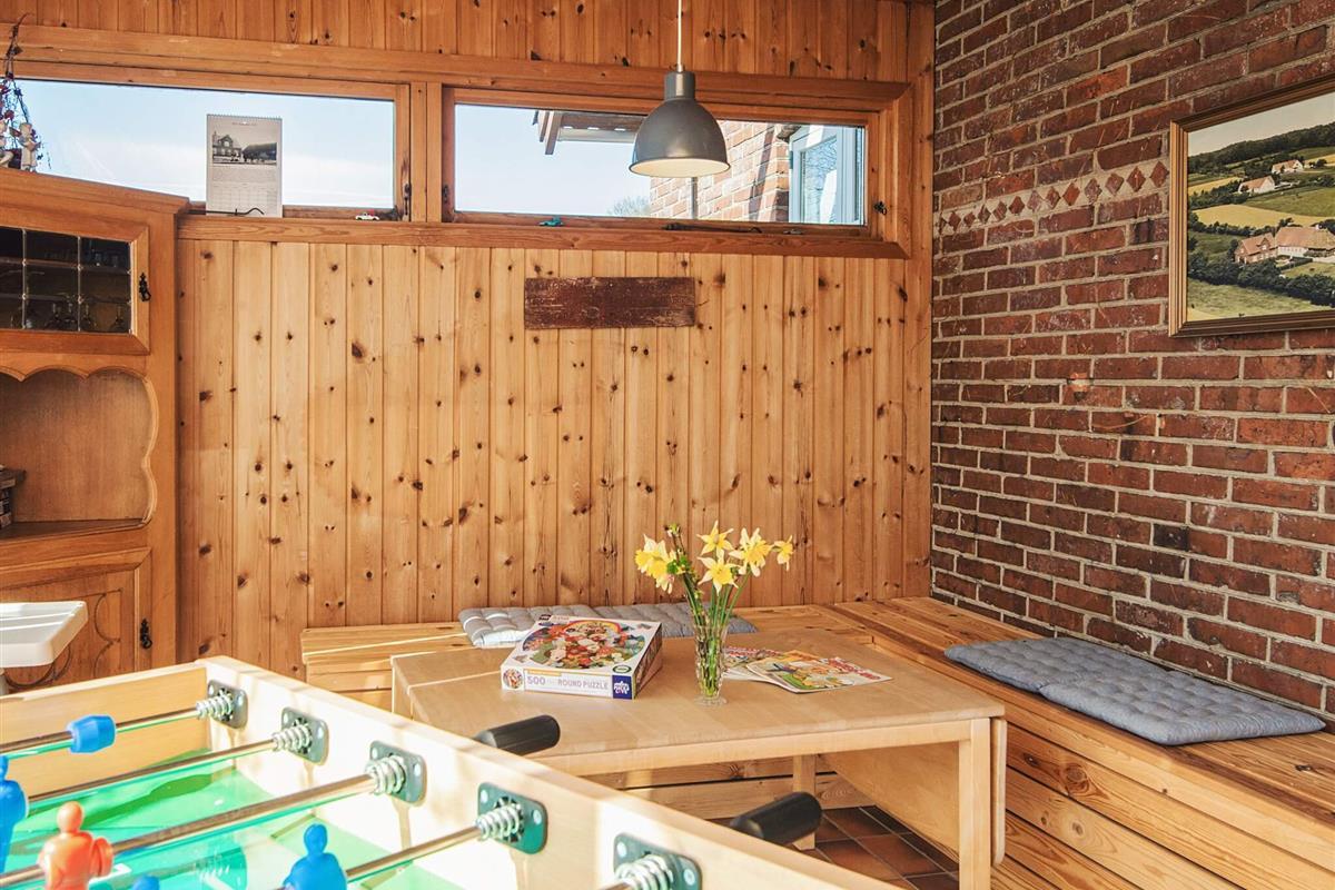 Das Erdgeschoss des Ferienhauses verfügt über eine große, helle Wohnküche mit direktem Zugang zum Wintergarten mit Freizeitraum. Hier können Sie stundenlang spielen und vergnügen.