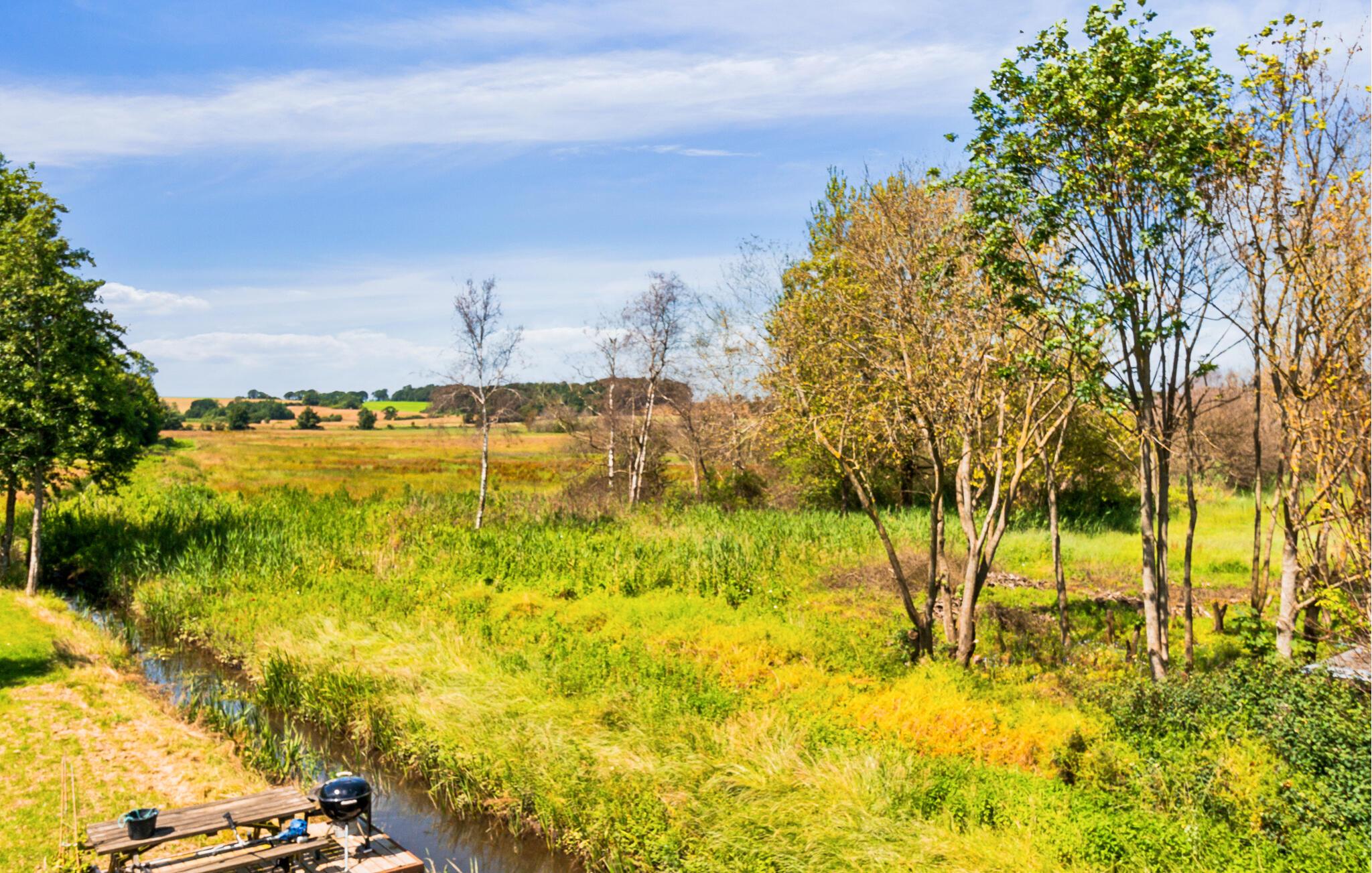 Het huis ligt ongestoord op het platteland, aan het einde van een afgesloten weg, met uitzicht op beschutte gebieden met weiden, velden en bos. Het ligt aan de rand van een groot vakantiehuizengebied, op slechts een paar meter van het strand.