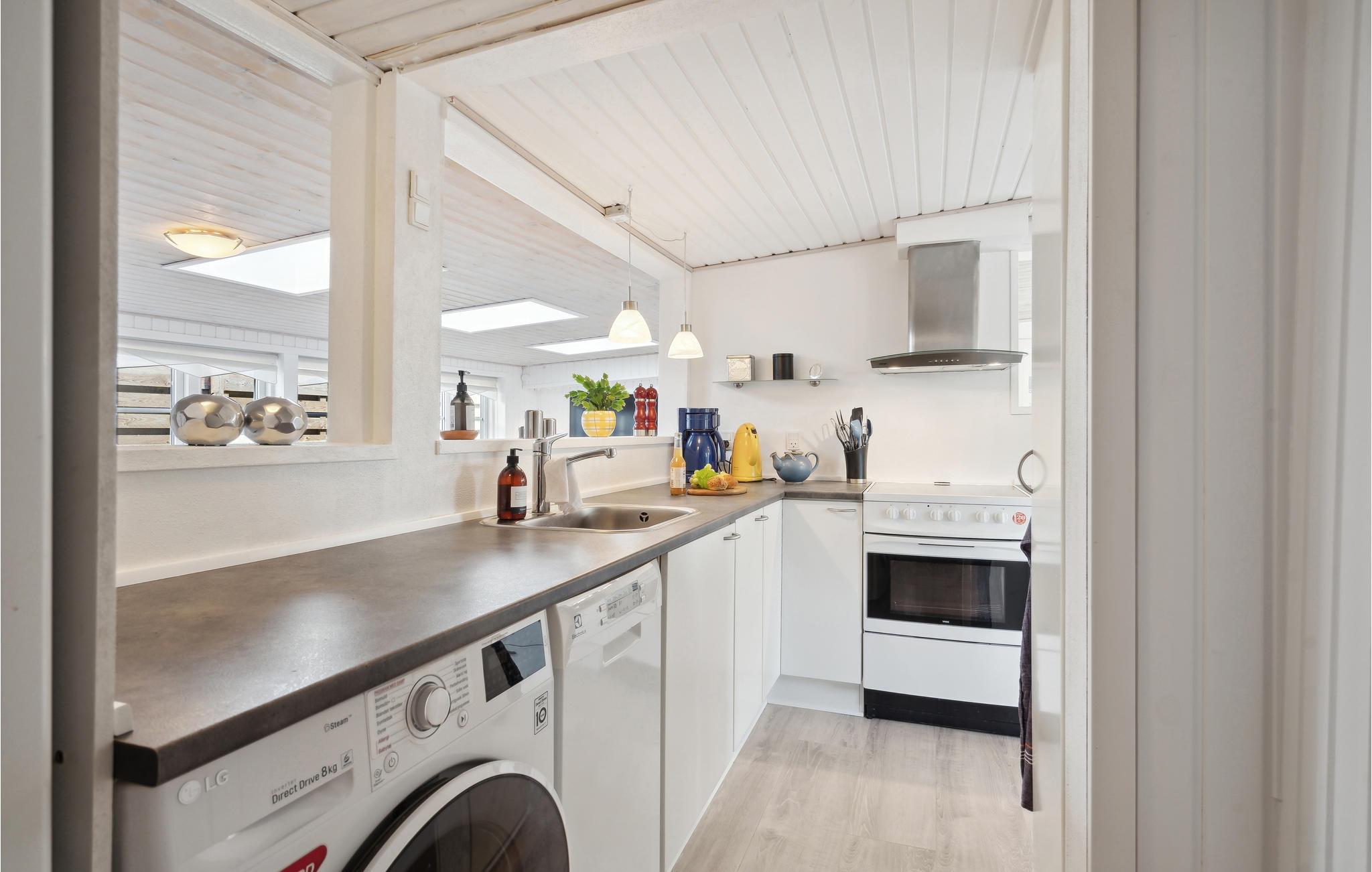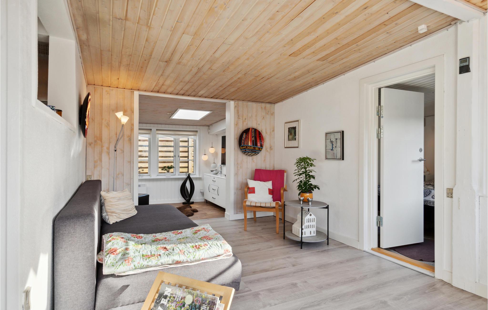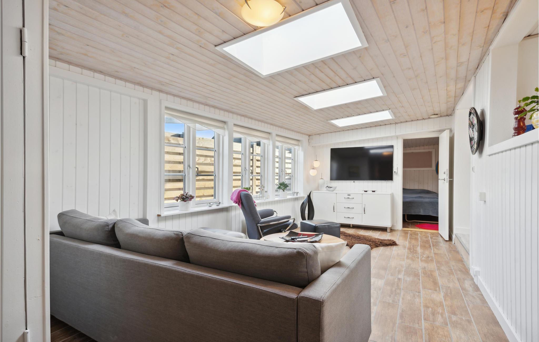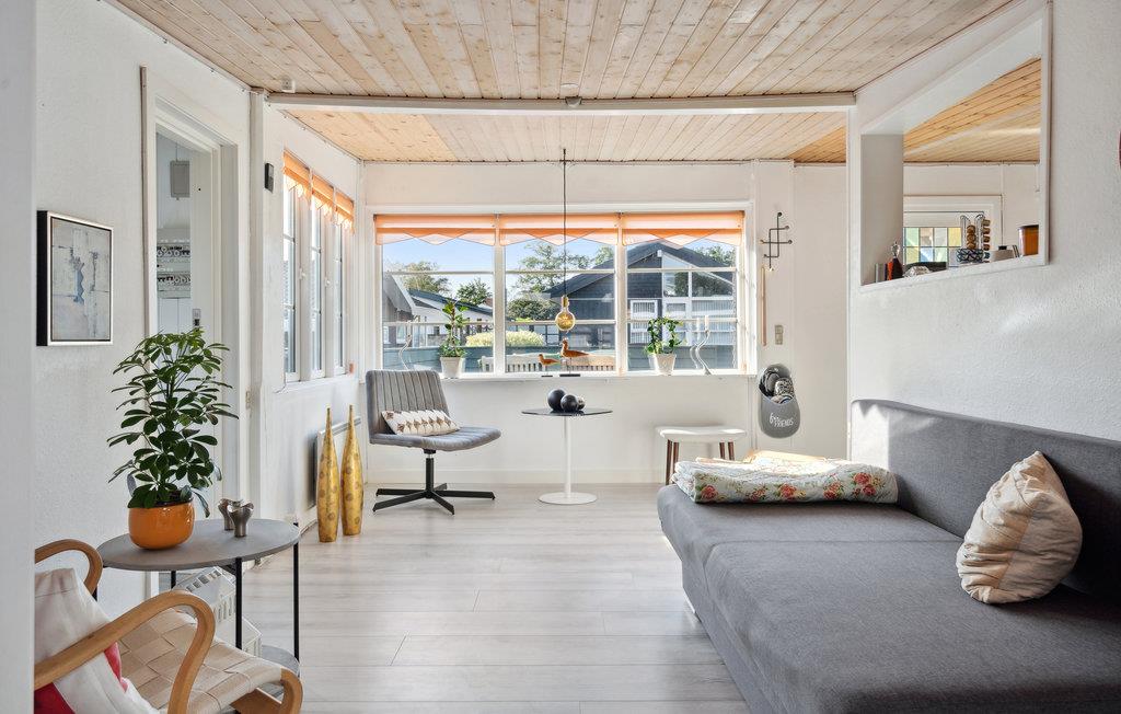 Geniet van een stijlvol vakantiehuis direct aan het strand van Binderup Strand met zeezicht en moderne voorzieningen.