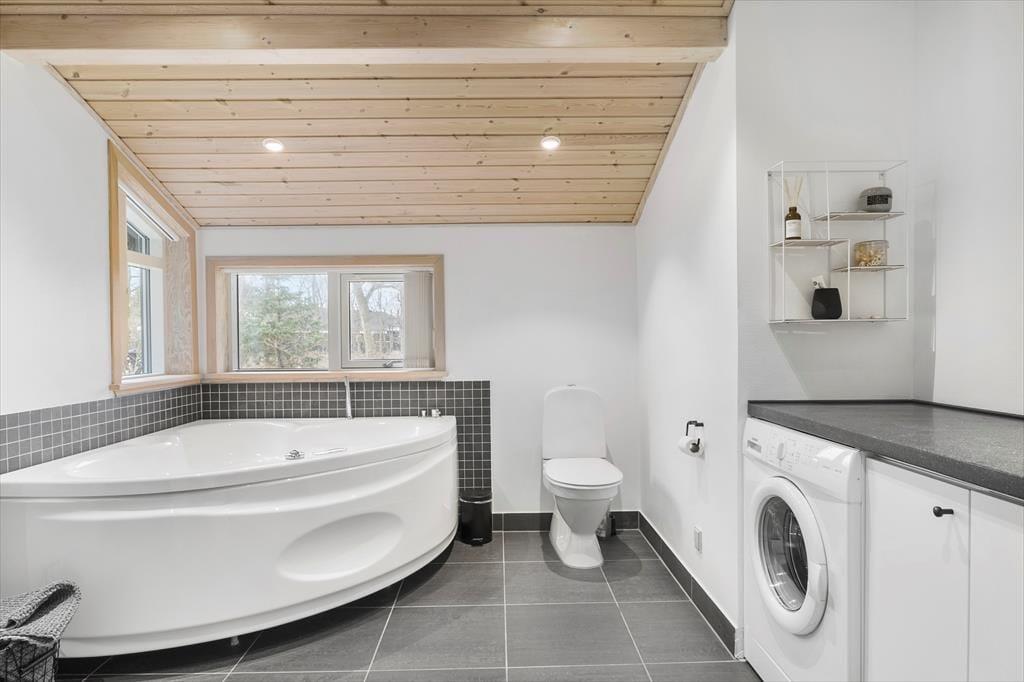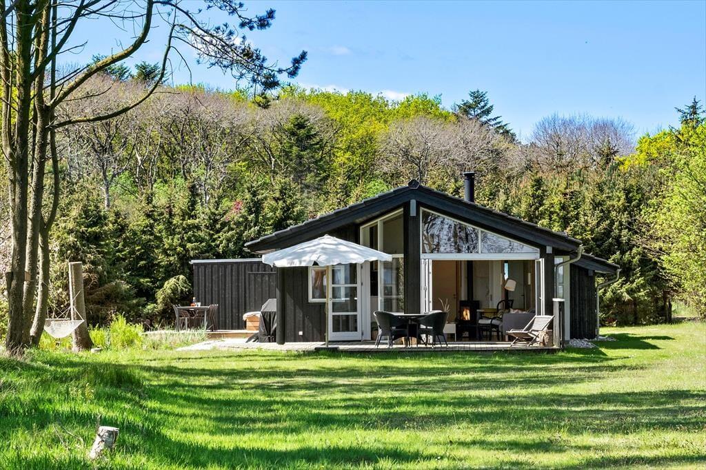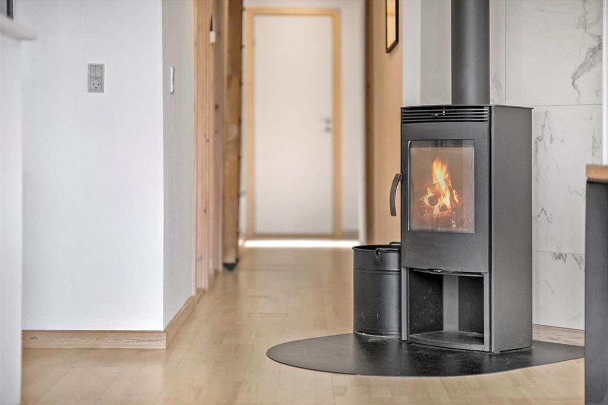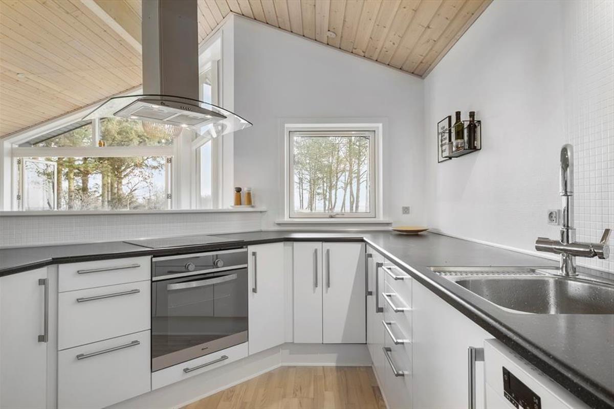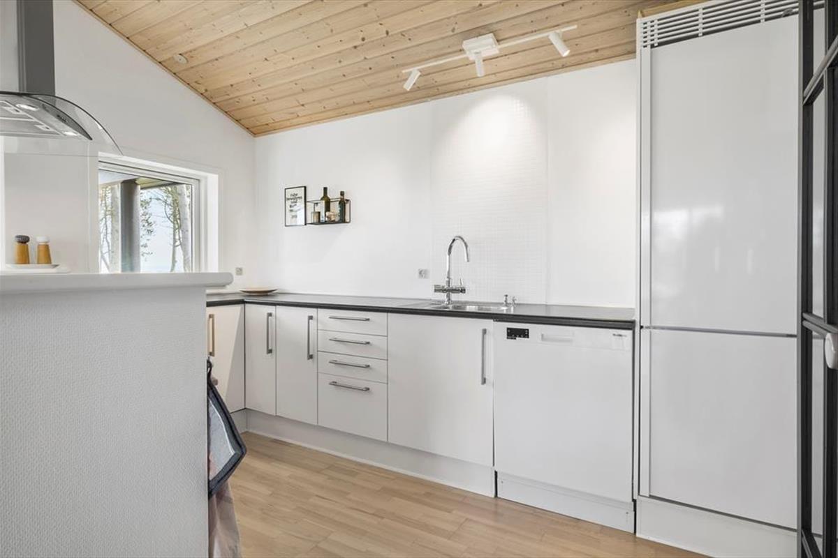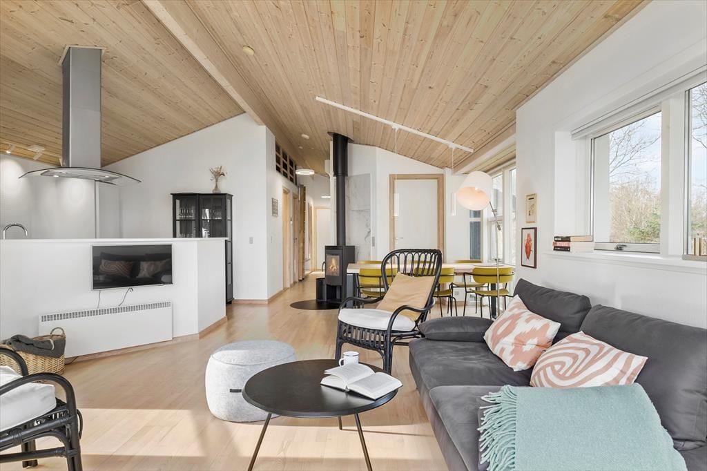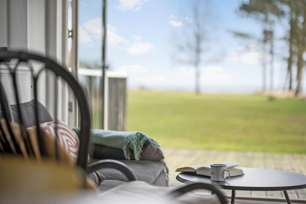 Damit der Meerblick bestmöglich zur Geltung kommt, wurde der Aufenthaltsbereich am östlichen Hausende platziert. Frühaufsteher erleben, wie die aufgehende Sonne ein wunderschönes Farbenspiel an den Himmel über dem Wasser zaubert. Später am Tag ist es einfach schön, das blaue Wasser hinter dem grünen Grundstück funkeln zu sehen. Die Giebelfenster des Wohnraums reichen von der Decke bis zu Boden und bieten Ihnen nicht nur einen reizvollen Ausblick, sondern auch einen perfekten Tageslichteinfall. Küche und Wohnraum sind offen miteinander verbunden. Der Raum besticht mit hohen Decken und lädt mit seinem Kaminofen, dem Flachbild-TV und der komfortablen Möblierung zu gemütlichen Stunden im Kreise Ihrer Lieben ein. Die drei Schlafräume bieten Platz für insgesamt fünf Personen. Der Rest der Wohnfläche ist einem Gäste-WC und einem großen Badezimmer mit Whirlpool überlassen.