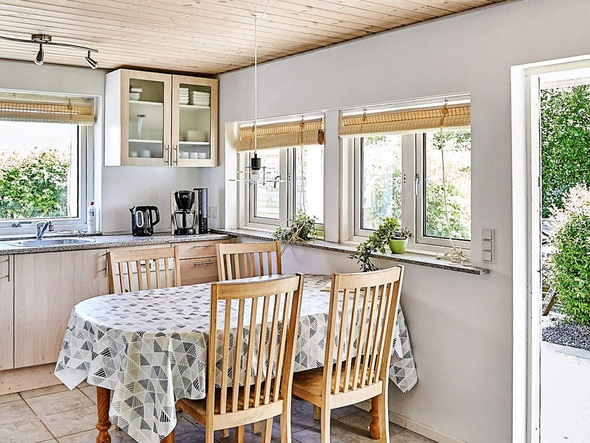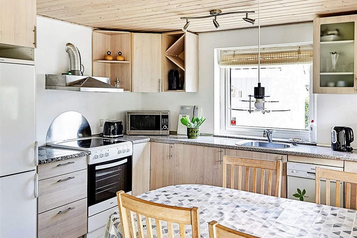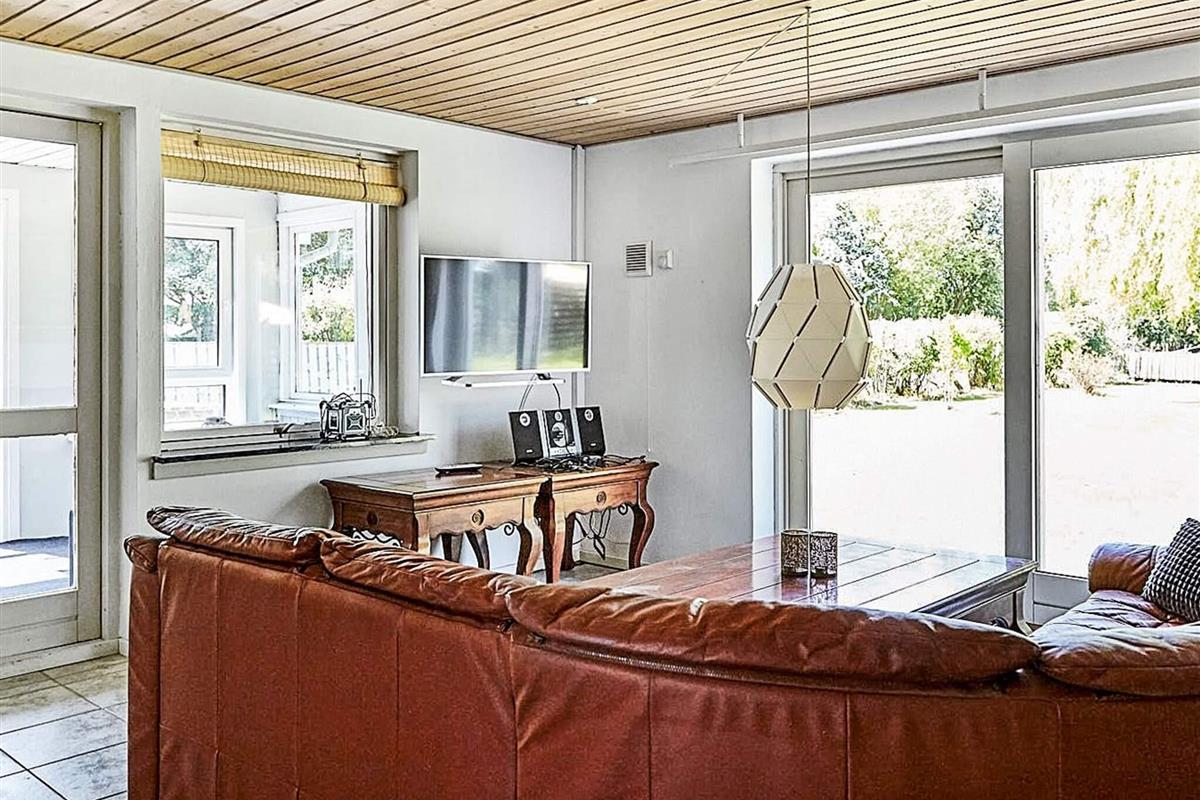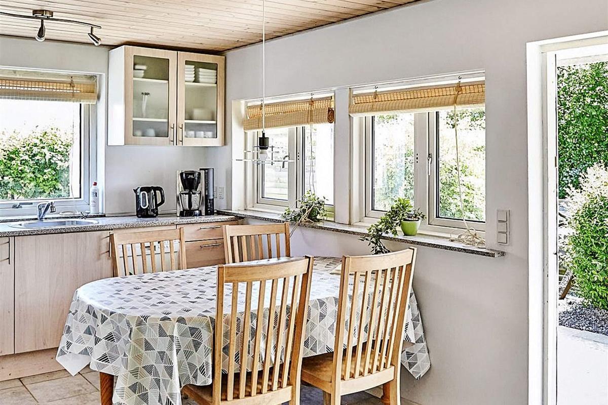 Ferienhaus in ruhiger und friedlicher Lage, fußläufig zum Meer bei Bjerge Sydstrand. Es gibt zwei Schlafzimmer, jeweils mit zwei Einzelbetten, die sich leicht zu Doppelbetten zusammenstellen lassen. Das Haus ist komplett gefliest und unter anderem mit einem Holzofen, einer Waschmaschine, einer Spülmaschine und einer Wärmepumpe ausgestattet, was es das ganze Jahr über für längere Aufenthalte geeignet macht. Großes eingezäuntes Grundstück mit einem umzäunten Teich und einer großen Rasenfläche mit Platz zum Spielen. Das Haus verfügt über einen geschlossenen Wintergarten und eine teilweise überdachte Terrasse mit Zugang von der Küche aus. Innerhalb von 10 Gehminuten befinden sich Restaurants und eine Eisdiele (in den Sommermonaten). Die Gegend ist besonders gut zum Forellenangeln geeignet. Keine Vermietung an Jugendgruppen. Das Haus ist mit einem Satelliten-Familien-TV-Paket ausgestattet, das dänische, deutsche und Kinderkanäle beinhaltet. Es gibt kein Internet im Haus.