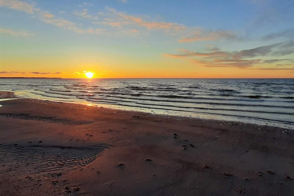 Im Ferienhaus Küche mit Fußbodenheizung, in offener Verbindung zum Ess- und Wohnbereich. Zudem stehen zwei Schlafzimmer bereit: eines mit Doppelbett, das zweite mit zwei Einzelbetten. Vom Wohnbereich aus haben Sie Zugang zur Terrasse mit Gartenmöbeln, Sonnenschirm und Grill.