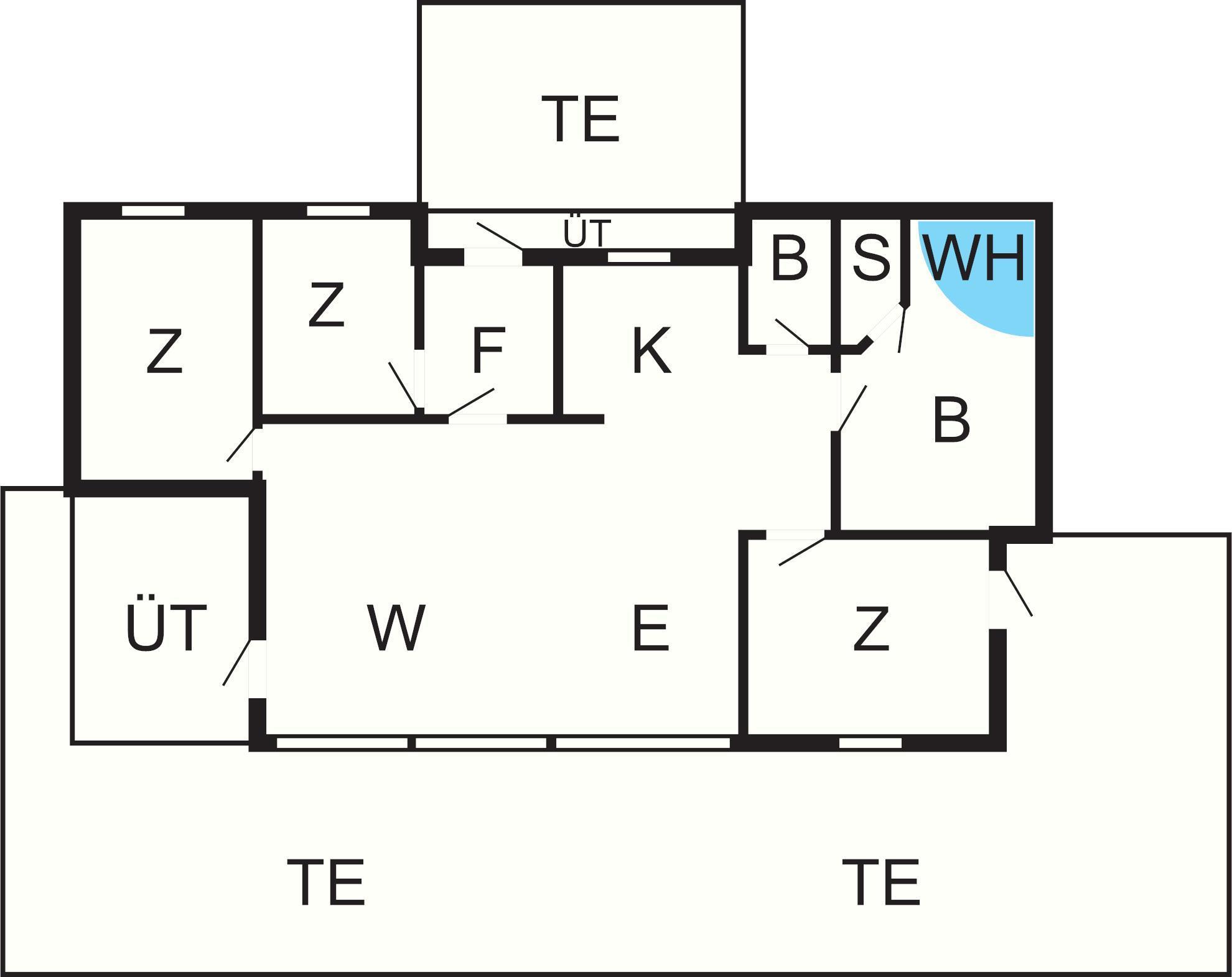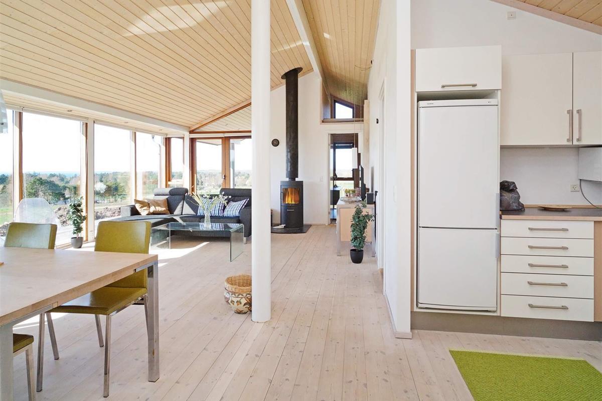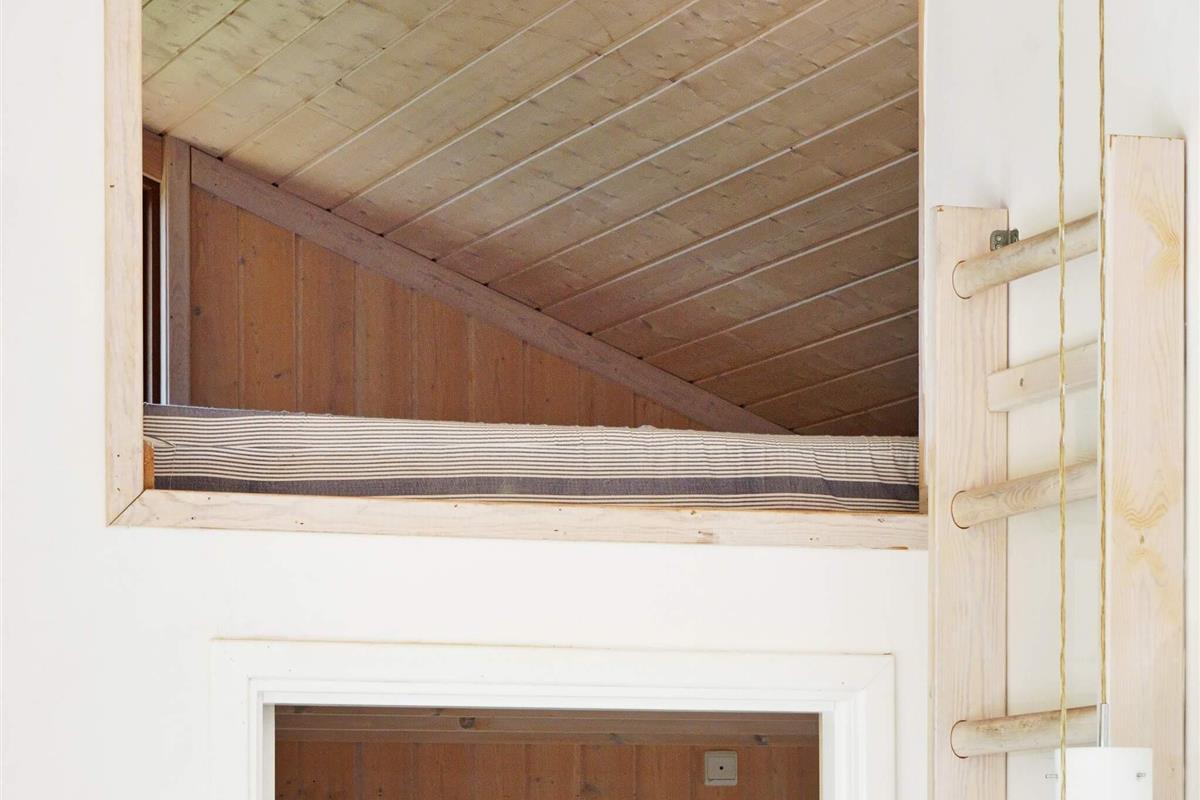 Im Inneren empfängt Sie ein funktionaler Eingangsbereich mit Platz für Mäntel und Schuhe. Von hier aus gelangen Sie in ein Schlafzimmer mit zwei Einzelbetten. Das helle Wohnzimmer verfügt über große Fenster, einen gemütlichen Holzofen und direkten Zugang zu einer 21 m² großen, überdachten Terrasse. Die offene Küche ist harmonisch in den Essbereich integriert. Vom Wohnzimmer aus erreichen Sie außerdem ein Doppelzimmer. Ein zweites Doppelzimmer mit eigenem Terrassenzugang befindet sich im Flur. Ein kleiner Dachboden (Hems) mit zwei zusätzlichen Schlafplätzen bietet zusätzlichen Platz, insbesondere für Kinder.