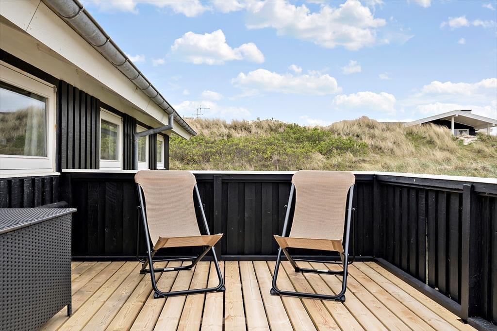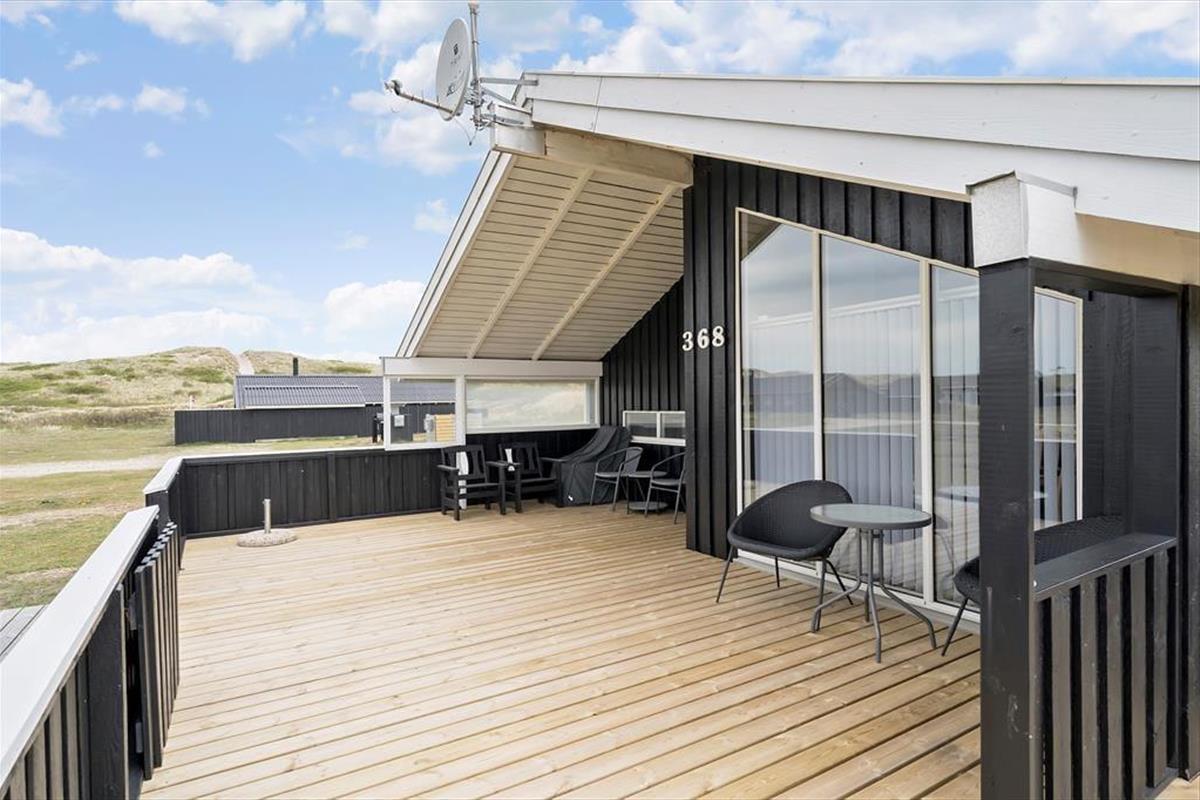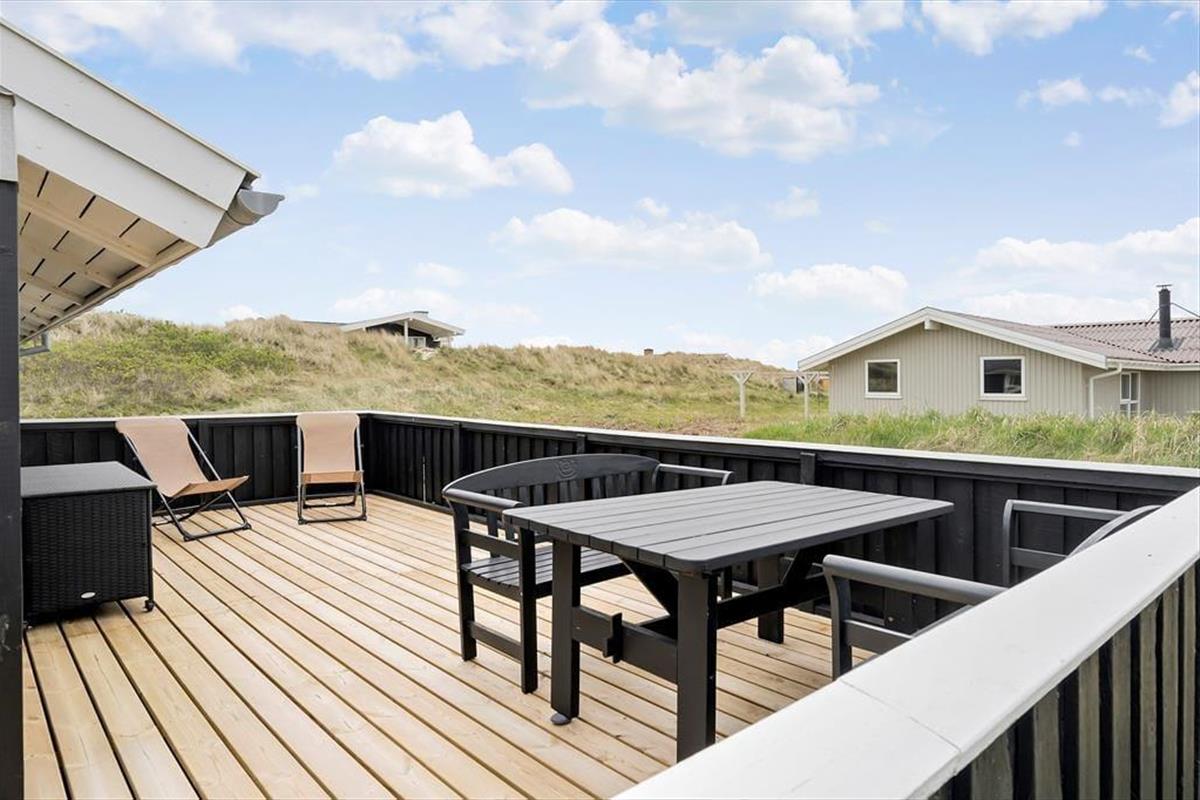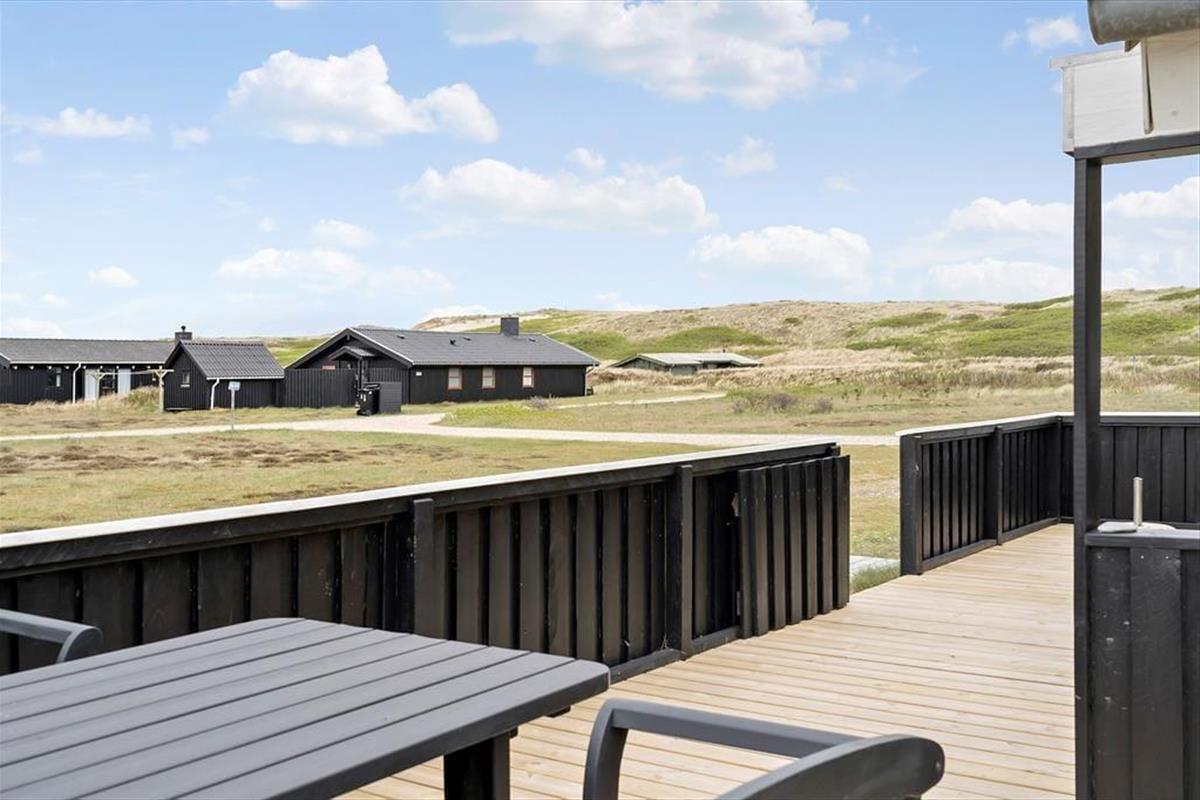 Bei schönem Wetter werden Sie viel Zeit auf der nach Süden ausgerichteten Holzterrasse verleben. Gartenmöbel und ein Grill laden zu entspannten Stunden ein. Die Terrasse ist komplett umschlossen und teilweise überdacht. Die Windschutzwand an der Westseite bietet guten Schutz vor dem frischen Wind der Nordsee. Sie wohnen in der zweiten Häuserreihe vor den Dünen und genießen daher einen reizvollen Ausblick auf die hügelige Dünenlandschaft. Ihren Pkw können Sie im hauseigenen Carport abstellen. Das 1.204 m² große Grundstück lädt zu Ballspielen und zum Umhertollen ein.