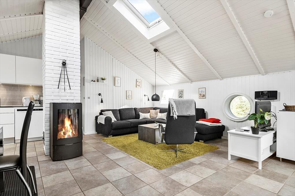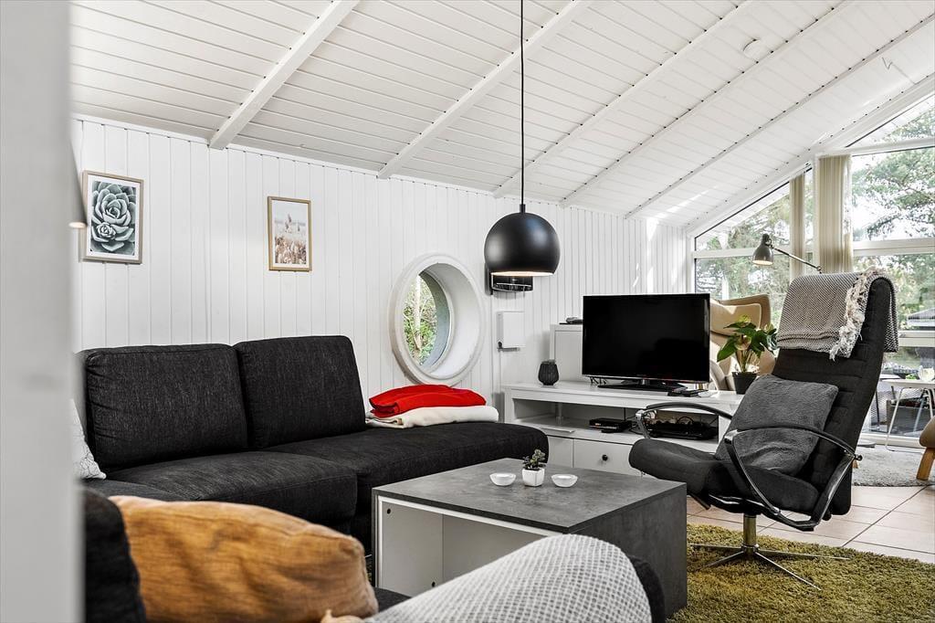 Von der Straße aus ist das Haus kaum zu sehen, da das Naturgrundstück von hohen Bäumen abgeschirmt wird. Von der Einfahrt aus führt eine Treppe zum Haus hinauf. Im Inneren empfängt Sie eine schöne, helle und freundliche Atmosphäre. Die moderne Küche ist mit dem Wohnzimmer verbunden, wo man es sich in der Sofaecke oder am Esstisch neben dem Kaminofen gemütlich machen kann. Das Badezimmer ist mit einer Sauna ausgestattet, falls Sie den Nachmittag mit Wellness verbringen möchten. Oder Sie setzen sich in den Wintergarten und genießen die Sonne und die Aussicht auf die Umgebung. Neigt sich der Tag dem Ende entgegen, können Sie sich auf einen langen und erholsamen Schlaf in den drei Schlafzimmern des Ferienhauses freuen.