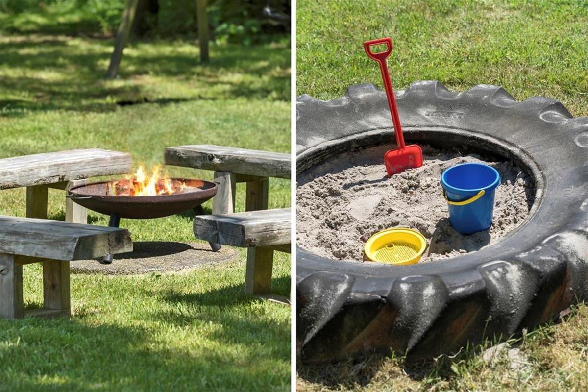 Entspannt und erholsam geht es im Garten zu. Rund ums Haus erstrecken sich mehrere sonnenverwöhnte Terrassenareale. Allabendlich lädt die Feuerstelle zum Rösten von Stockbroten und zu geselligen Momenten ein. Ihre Kinder werden sich sehr über die Schaukel, die Sandkiste und das Fußballtor freuen. Dank der vielen Bäume und Büsche ist das Grundstück sehr gut abgeschirmt.
