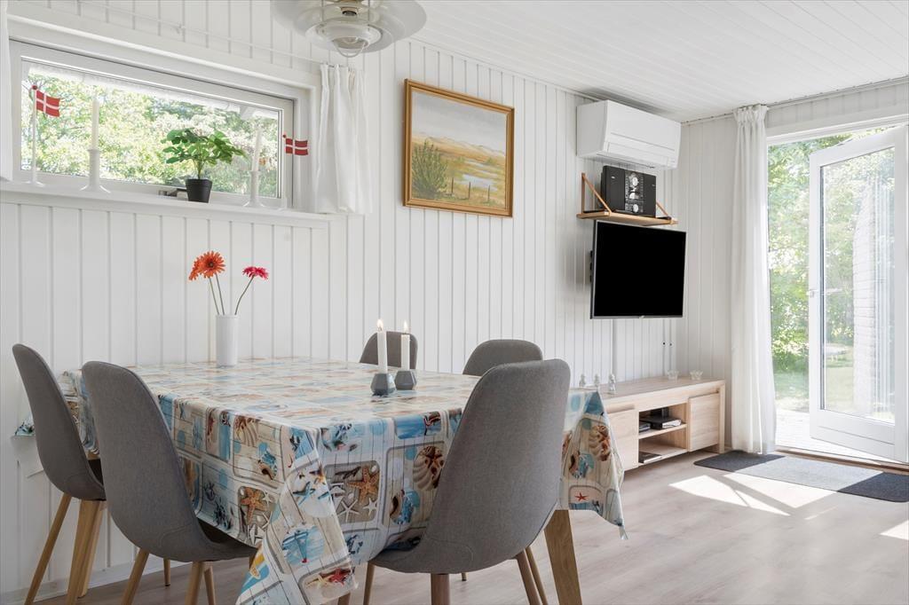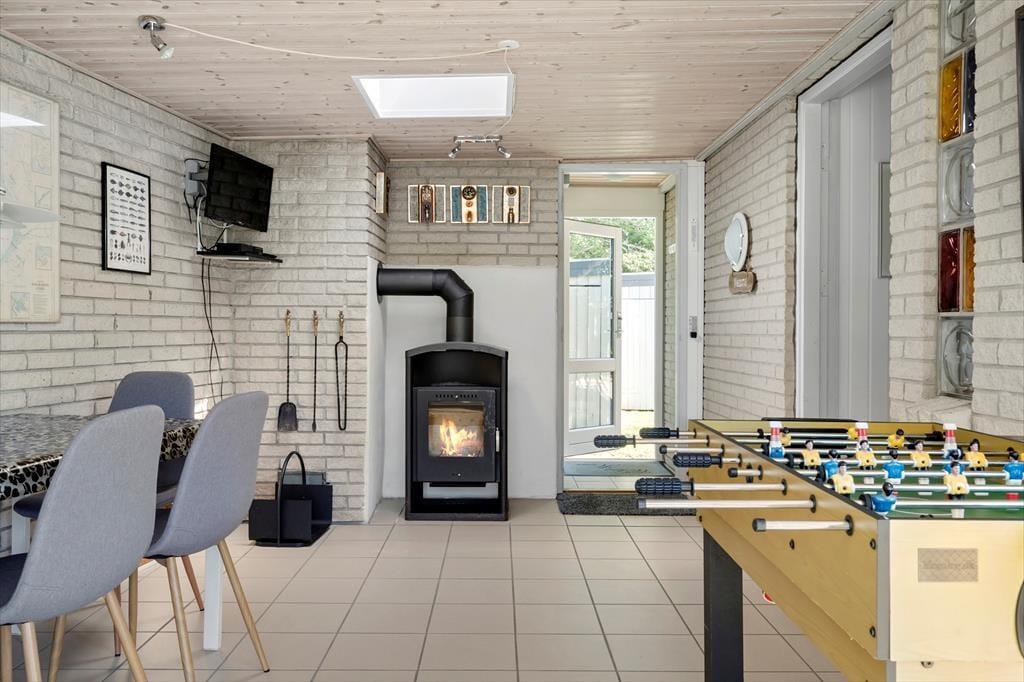 .Ganz gleich, ob Sie vollkommen entspannen oder spielen und Spaß haben möchten, Sie können sich auf die Tage im Bjerregårdsvej 12 freuen. Wenn Sie es ruhig angehen lassen möchten, bietet sich das Wohnzimmer an, denn hier können Sie stundenlang im Sofabereich faulenzen – eventuell mit einer kleinen Pause am Esstisch, um zu Mittag zu essen oder Spiele zu spielen. Die Küche steht in offener Verbindung zum Wohnzimmer und am anderen Ende des Hauses finden Sie einen lustigen Aktivitätsraum, in dem Sie sich beim Tischfußball und Darts vergnügen können und an dem ein Spieltisch mit 7 verschiedenen Spielen steht. Sowohl das Wohnzimmer als auch der Aktivitätsraum sind mit einem Holzofen ausgestattet und es gibt auch zwei Fernseher, falls es zu Streit um die Fernbedienung kommt. Ein Duschbad und eine Waschküche gehören zur Ausstattung, und in den beiden Schlafzimmern, in denen neue Betten stehen, finden fünf Personen Platz.