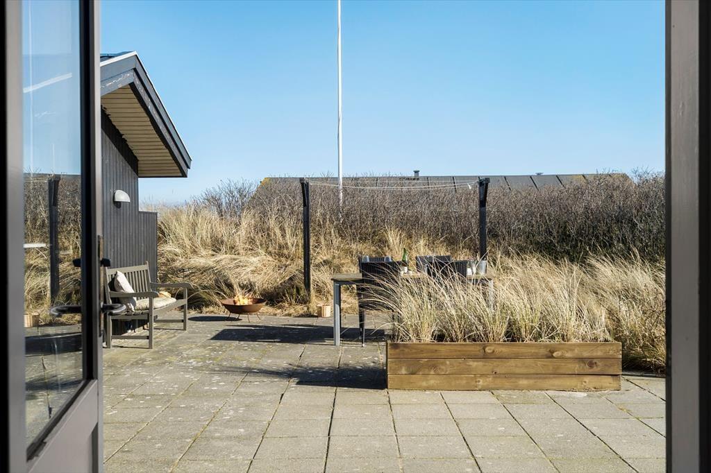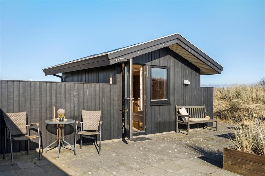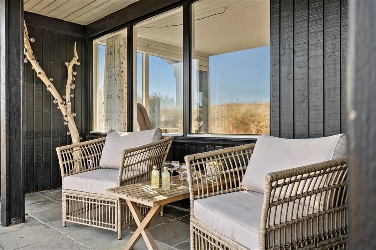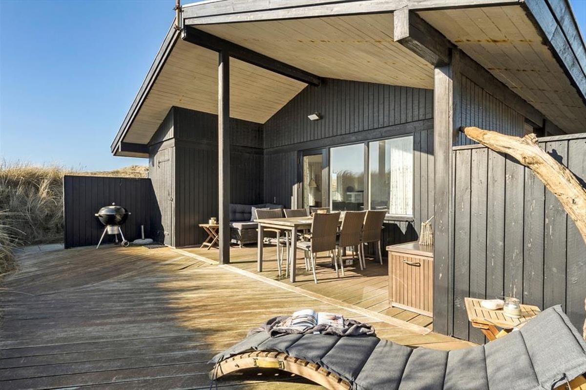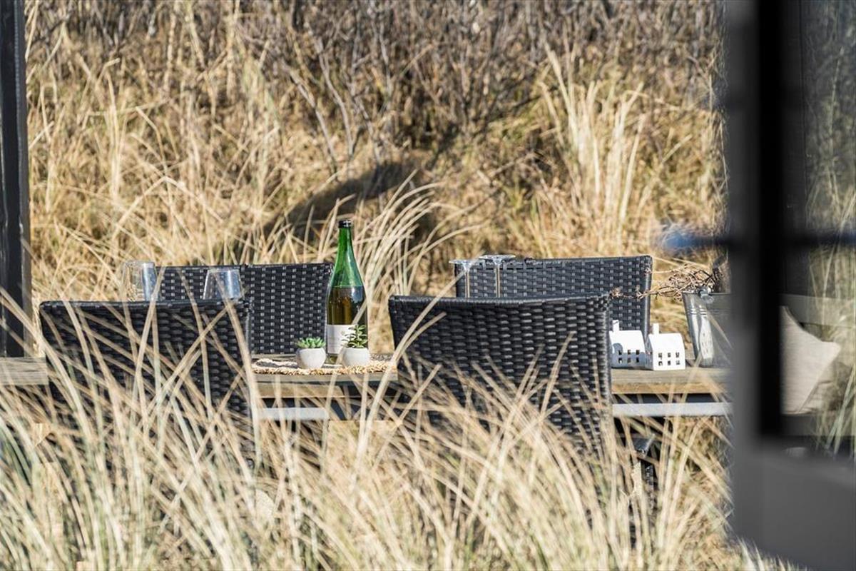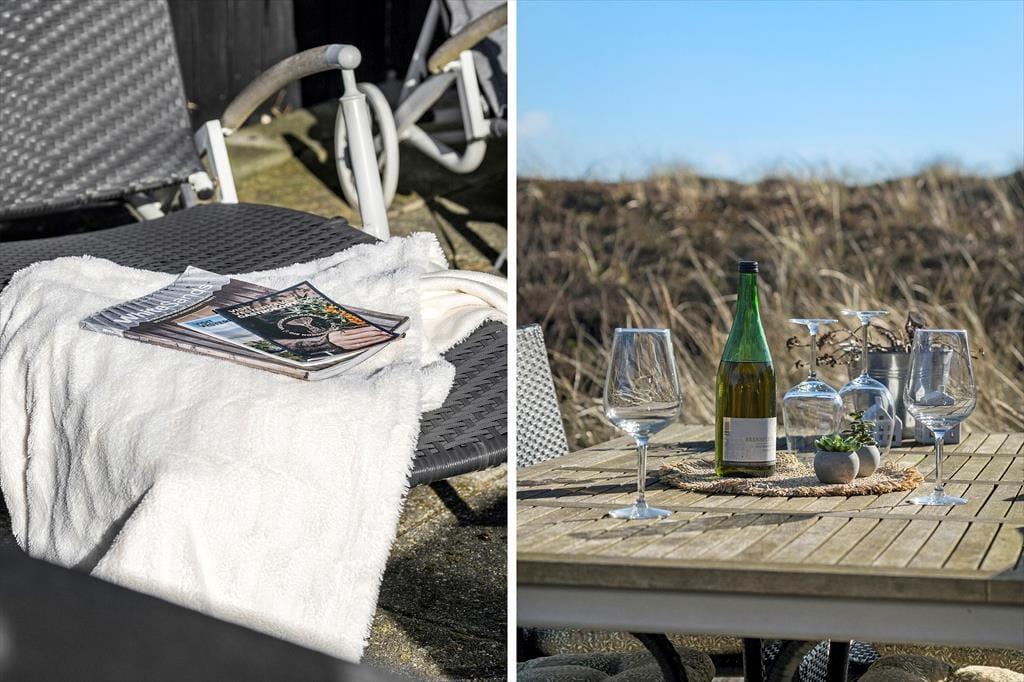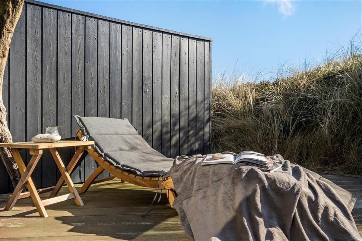 Draußen kannst du die Urlaubsstimmung wirklich spüren. Die große, teilweise überdachte Terrasse ist perfekt für lange Mahlzeiten in guter Gesellschaft an der frischen Luft. Möchtest du in der Sonne liegen, gibt es reichlich Platz, um auf den bereitstehenden Liegestühlen zu relaxen. Die Terrasse bietet südöstliche Ausrichtung – du kannst den ganzen Tag die Sonne genießen, während eine leichte Brise vom Meer die perfekte Atmosphäre schafft. Nach einem Tag am Strand ist es herrlich, den Körper in der Sauna entspannen zu lassen oder ein Grillabend unter freiem Himmel zu genießen. Und wie gesagt, dein Hund darf dabei seien - er kann auf der Terrasse frei herumlaufen und du kannst dich schön entspannen.