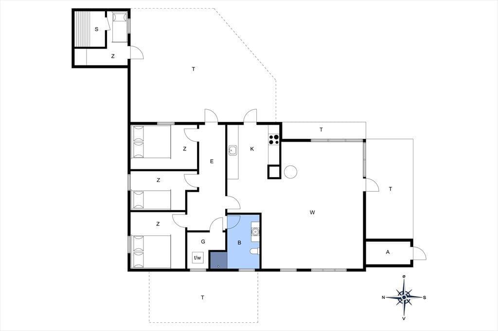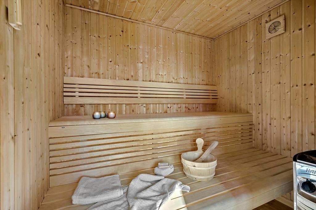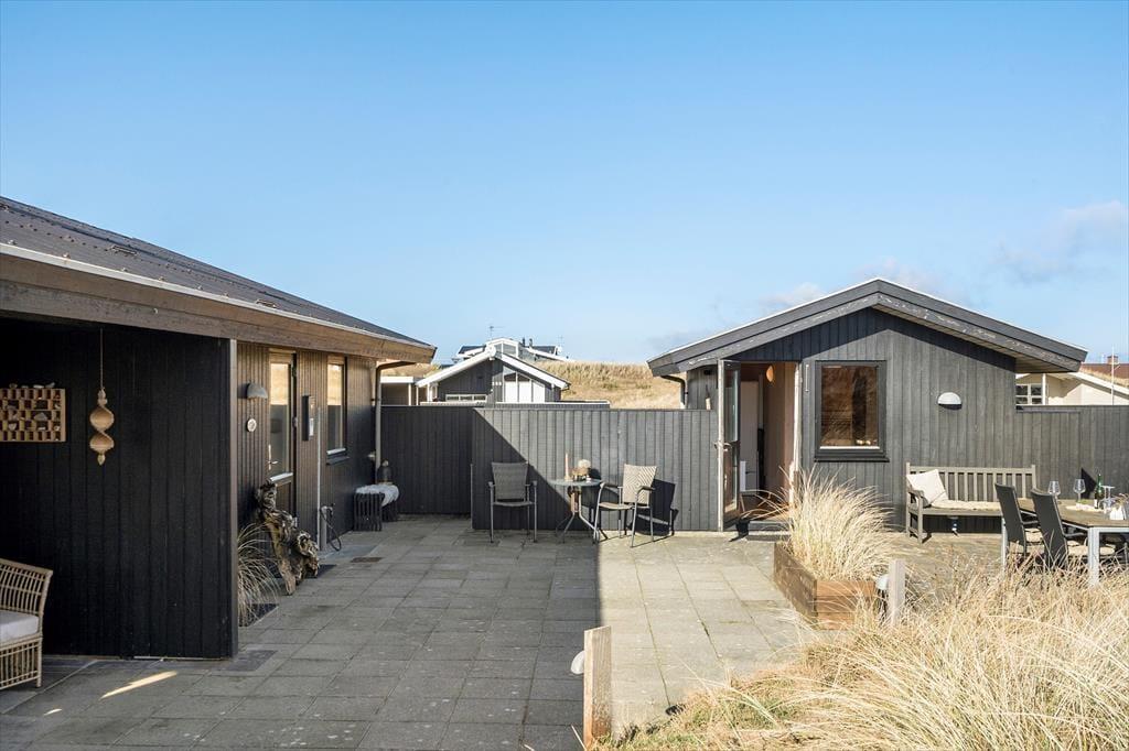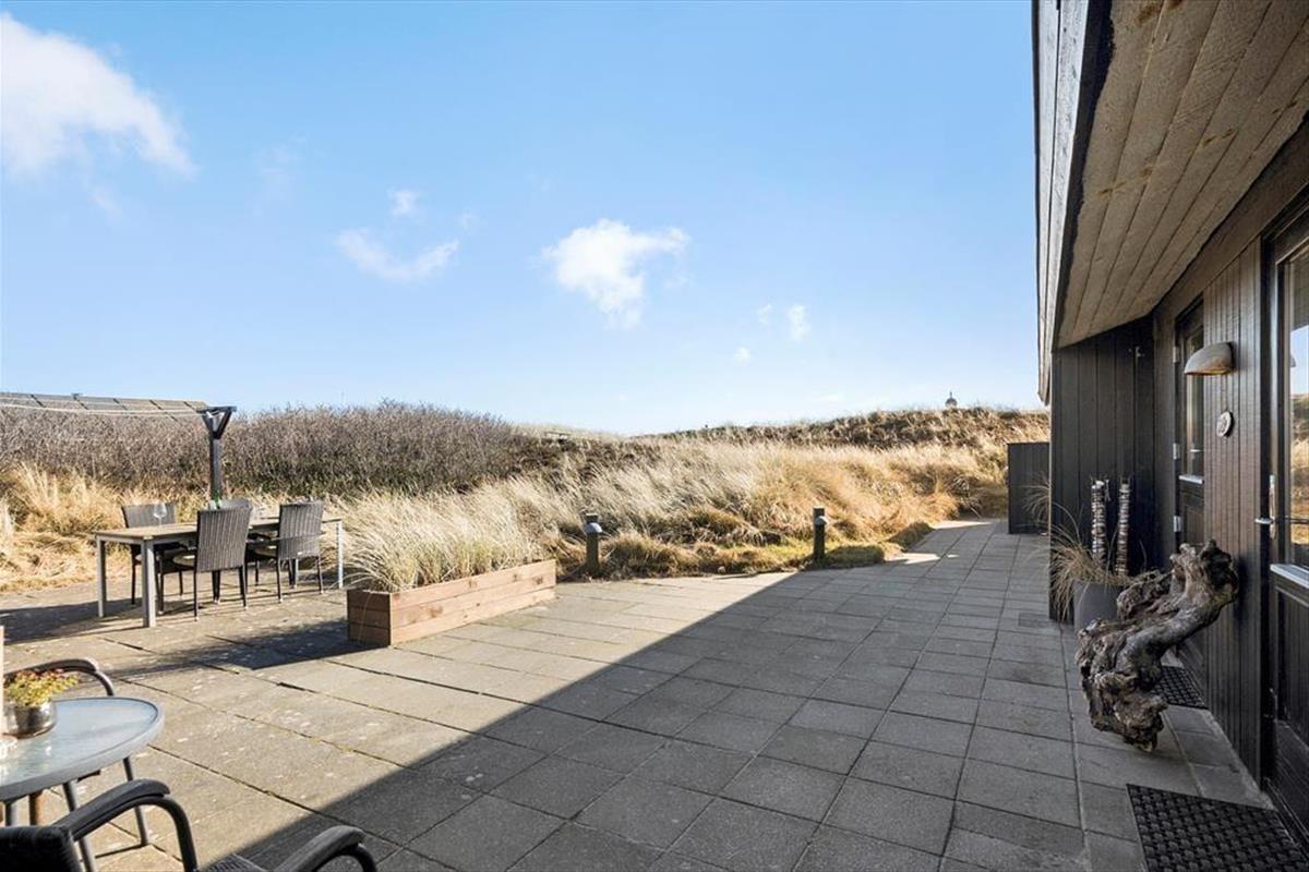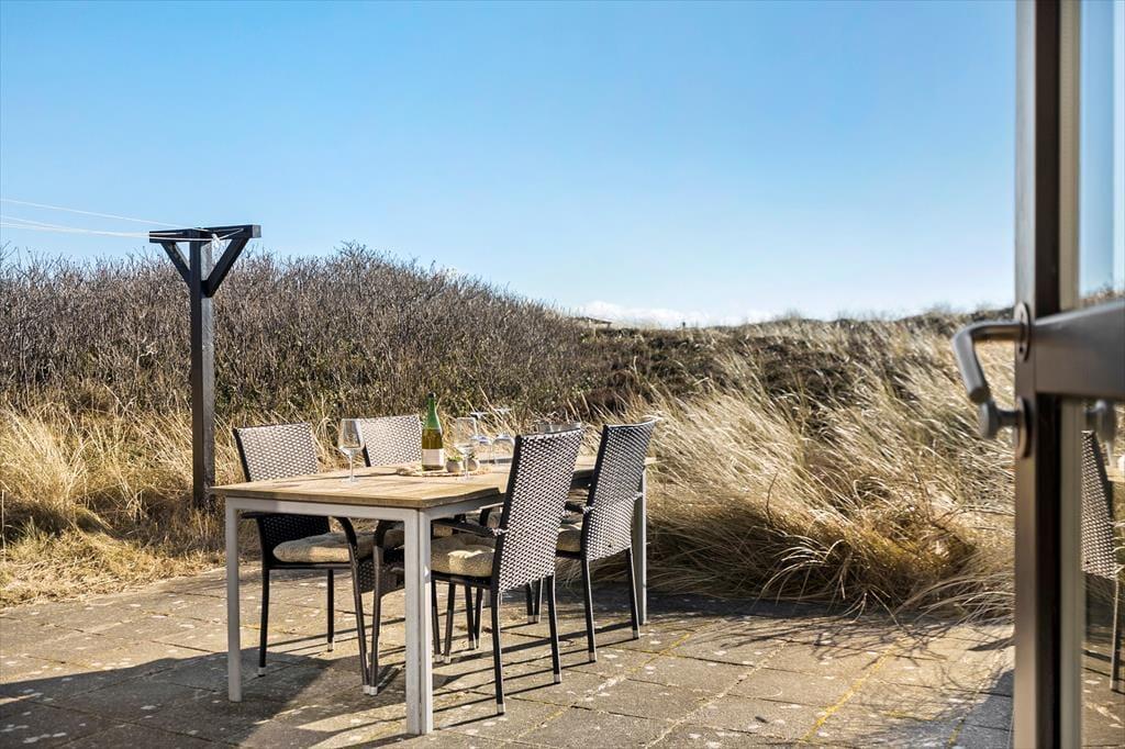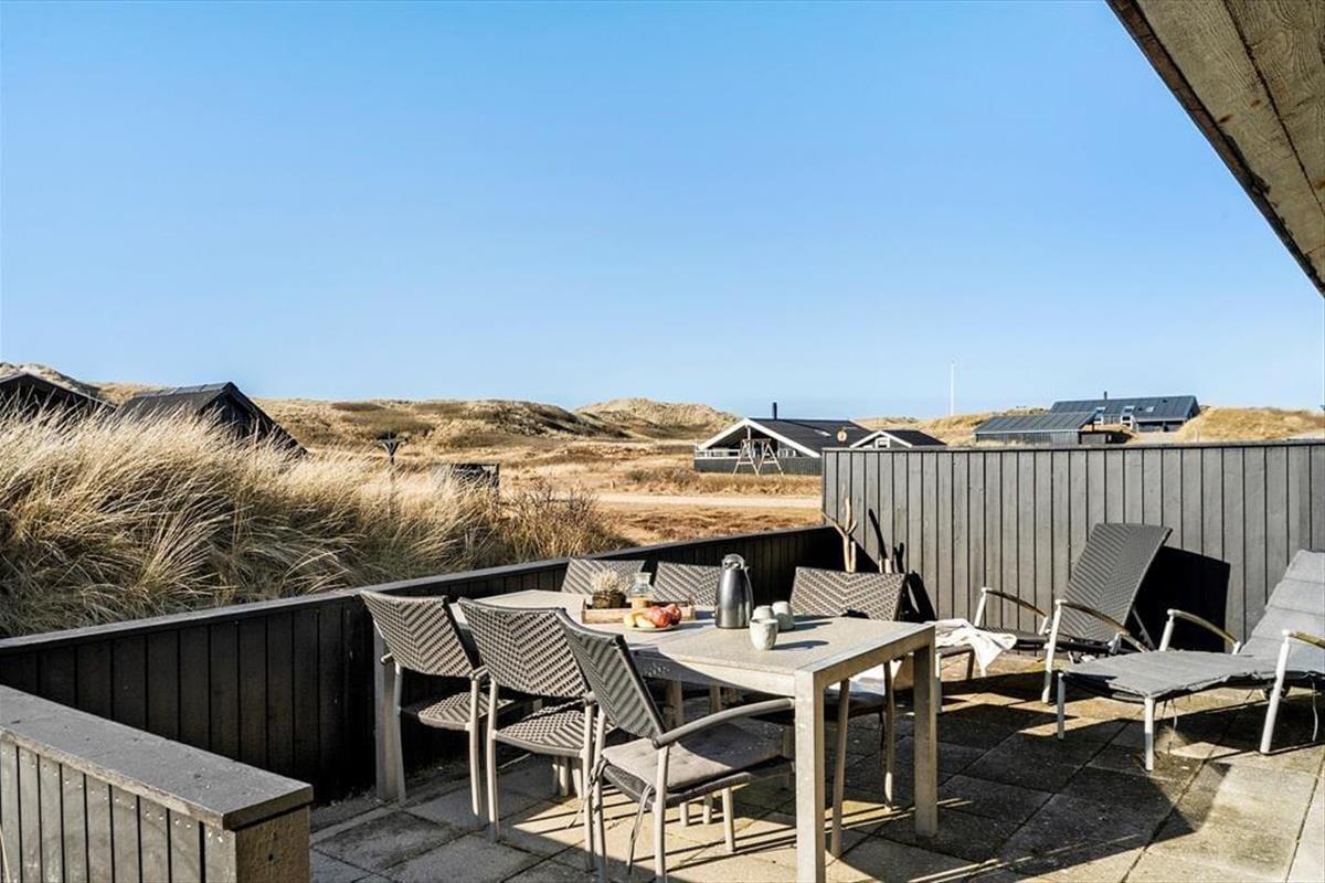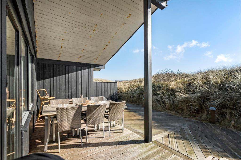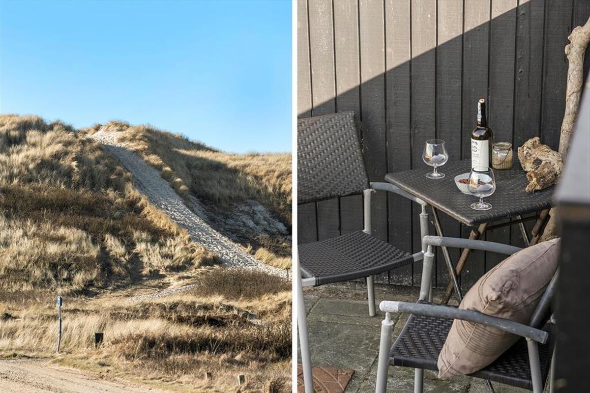 Draußen kannst du die Urlaubsstimmung wirklich spüren. Die große, teilweise überdachte Terrasse ist perfekt für lange Mahlzeiten in guter Gesellschaft an der frischen Luft. Möchtest du in der Sonne liegen, gibt es reichlich Platz, um auf den bereitstehenden Liegestühlen zu relaxen. Die Terrasse bietet südöstliche Ausrichtung – du kannst den ganzen Tag die Sonne genießen, während eine leichte Brise vom Meer die perfekte Atmosphäre schafft. Nach einem Tag am Strand ist es herrlich, den Körper in der Sauna entspannen zu lassen oder ein Grillabend unter freiem Himmel zu genießen. Und wie gesagt, dein Hund darf dabei seien - er kann auf der Terrasse frei herumlaufen und du kannst dich schön entspannen.