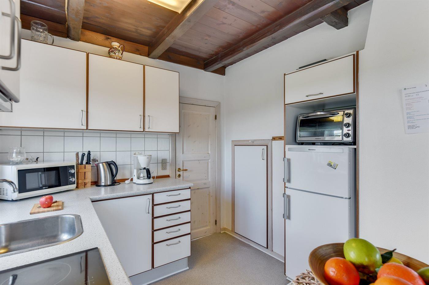 De keuken is uitgerust met koelkast Er is 4 elektrische kookplaten, bakoven, magnetron.