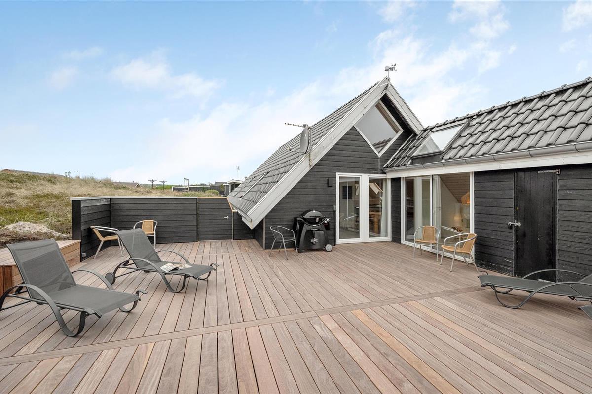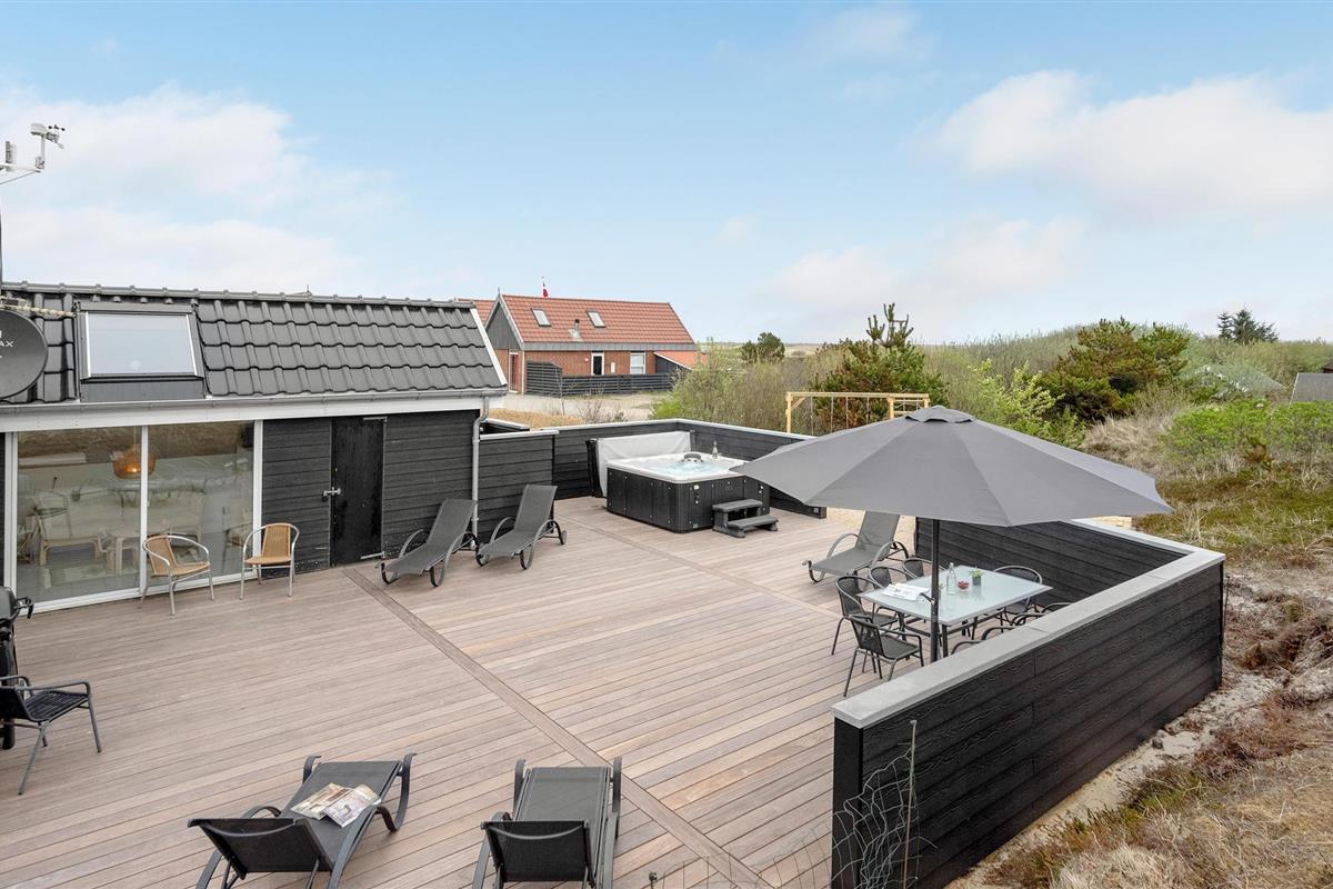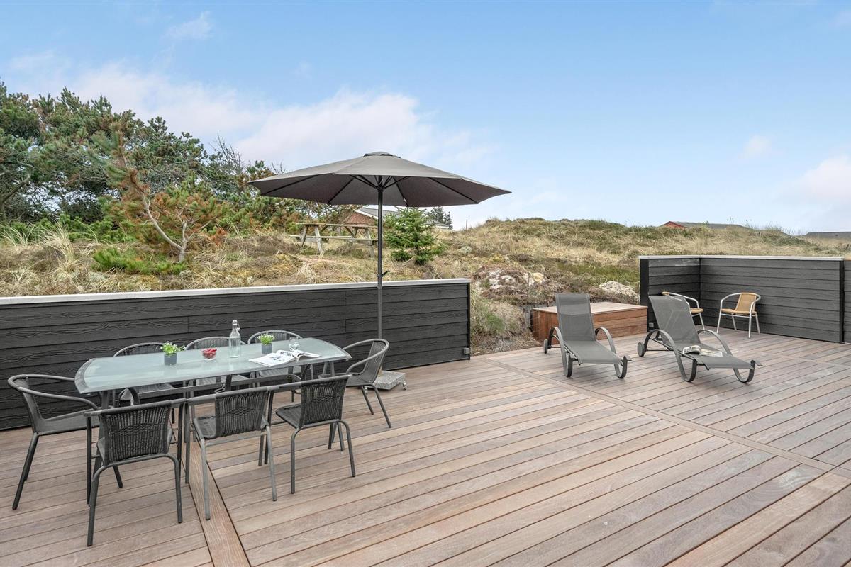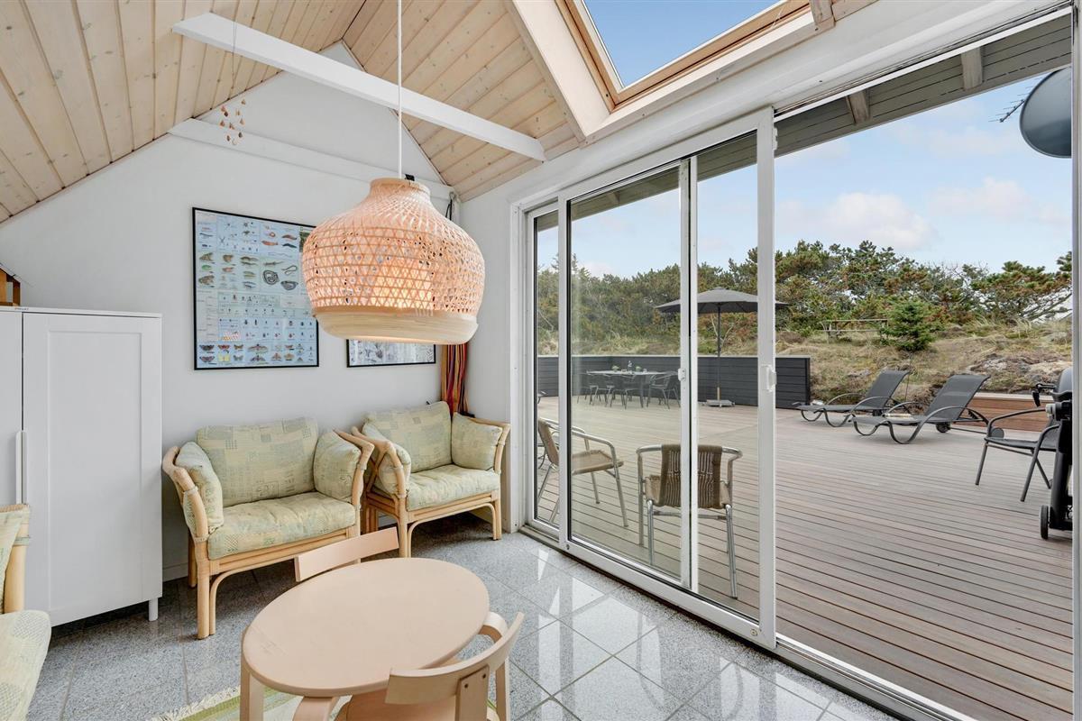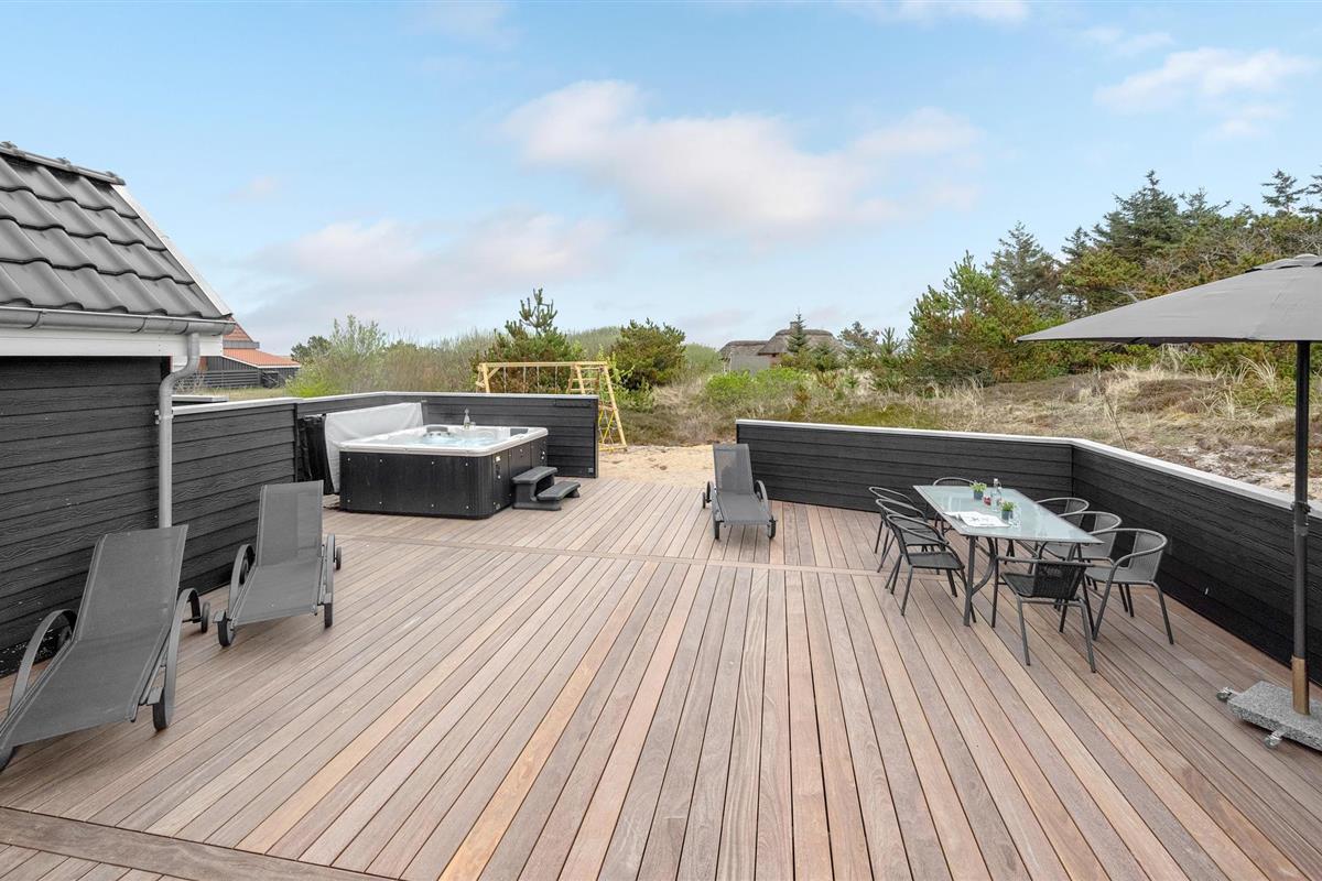Van hieruit heeft u toegang tot het op het zuidoosten gelegen, gedeeltelijk afgeschermde terras met tuinmeubelen, ligstoelen, barbecue en buitenwhirlpool. Hier geniet u van vele, zomerse uren en heeft u een prachtig uitzicht op het golvende, met heide begroeide duingoed. Het terras grenst direct aan de gezellige serre, waar u op sterrenavonden door het dakraam naar de sterrenhemel kunt kijken. Op het terrein vinden uw kinderen diverse speeltoestellen en volop ruimte om zich uit te leven.
