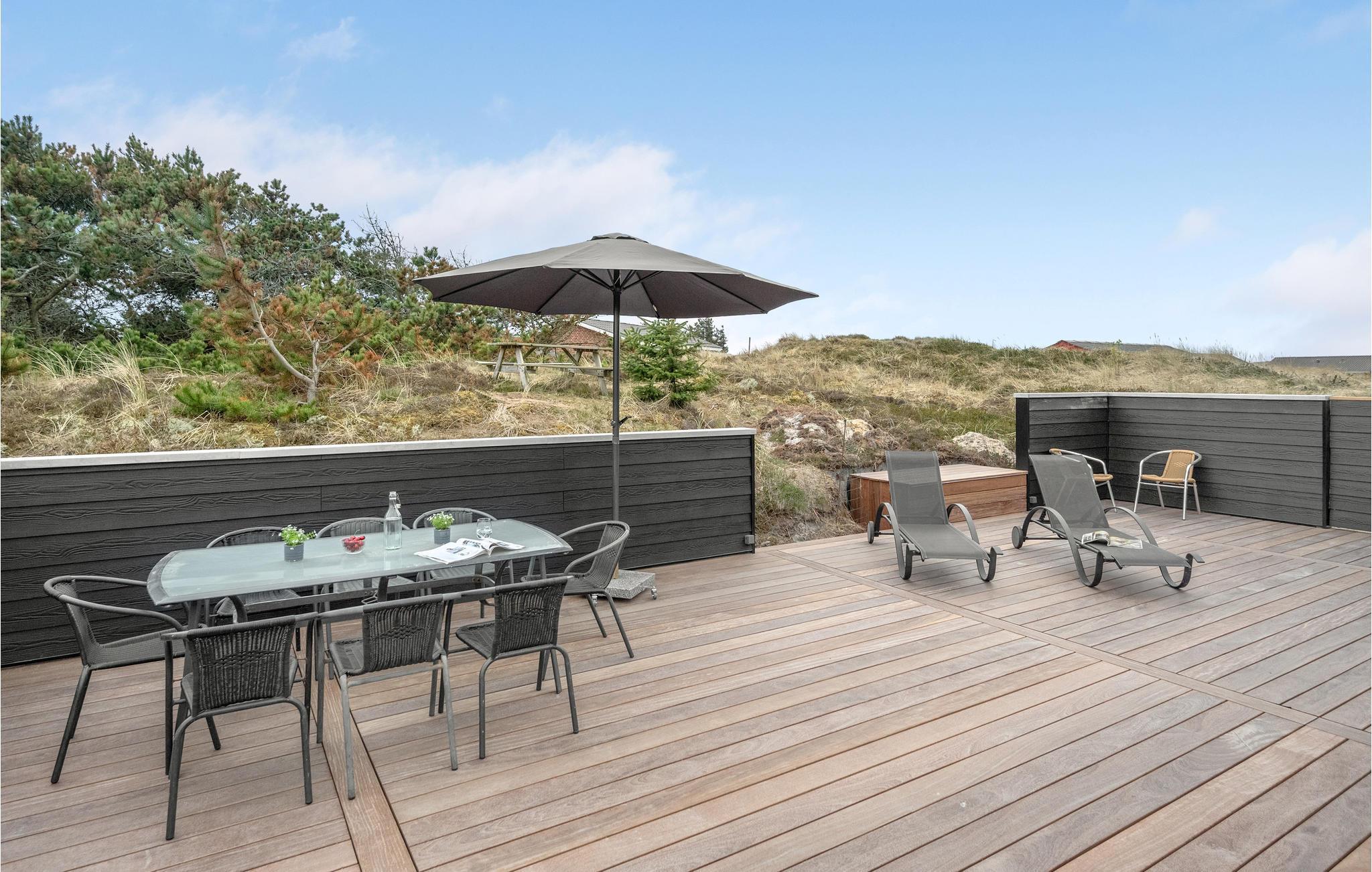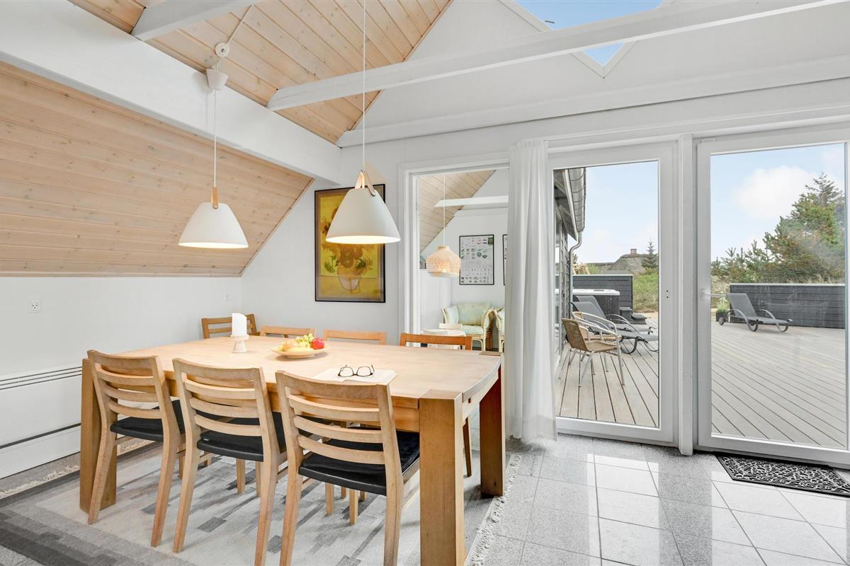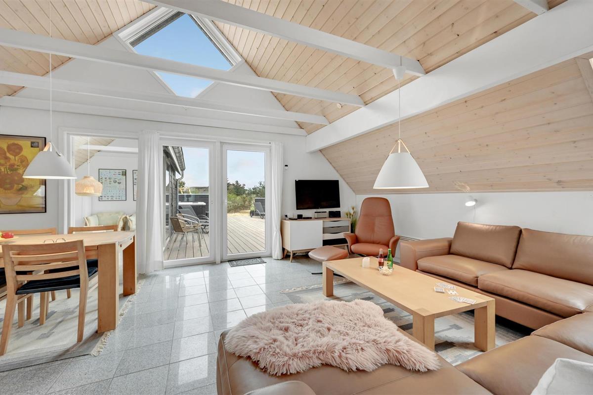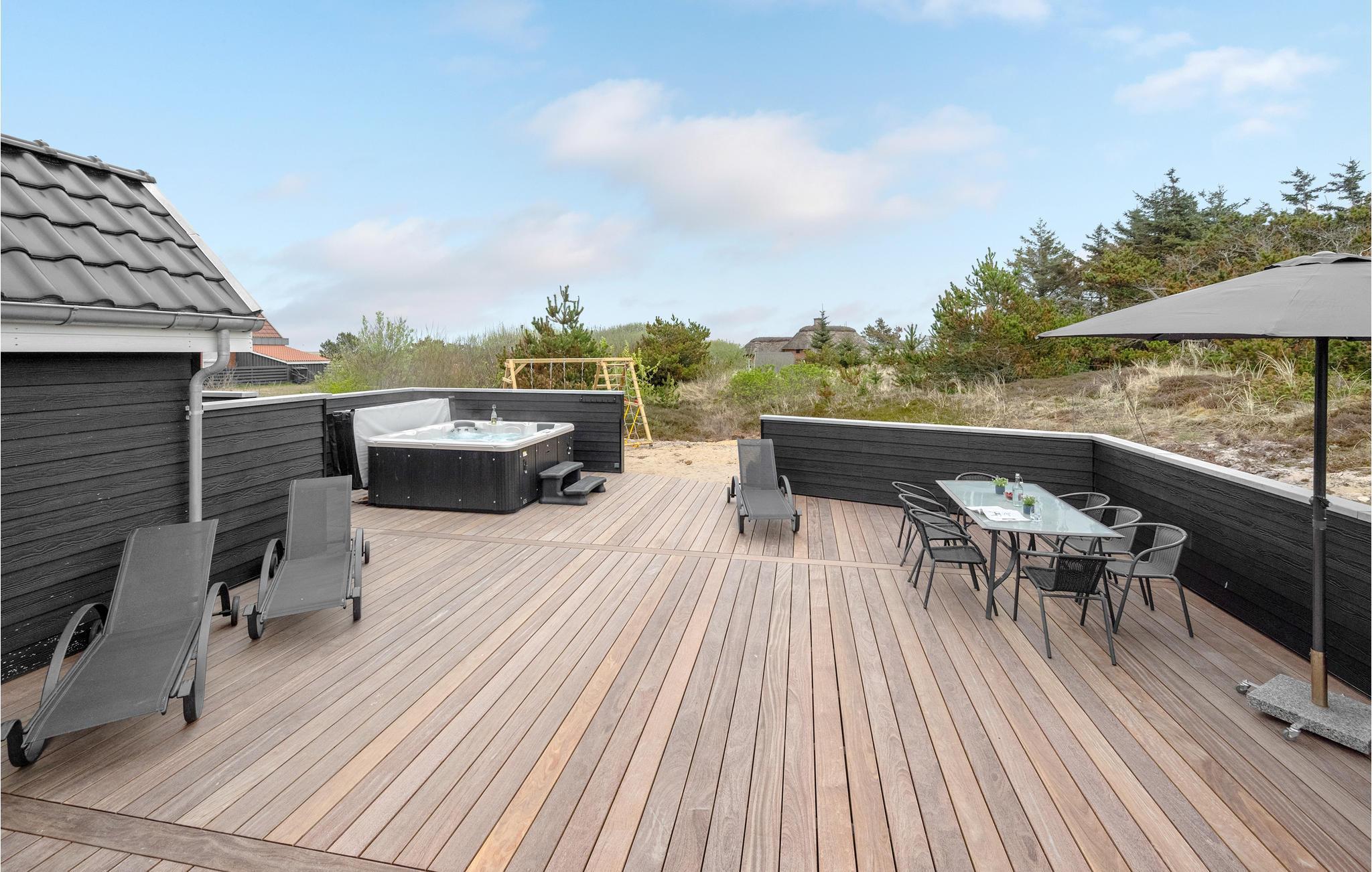Van hieruit heeft u toegang tot het op het zuidoosten gelegen, gedeeltelijk afgeschermde terras met tuinmeubelen, ligstoelen, barbecue en buitenwhirlpool. Hier geniet u van vele, zomerse uren en heeft u een prachtig uitzicht op het golvende, met heide begroeide duingoed. Het terras grenst direct aan de gezellige serre, waar u op sterrenavonden door het dakraam naar de sterrenhemel kunt kijken. Op het terrein vinden uw kinderen diverse speeltoestellen en volop ruimte om zich uit te leven.