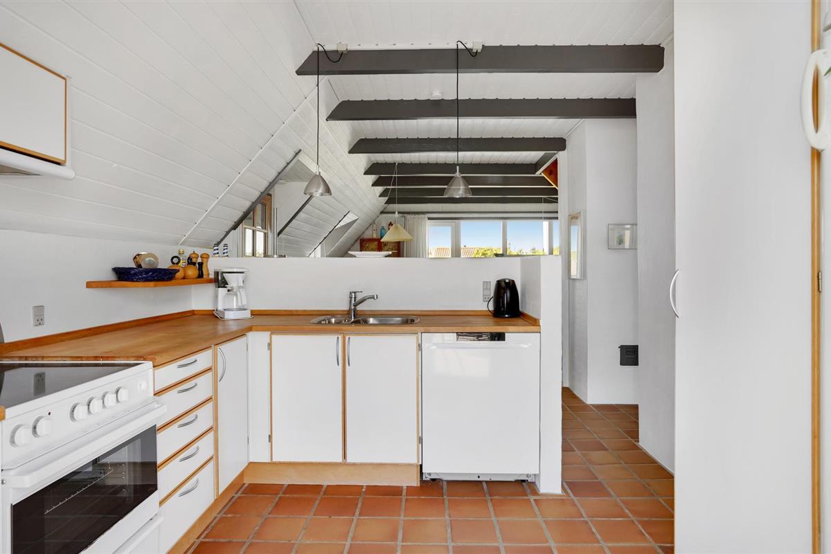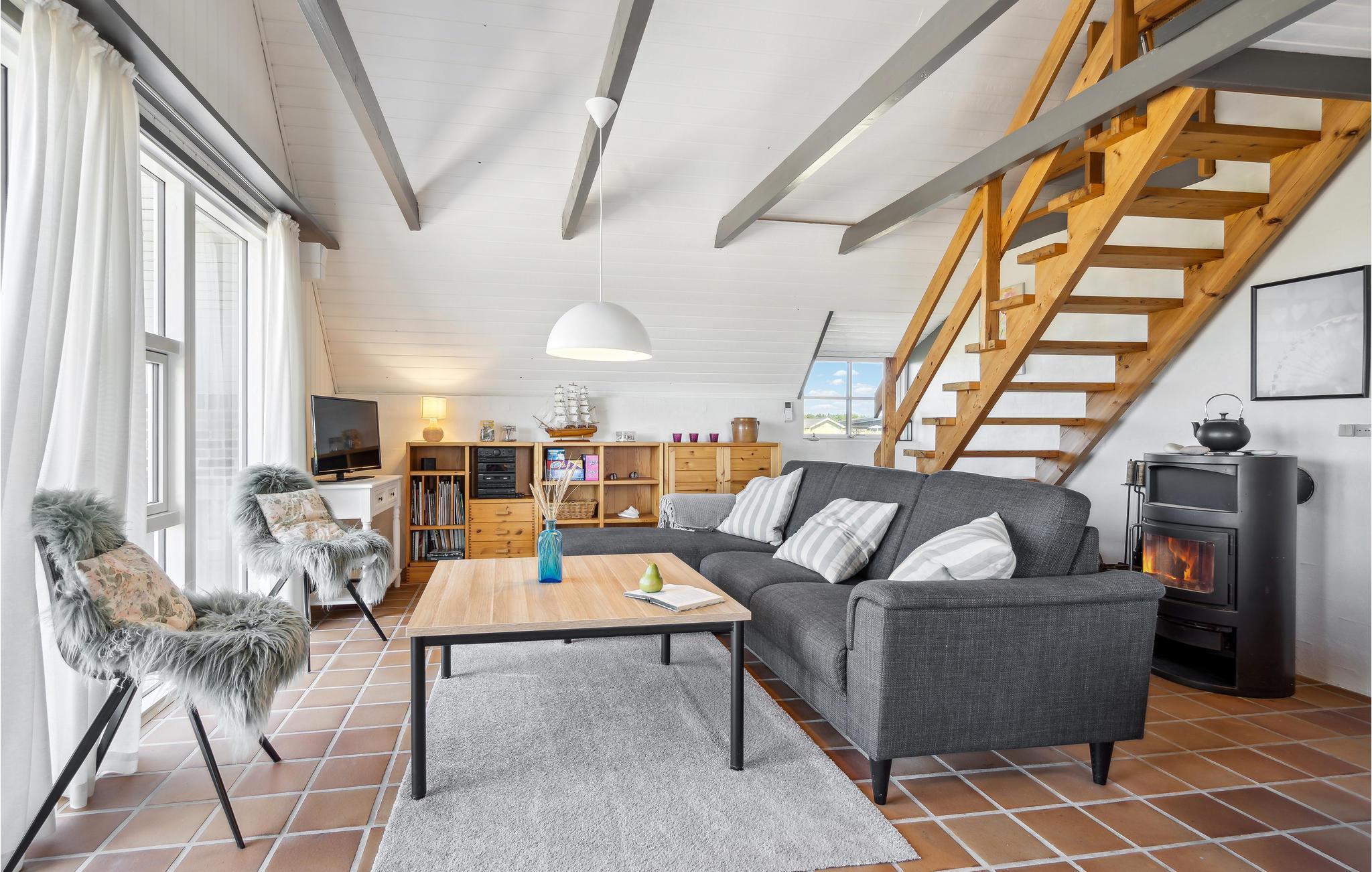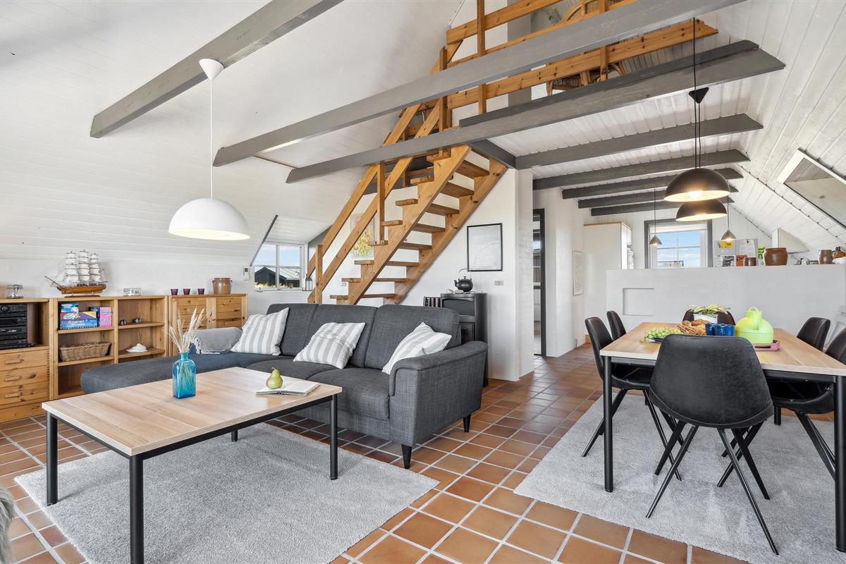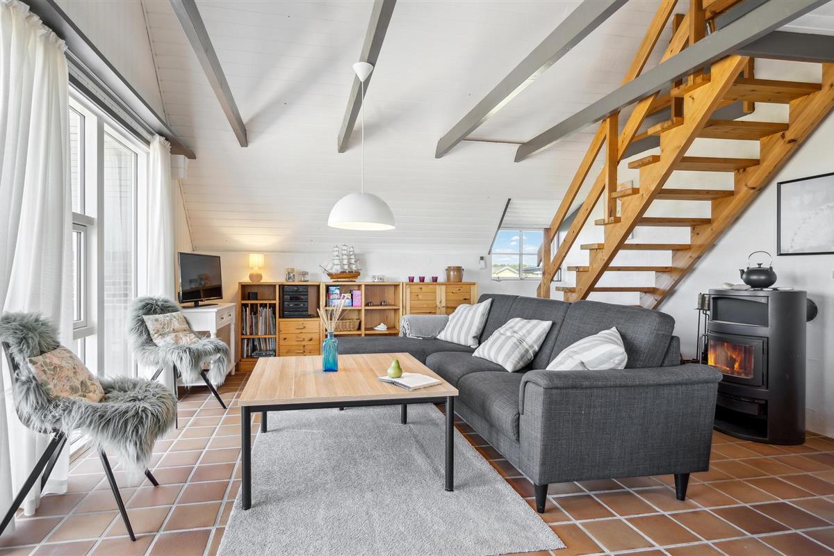 De gezellige woonkamer heeft een houtkachel. Vanaf hier leidt een deur naar het terras en de trap naar de 1e verdieping, waar nog een slaapkamer is met twee eenpersoonsbedden en uitzicht op Ringkøbing Fjord.