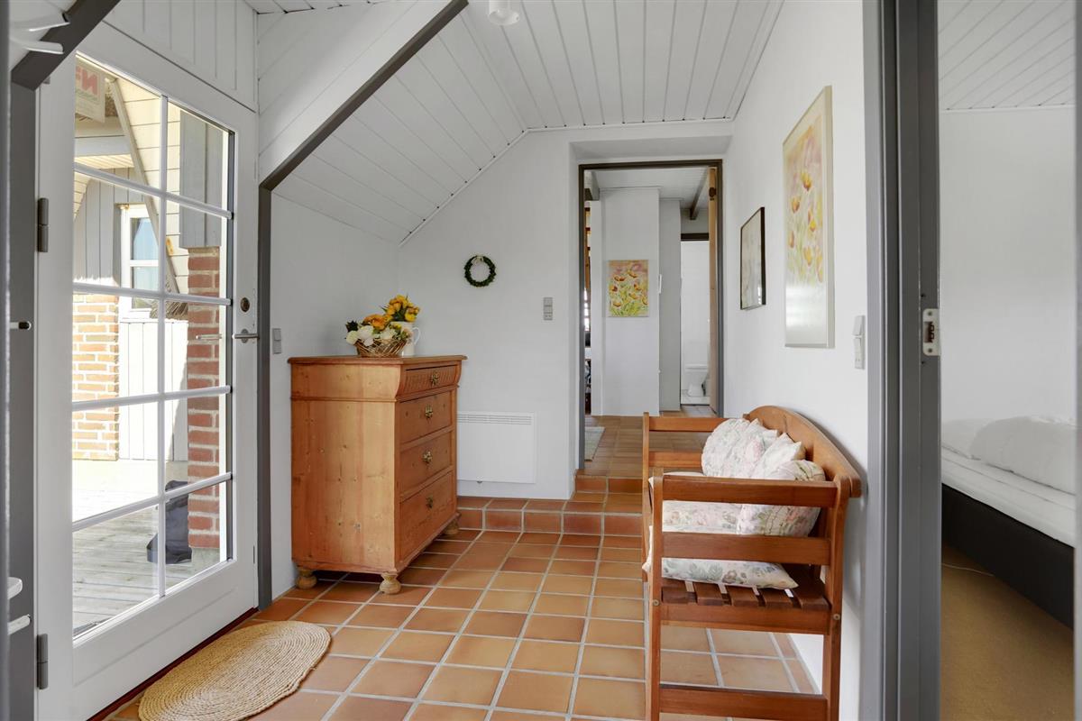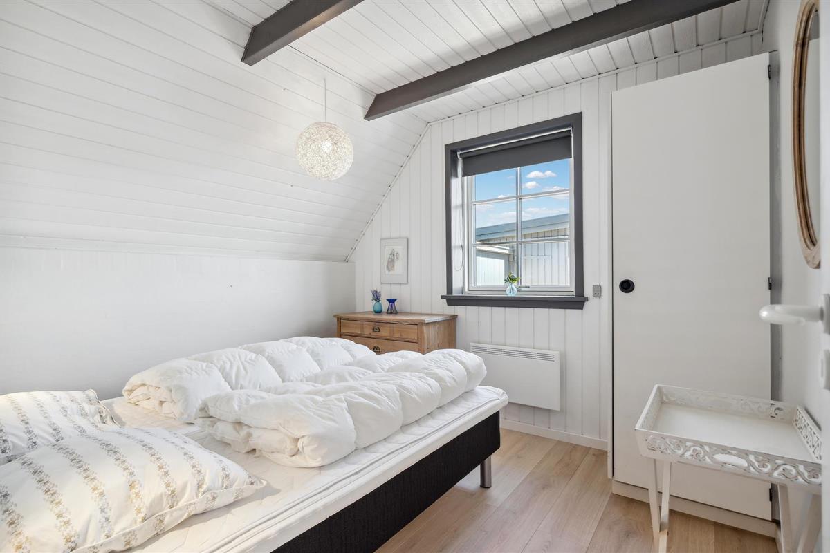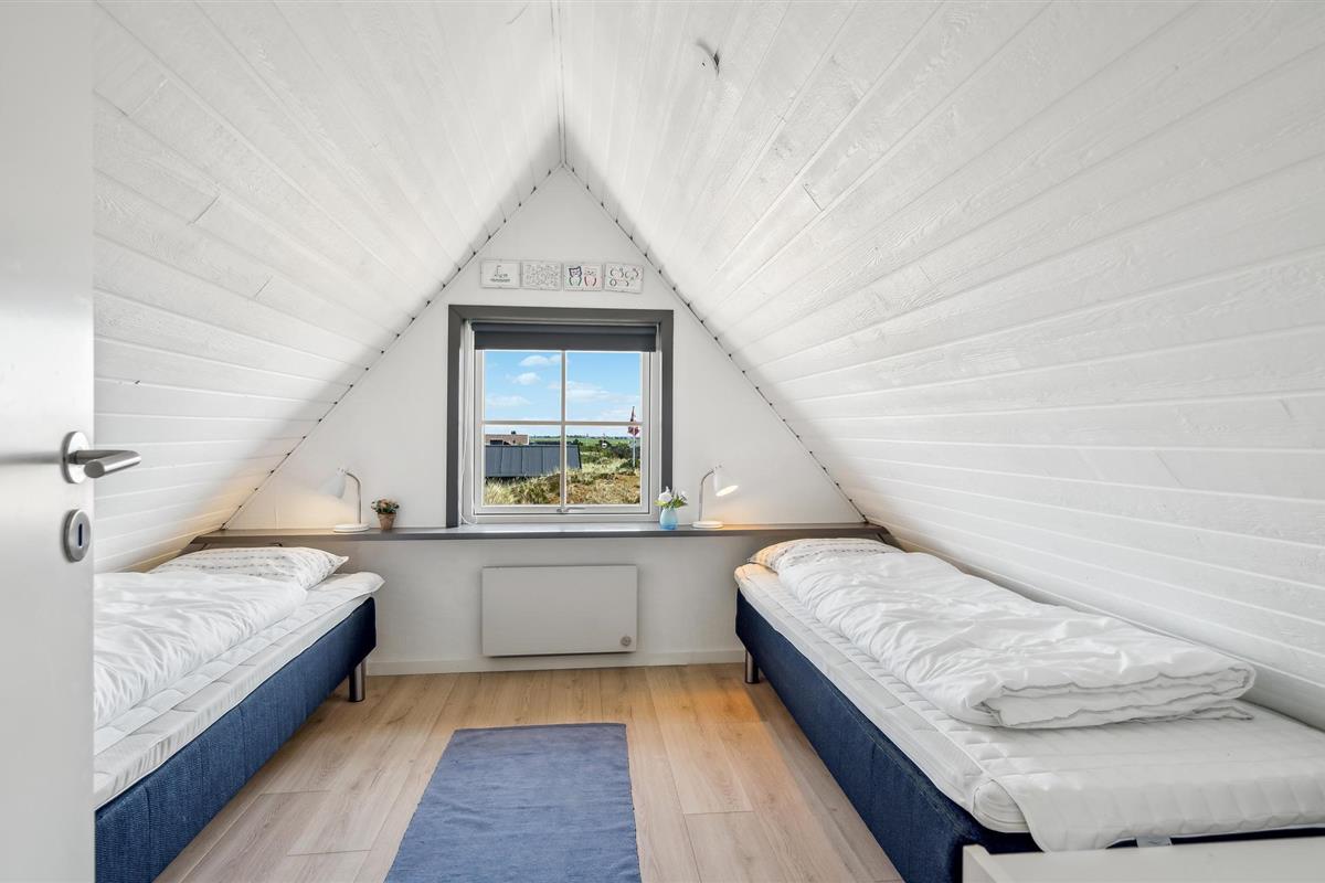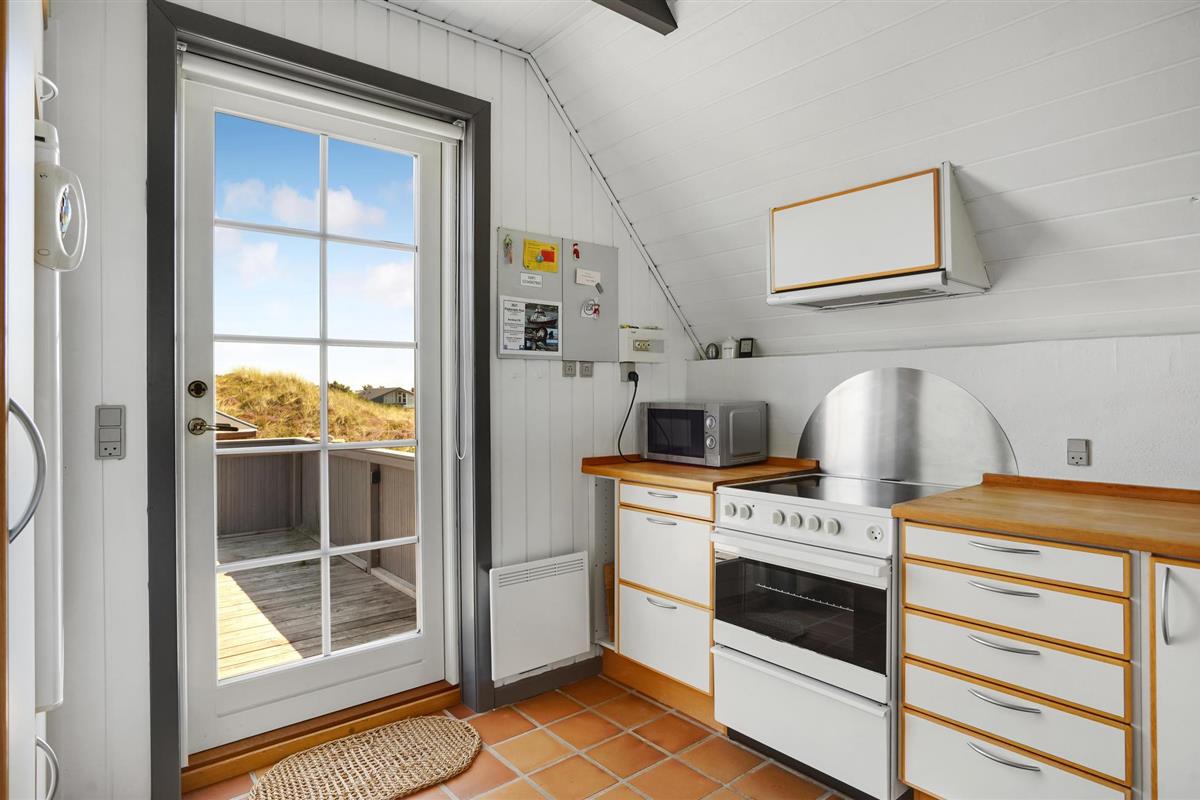 De gezellige woonkamer heeft een houtkachel. Vanaf hier leidt een deur naar het terras en de trap naar de 1e verdieping, waar nog een slaapkamer is met twee eenpersoonsbedden en uitzicht op Ringkøbing Fjord.