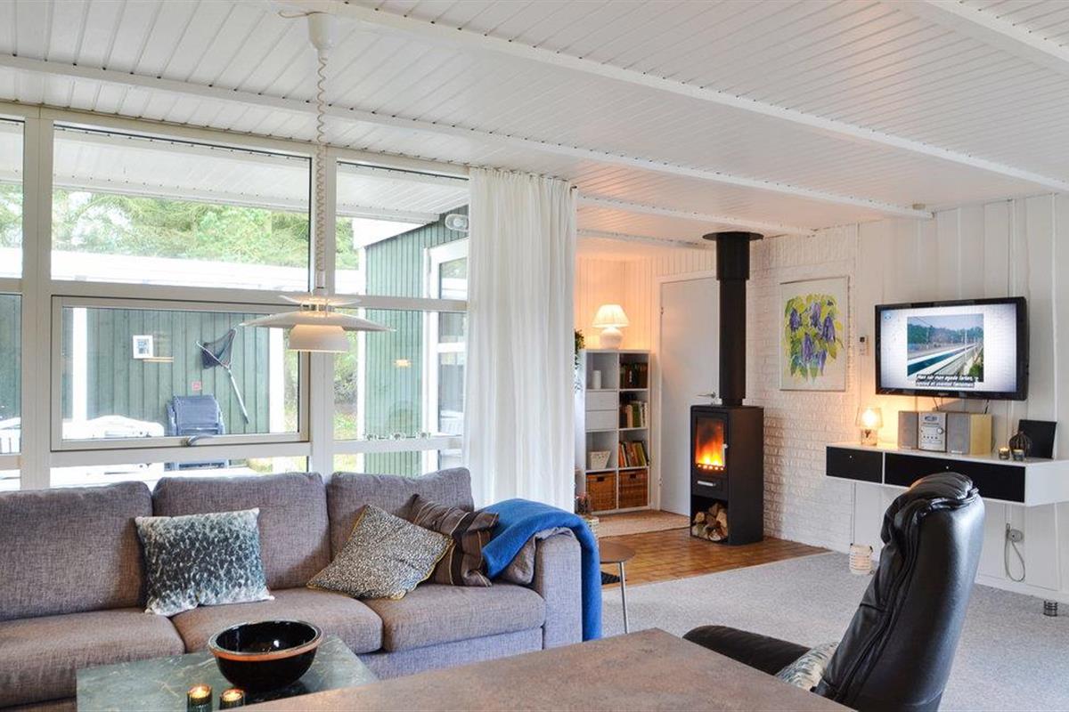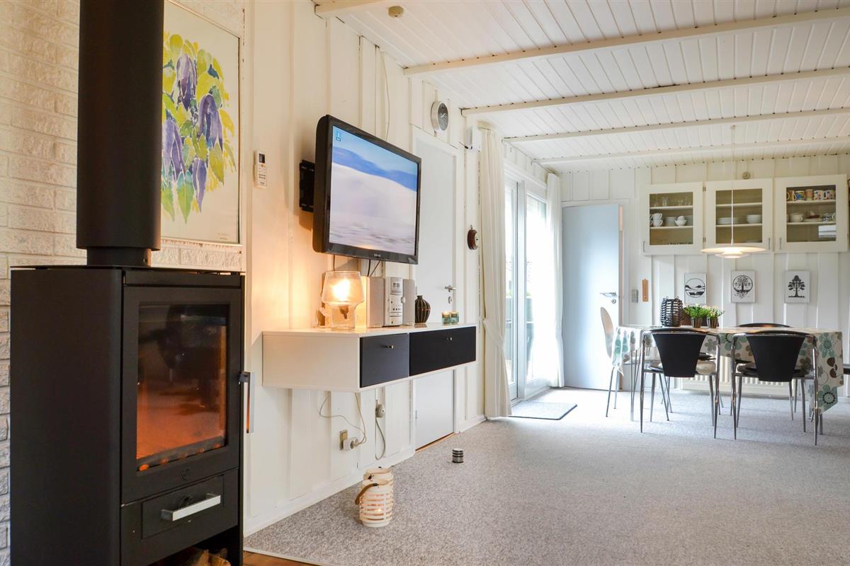 Een gezellige sfeer wordt gecreëerd door de houtkachel, die zowel vanuit de keuken als vanuit de woonkamer gebruikt kan worden.