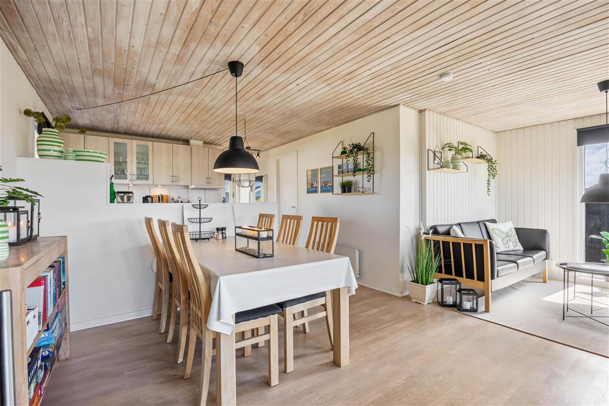 The open-plan living space, combining kitchen, dining room and seating area, creates a cosy atmosphere with its wooden ceilings and walls. The large dining table is perfect for hosting game nights.