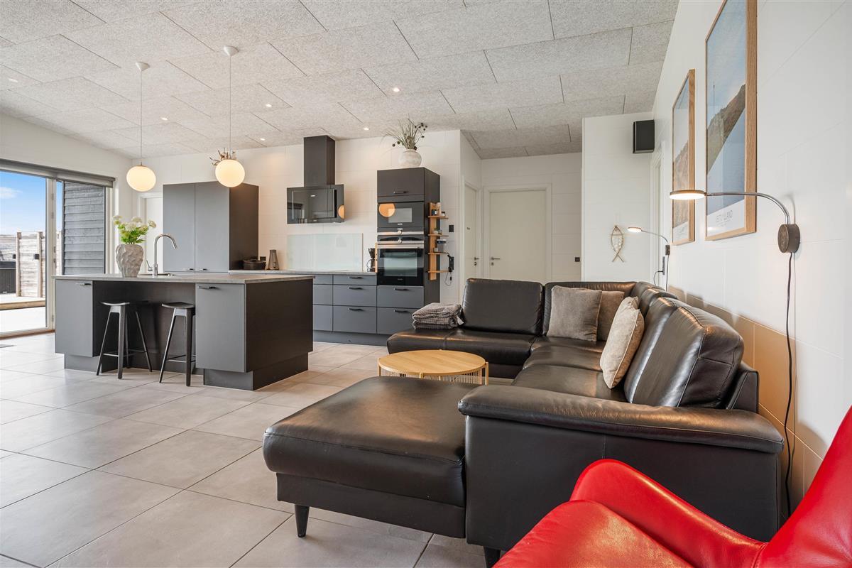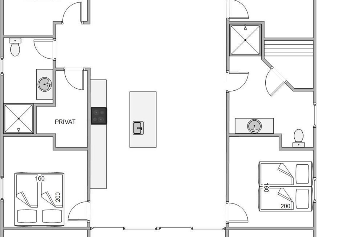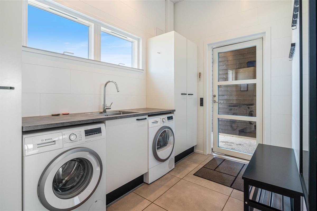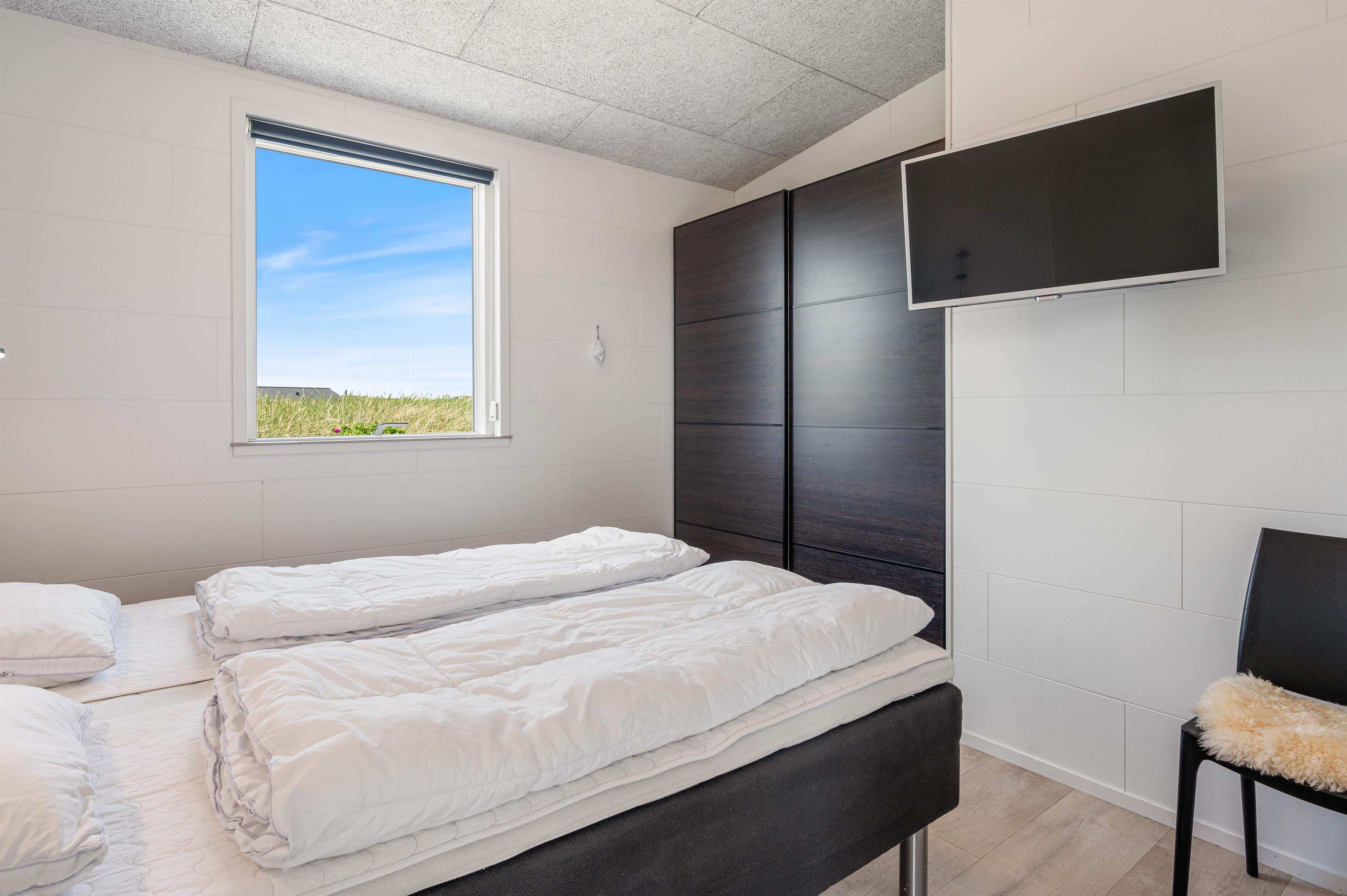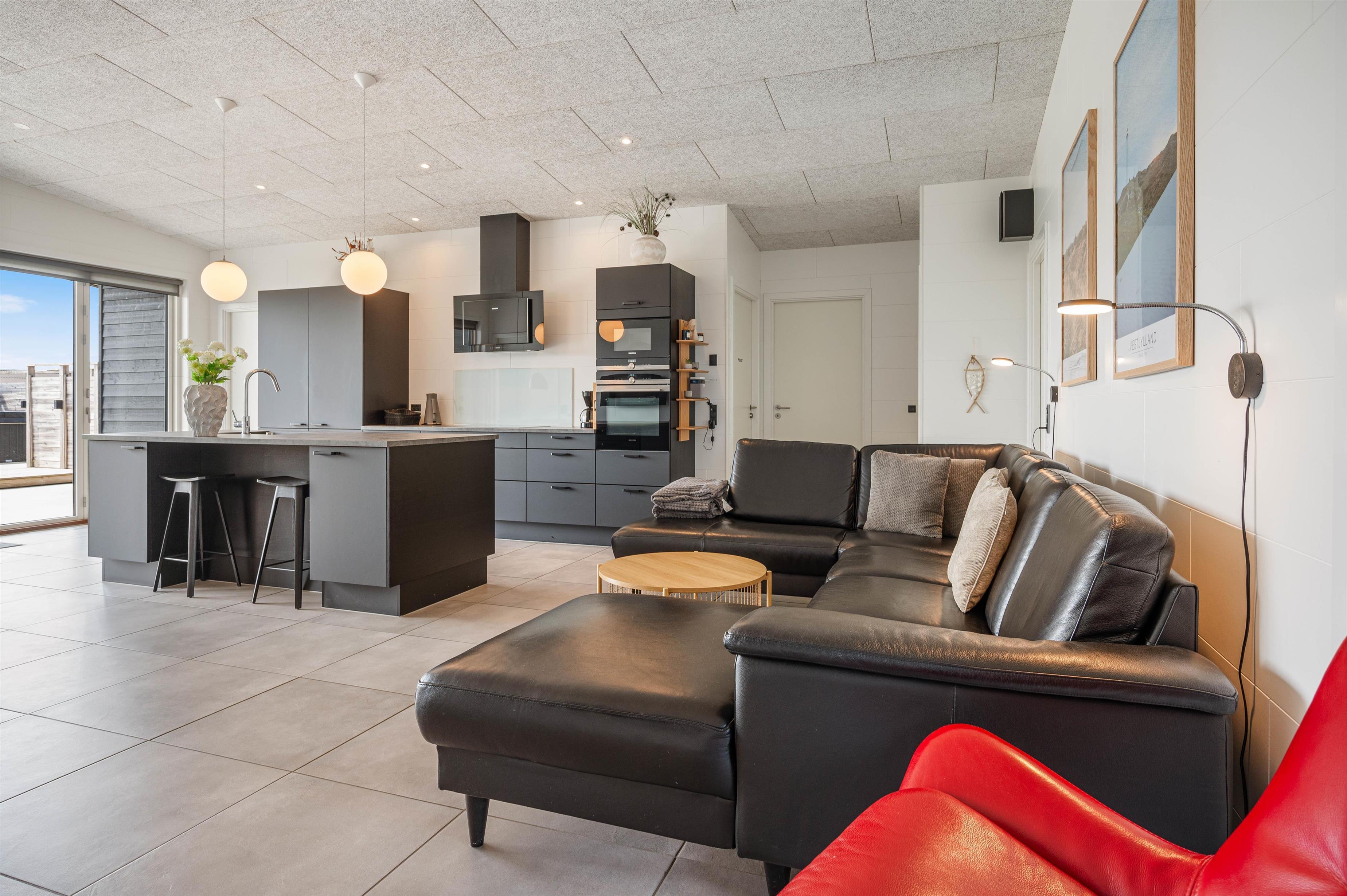 The holiday home can be effectively divided into two areas, with two bedrooms and a bathroom on either side of the communal living space. The interior is finished to a high standard in modern Scandinavian style with clean lines.
