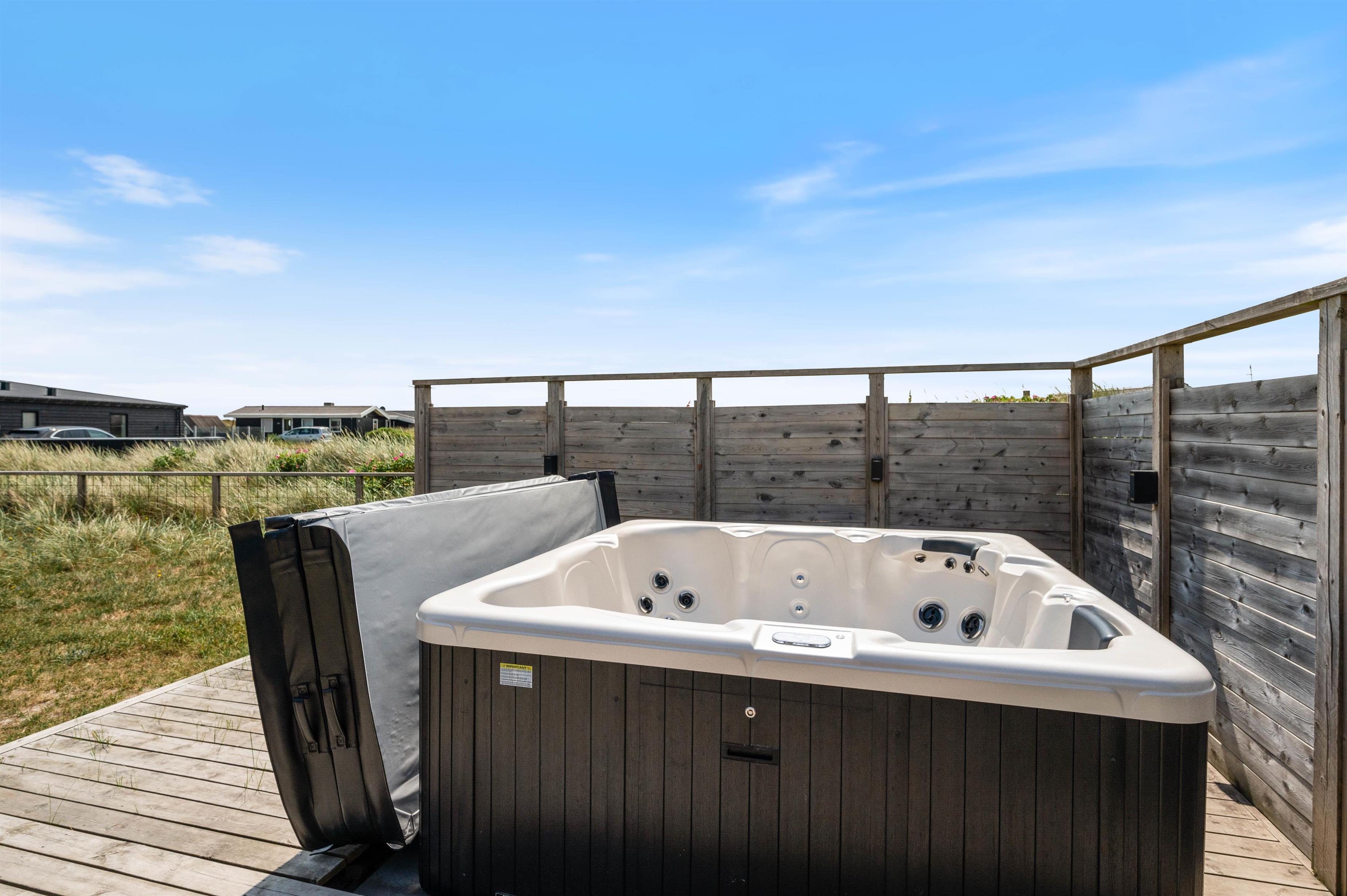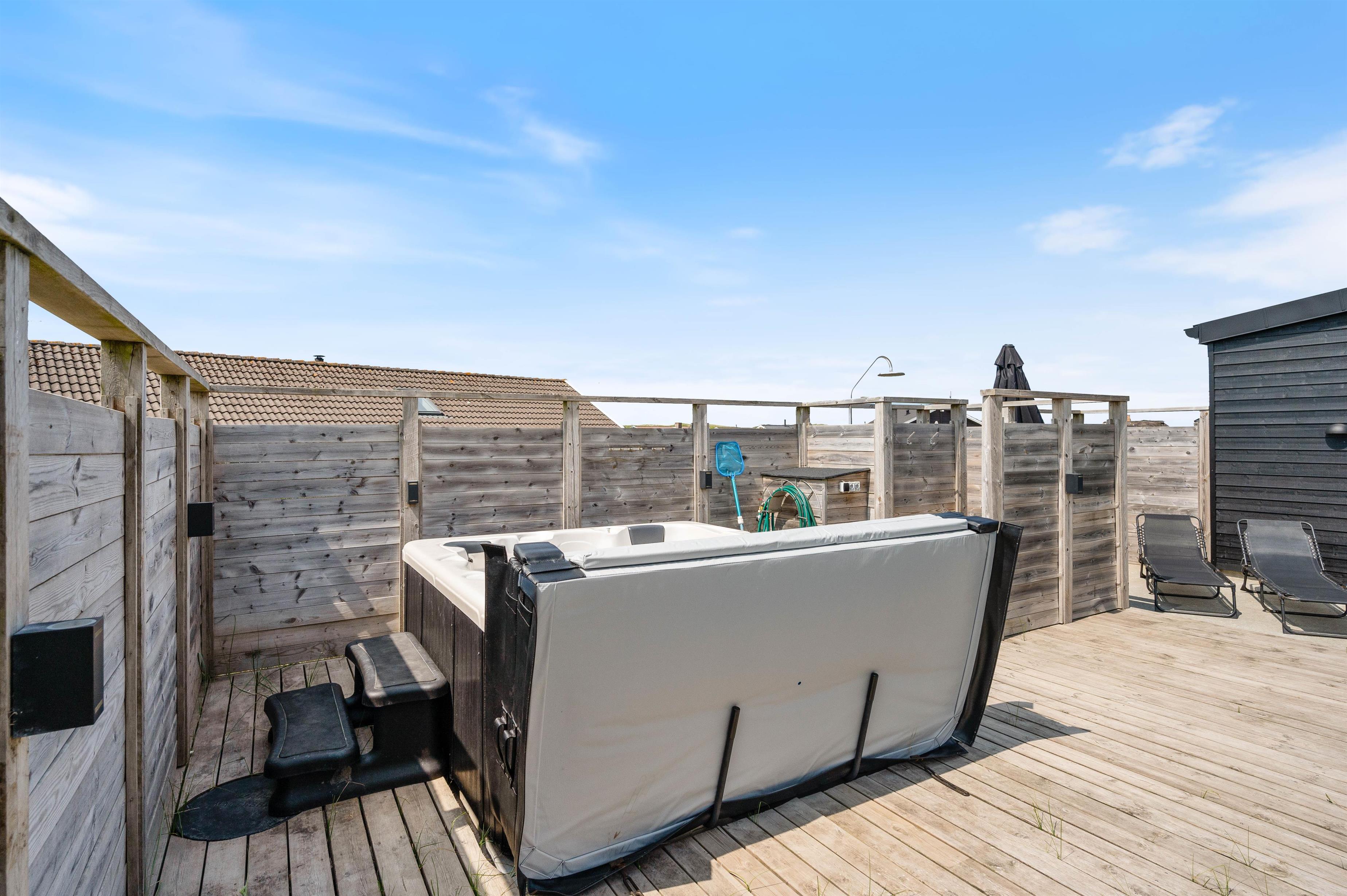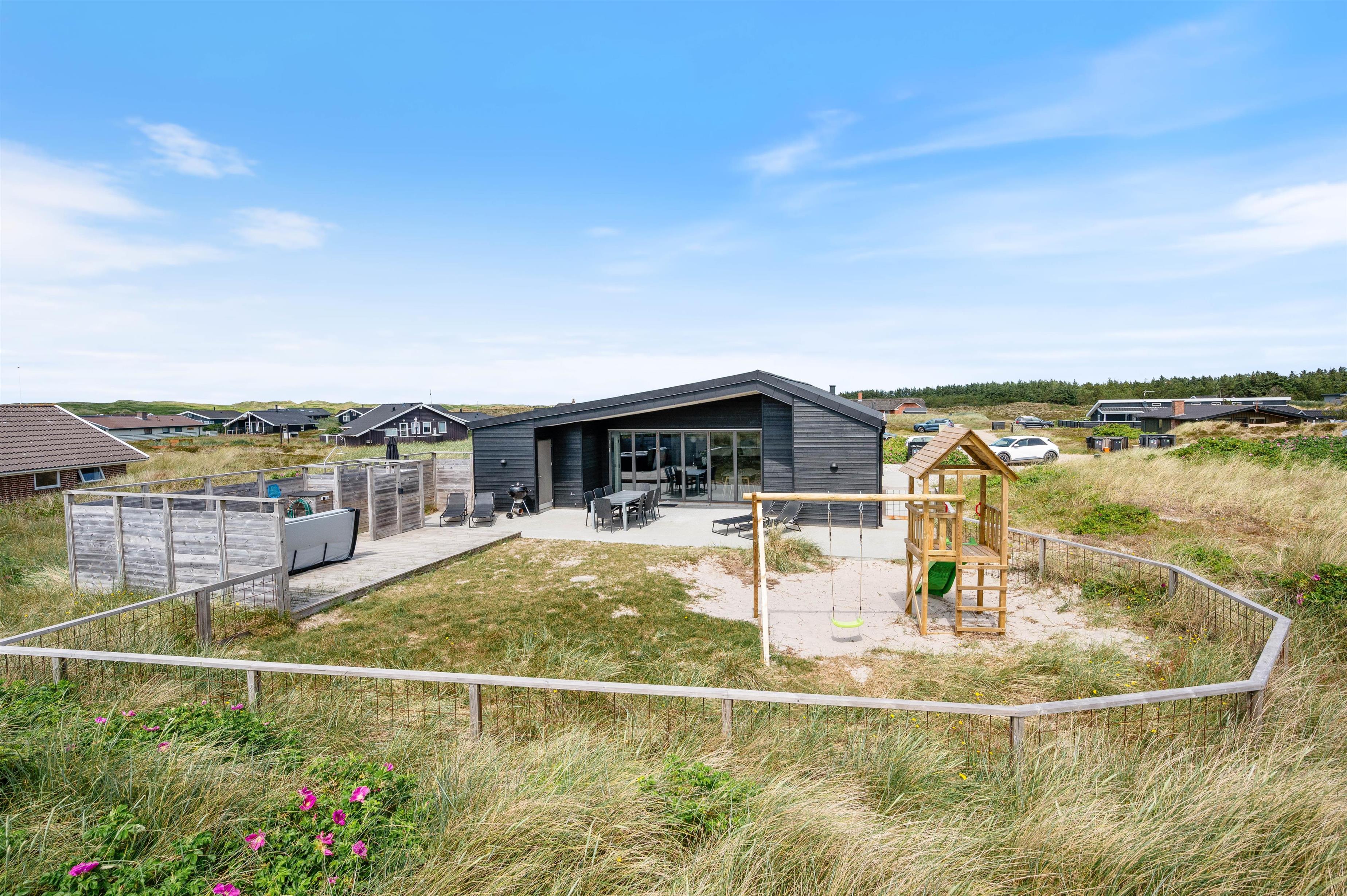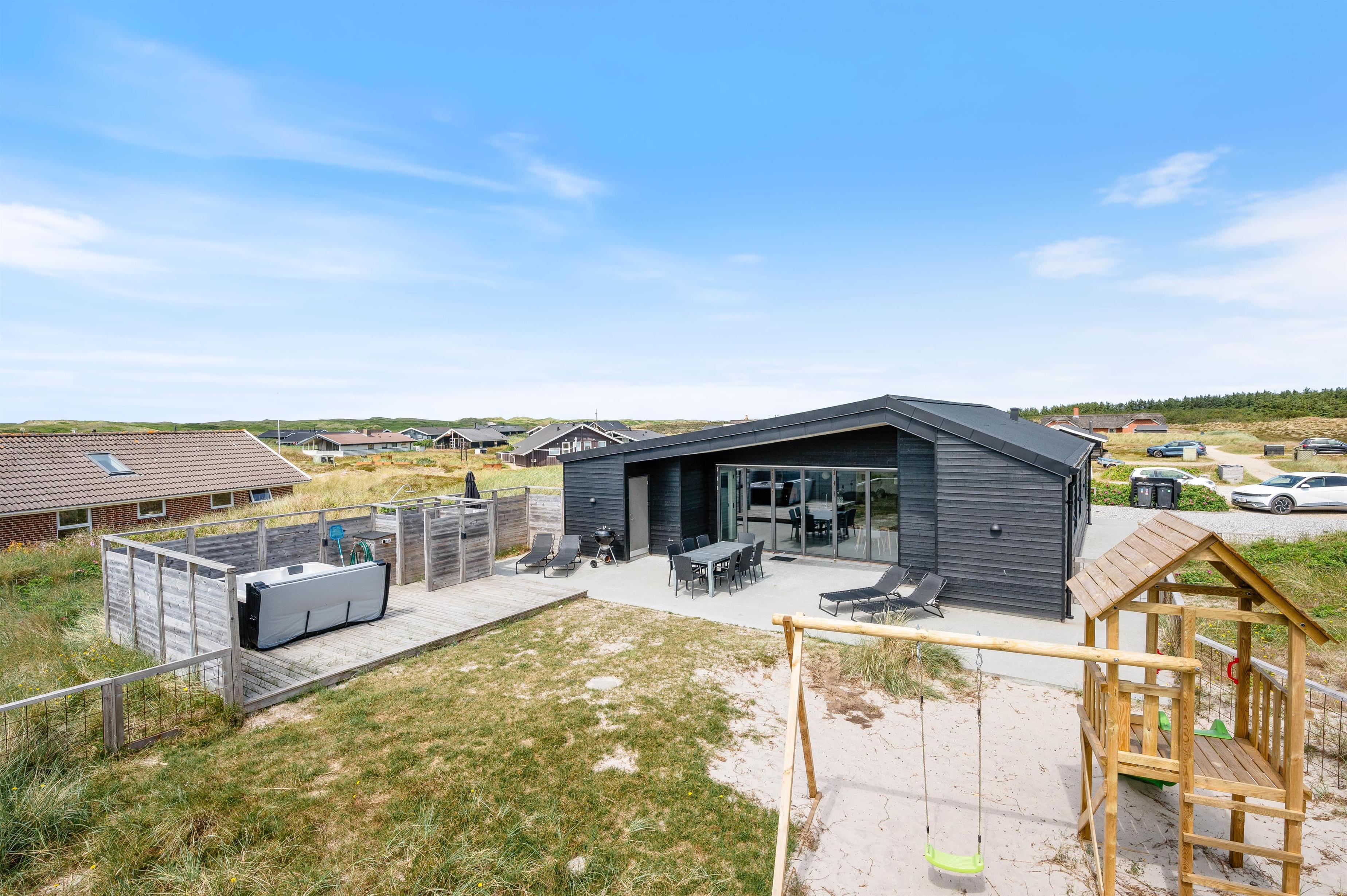 Outside, you'll find a beautiful partially covered wooden terrace perfect for long barbecues and sunbathing. Children can enjoy themselves on the play tower with swing and slide or in the sandpit, while your four-legged friend stretches their legs in the fenced area and you unwind with a cool drink in the outdoor hot tub.