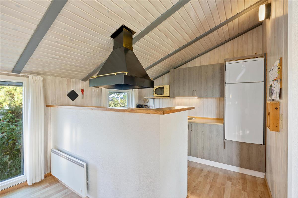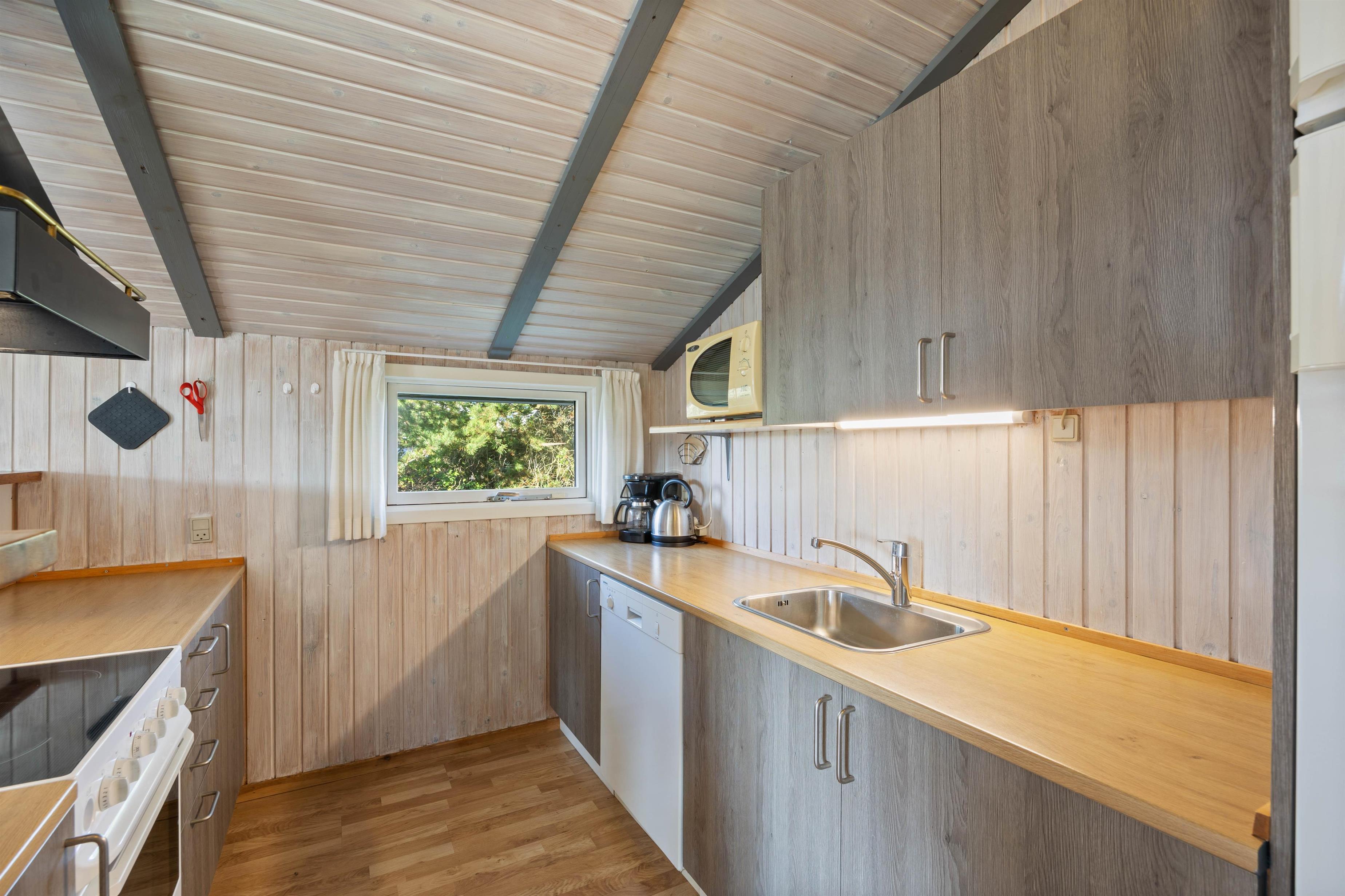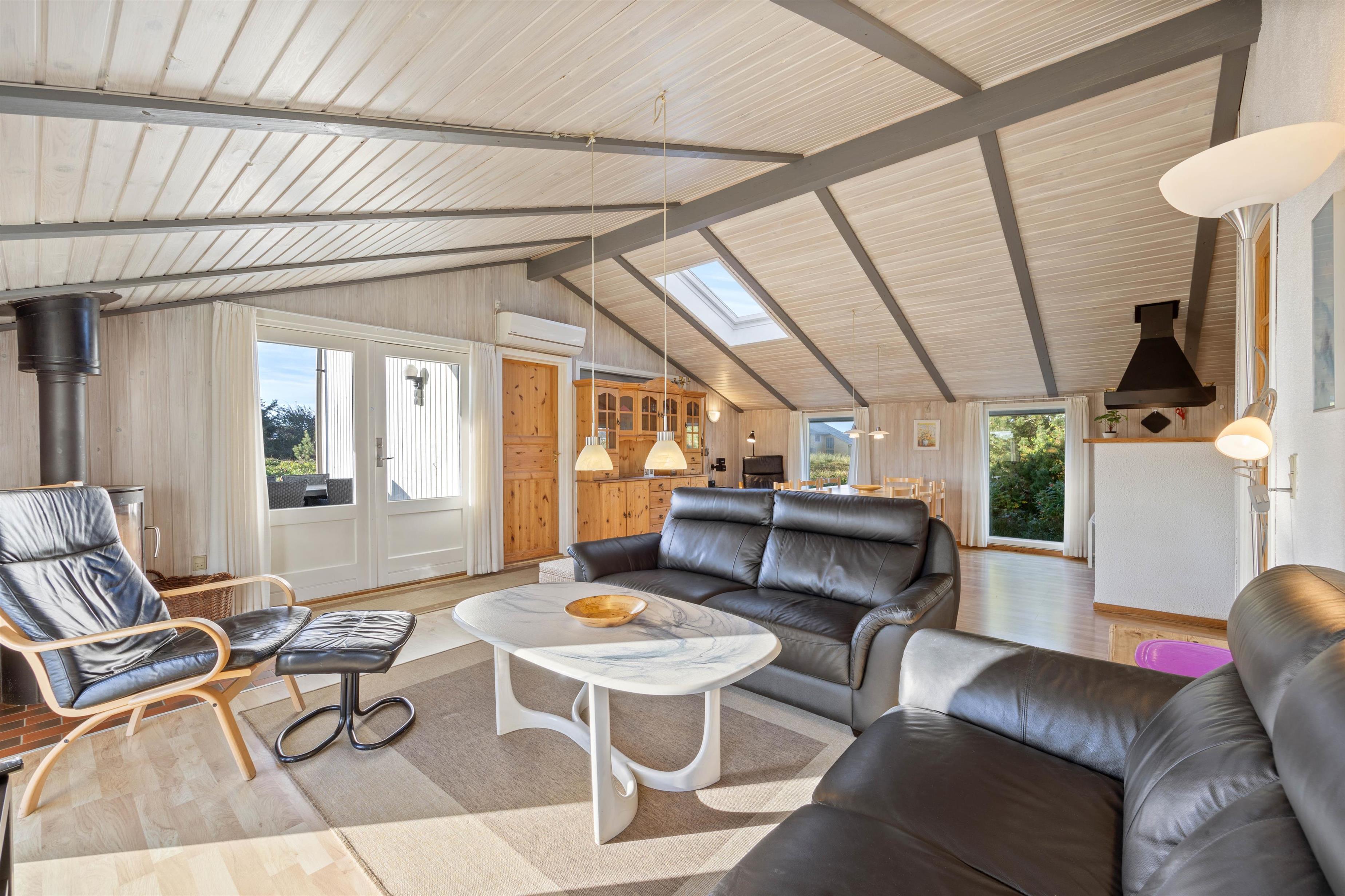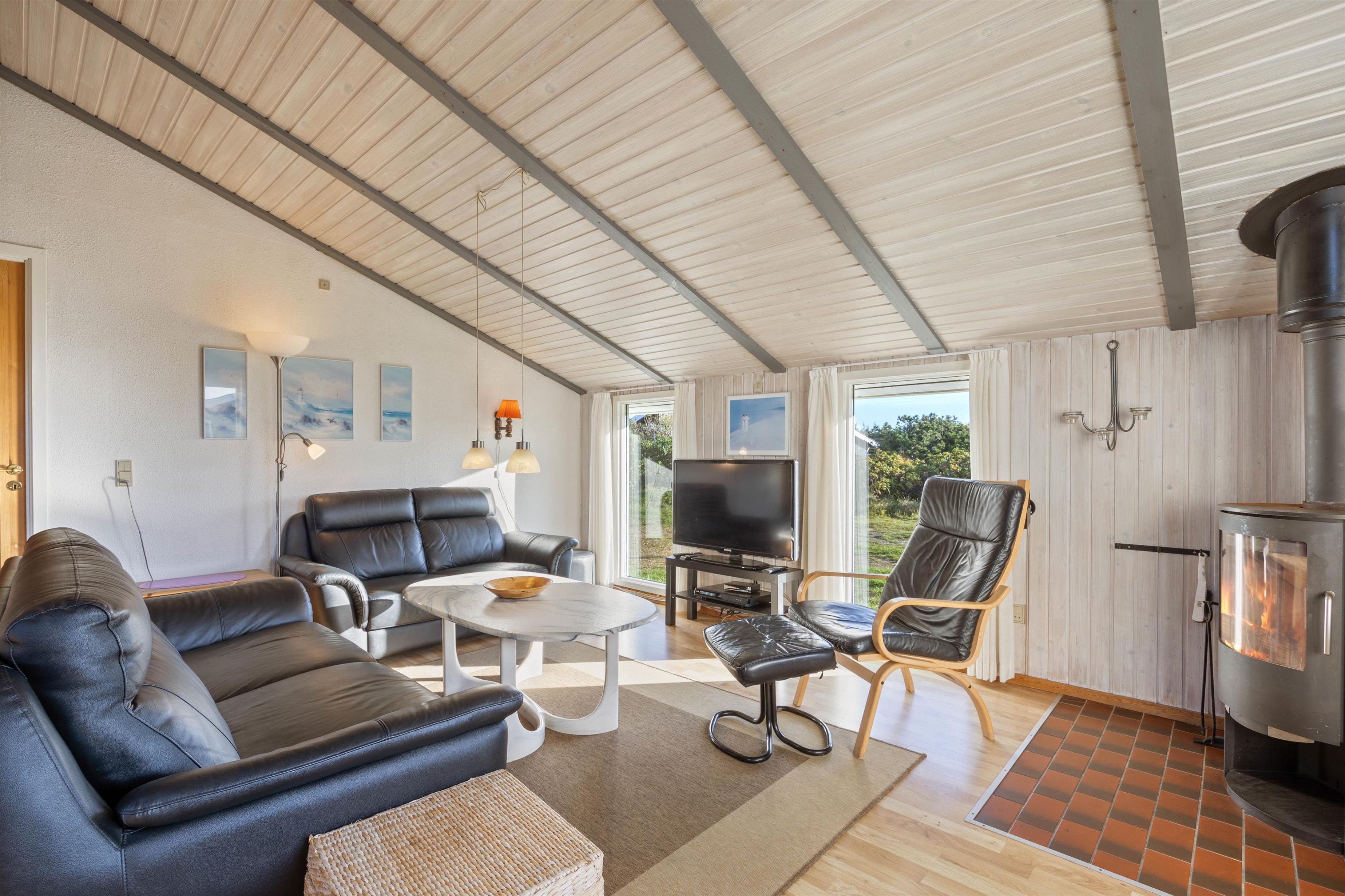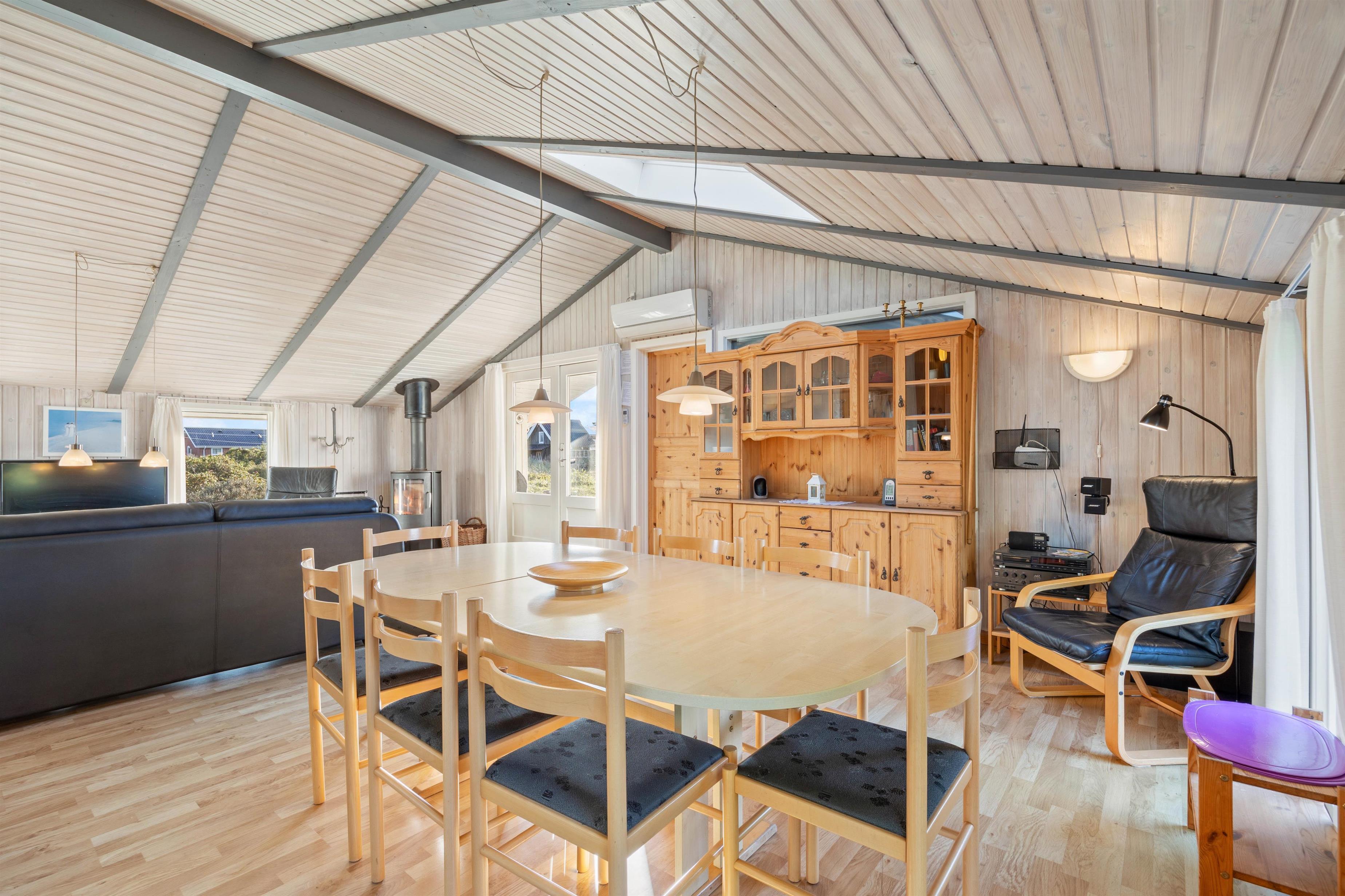 The open-plan living area offers simple but practical furnishings. The wood-burning stove provides cosy warmth on cool evenings, while the kitchen contains everything needed for meal preparation. There's plenty of space here for spending time together. The kitchen is functionally equipped with appliances including a dish washer to make cleaning up easier. The energy-efficient heat pump ensures a comfortable temperature throughout the open-plan living space.