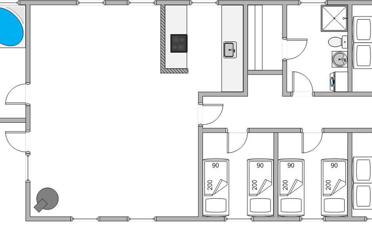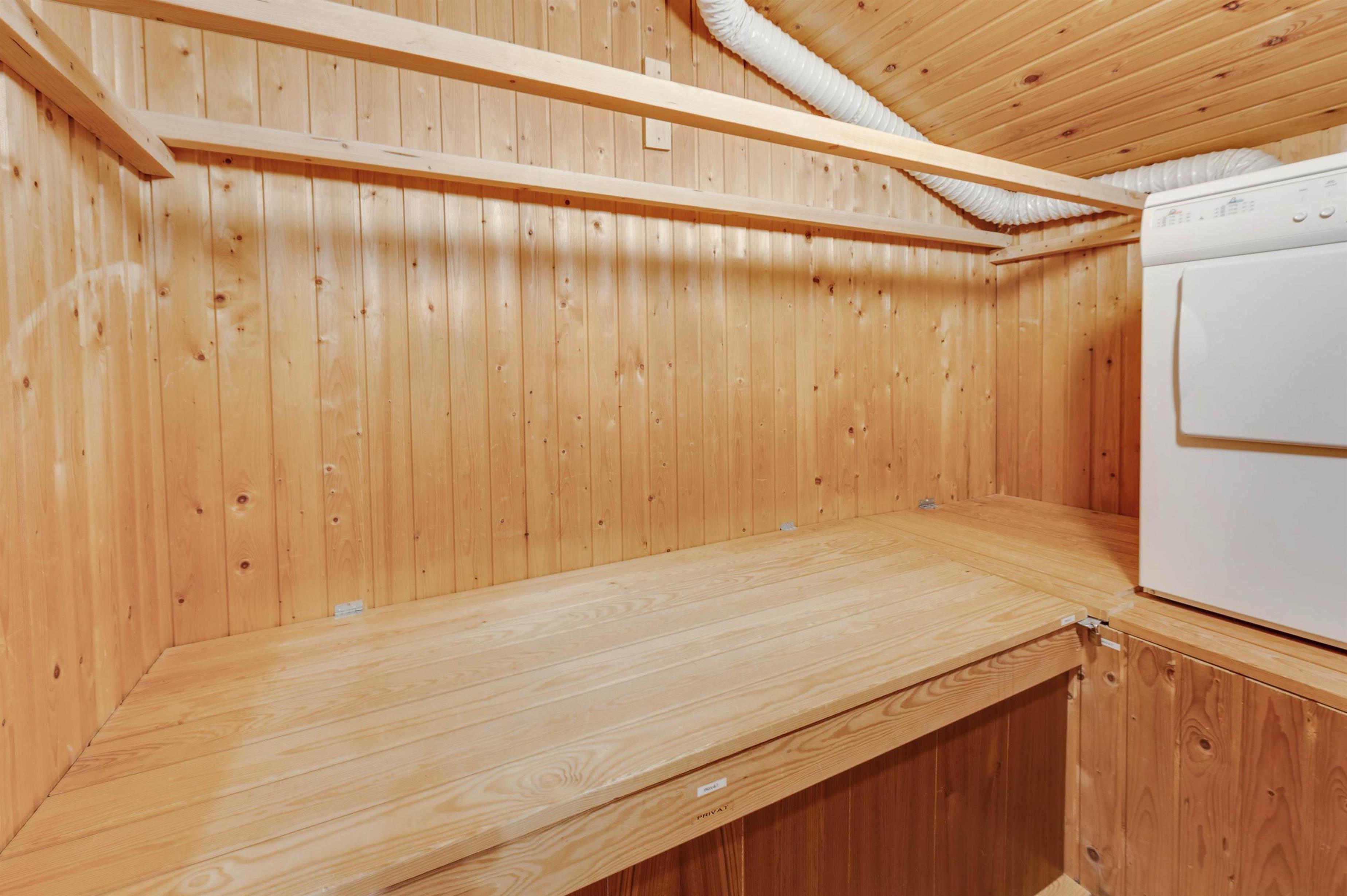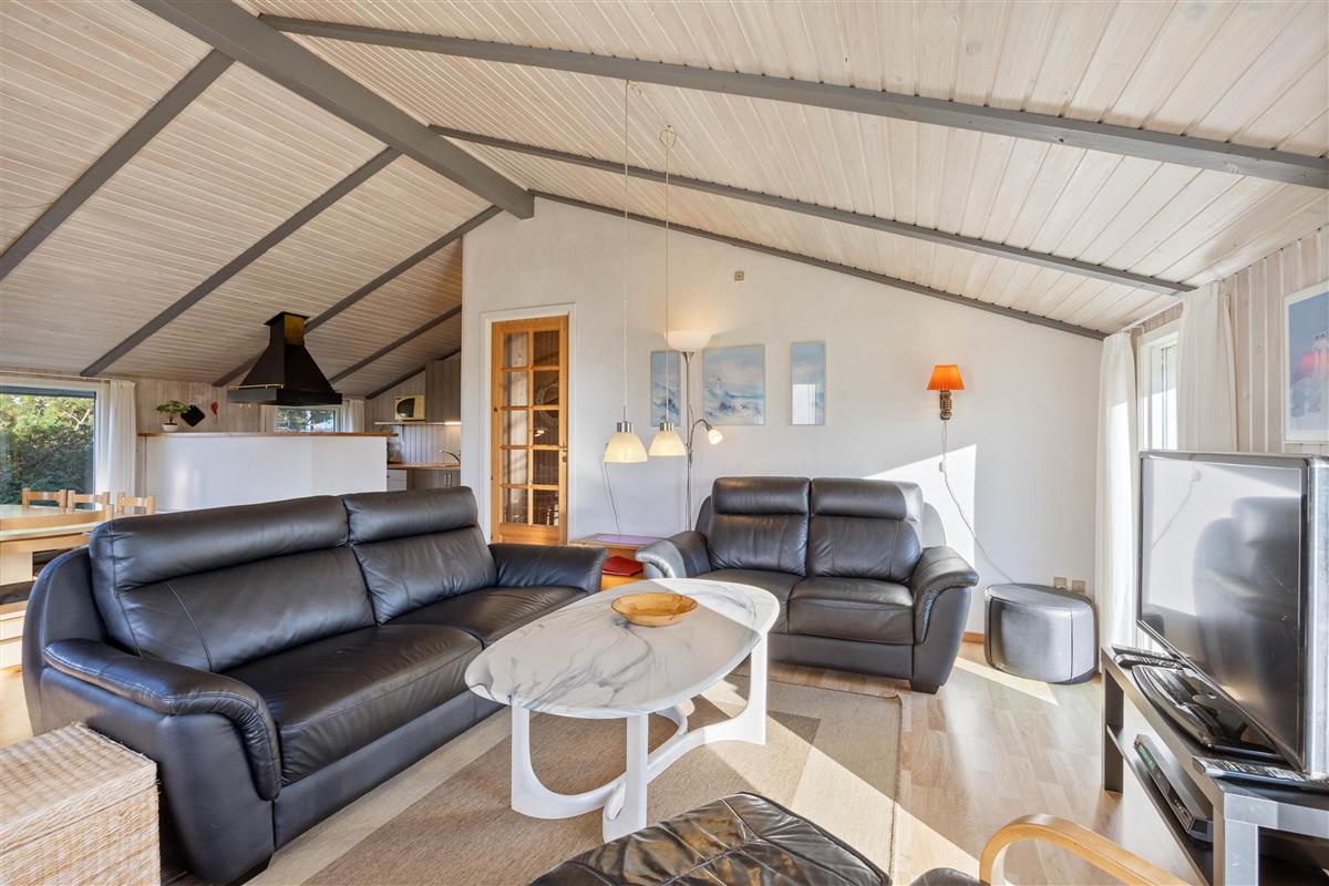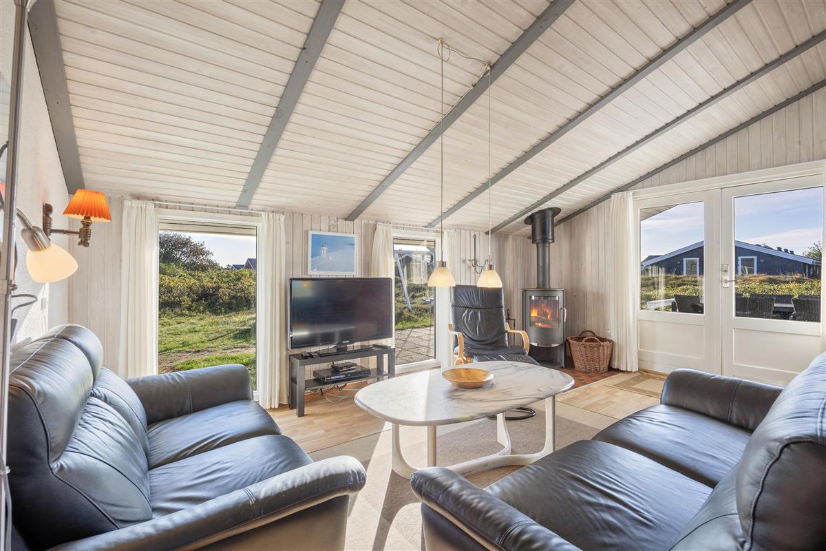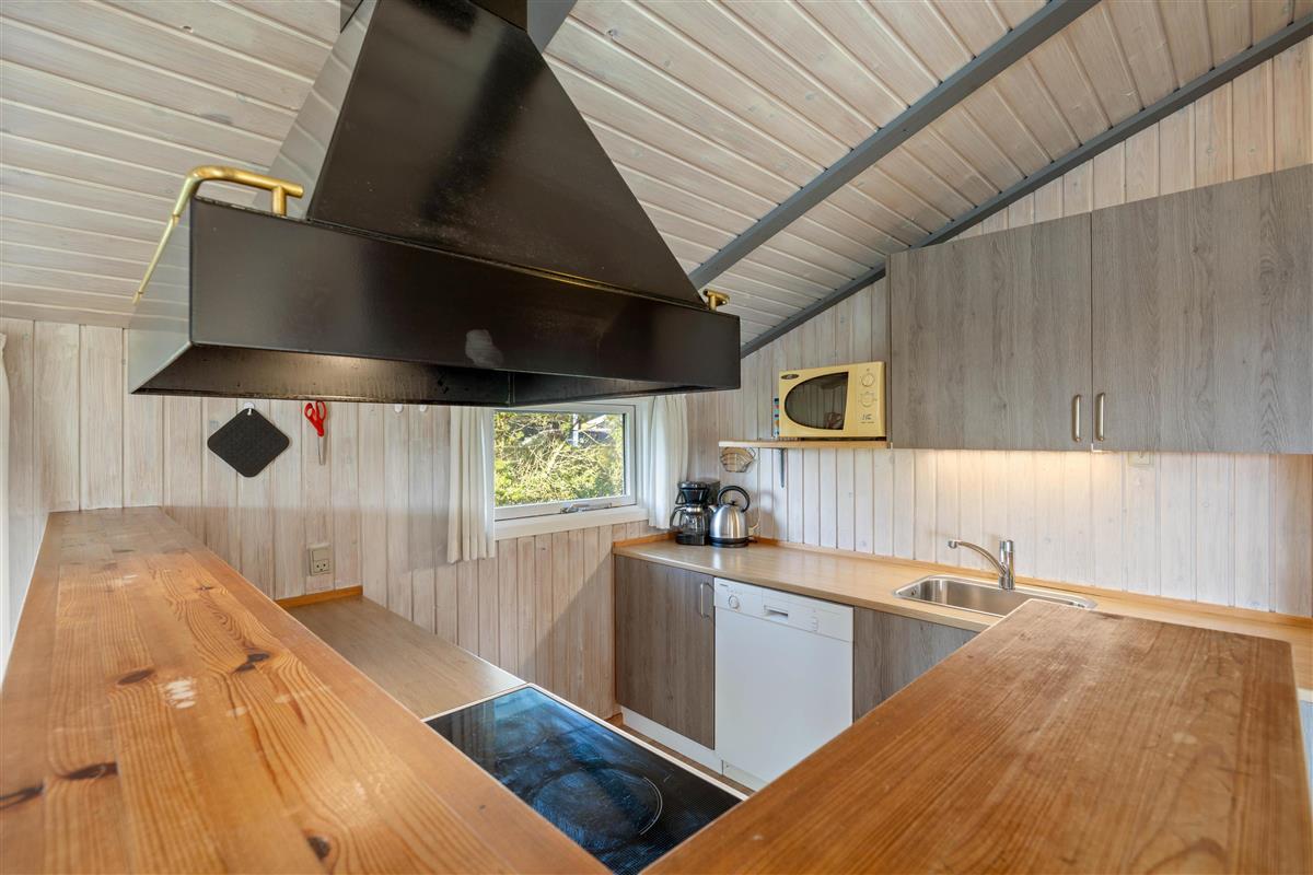 The open-plan living area offers simple but practical furnishings. The wood-burning stove provides cosy warmth on cool evenings, while the kitchen contains everything needed for meal preparation. There's plenty of space here for spending time together. The kitchen is functionally equipped with appliances including a dish washer to make cleaning up easier. The energy-efficient heat pump ensures a comfortable temperature throughout the open-plan living space.
