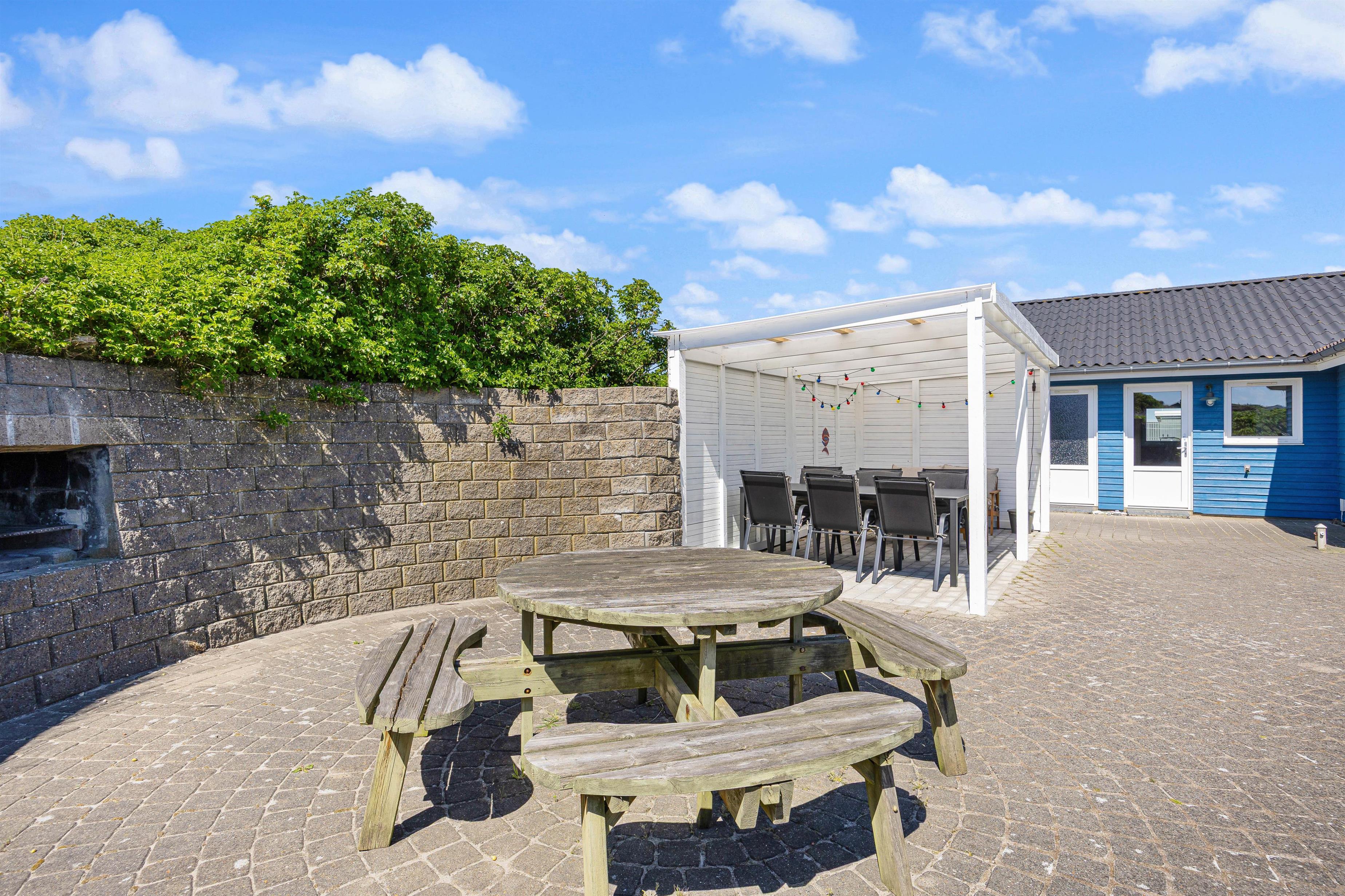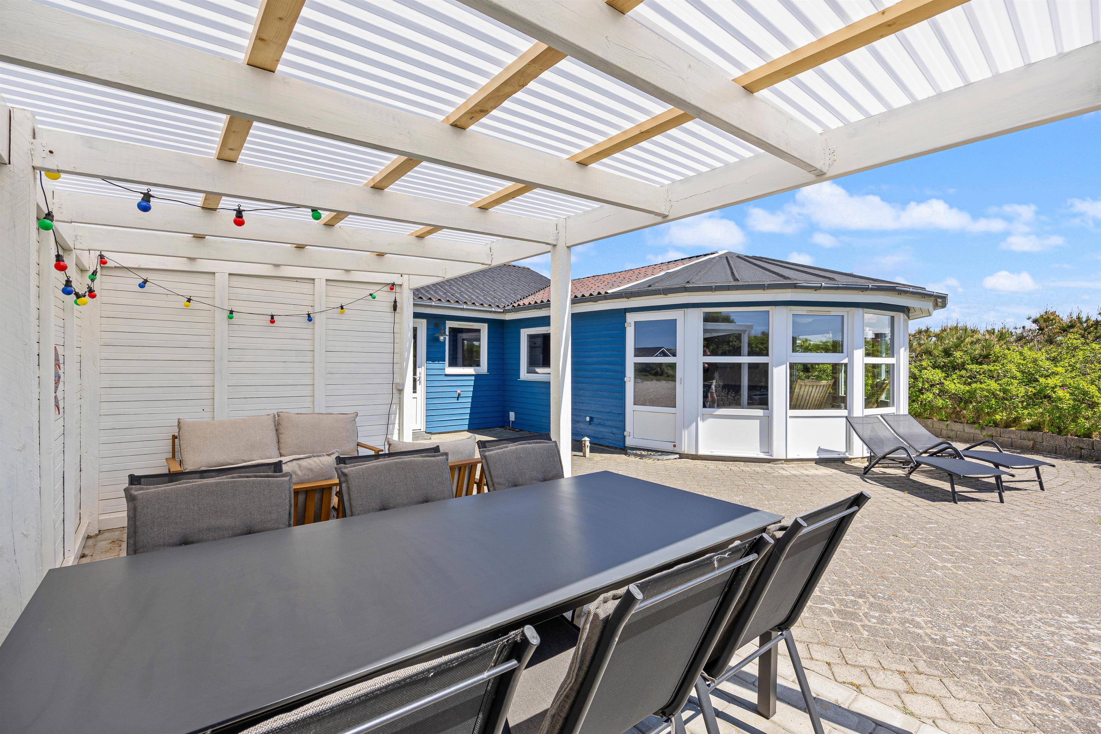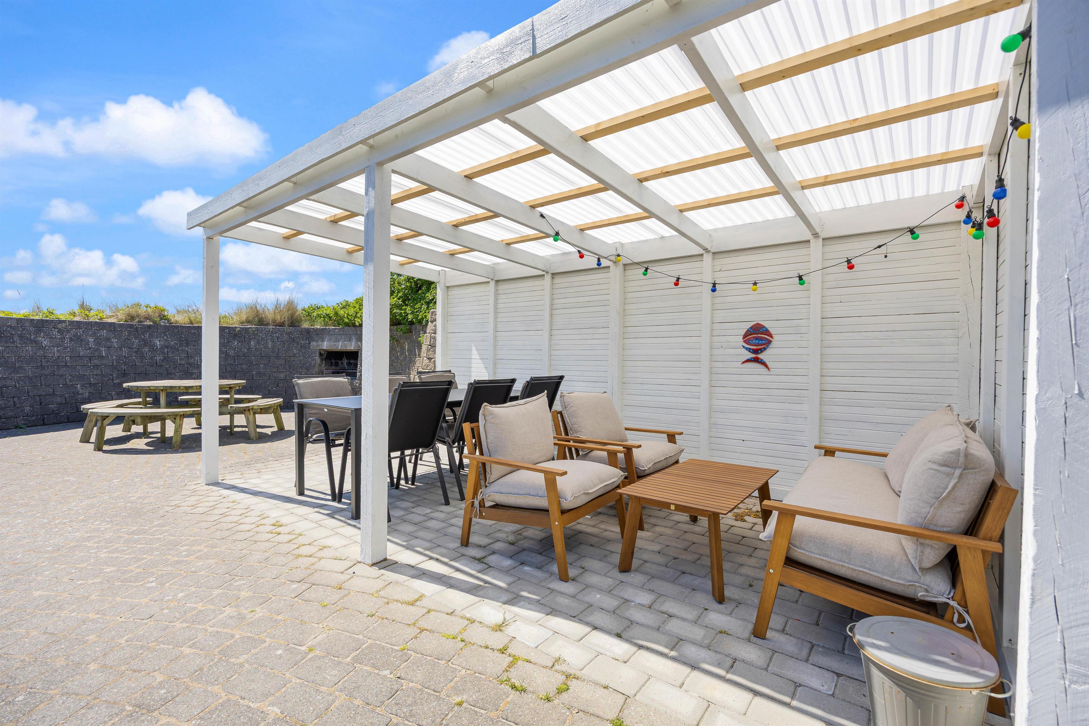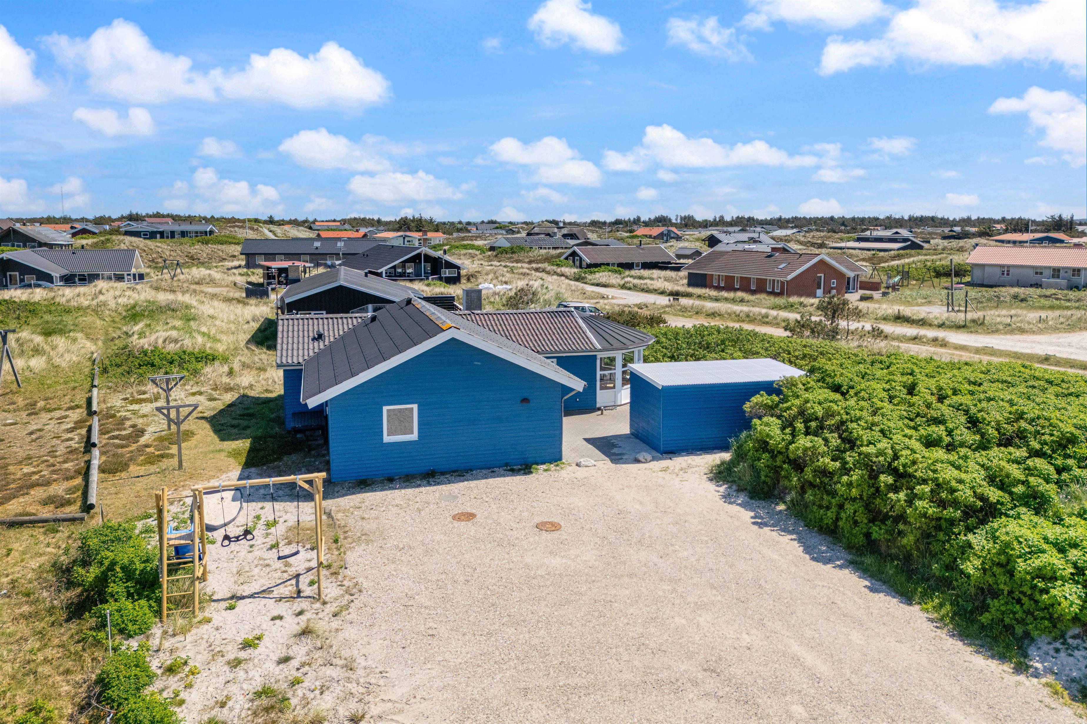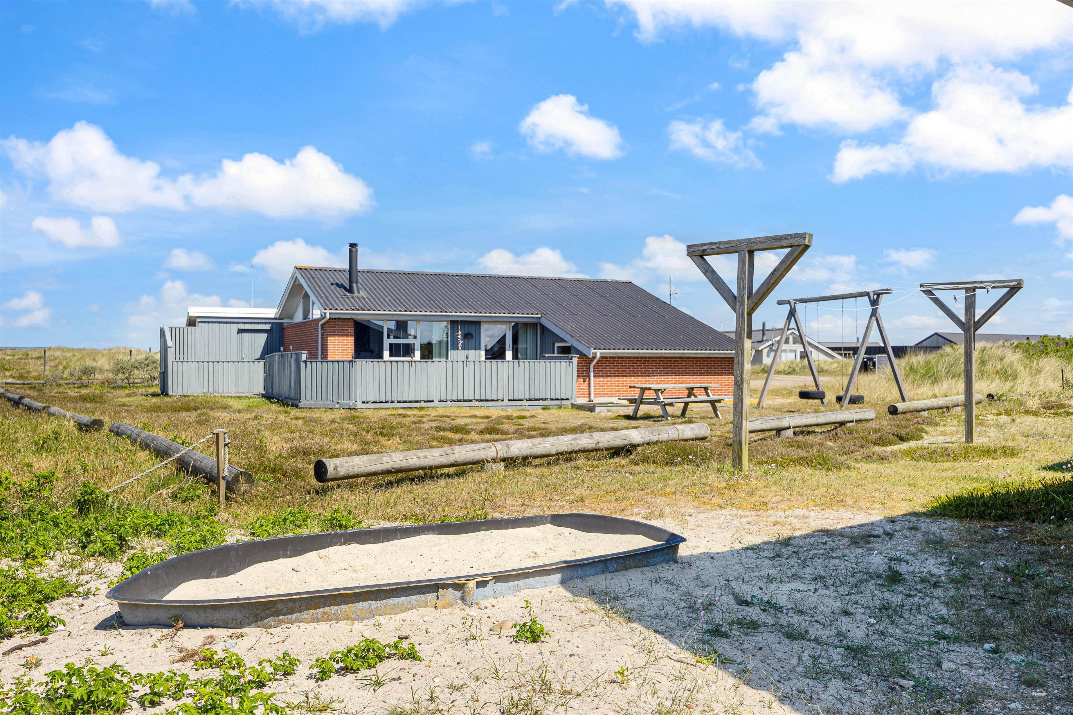The holiday home is designed with both adults and children in mind. On the large natural plot, there is a spacious, secluded, and partially covered terrace with a built-in grill. Here you can truly enjoy the sun and fresh sea air, while children have a sandbox and a swing set to play on.