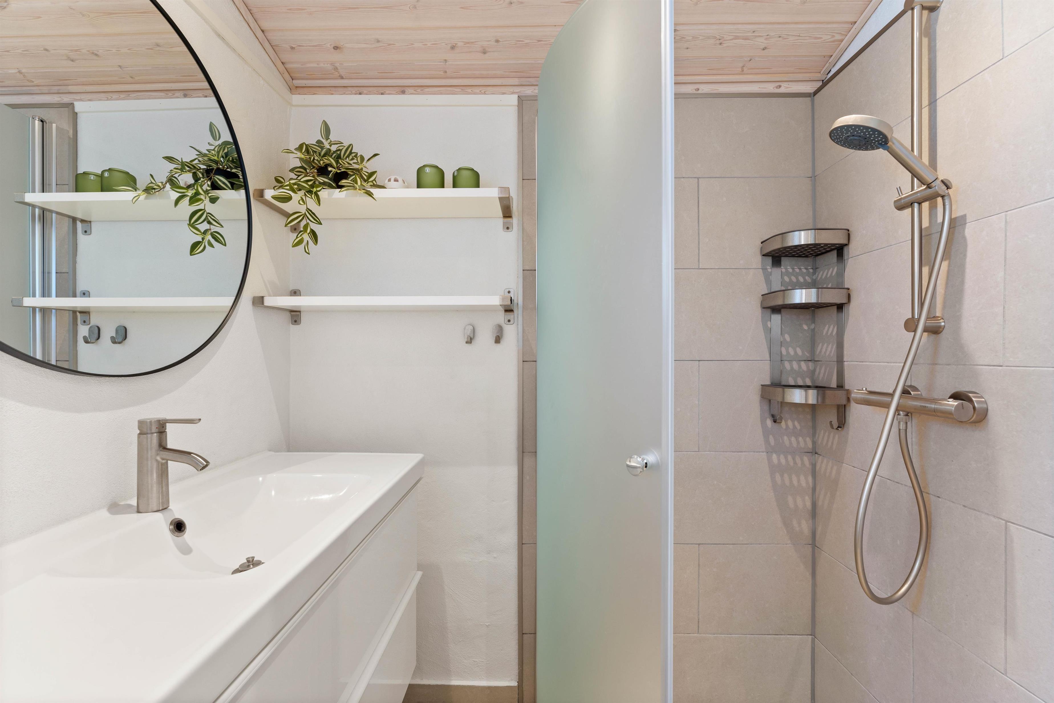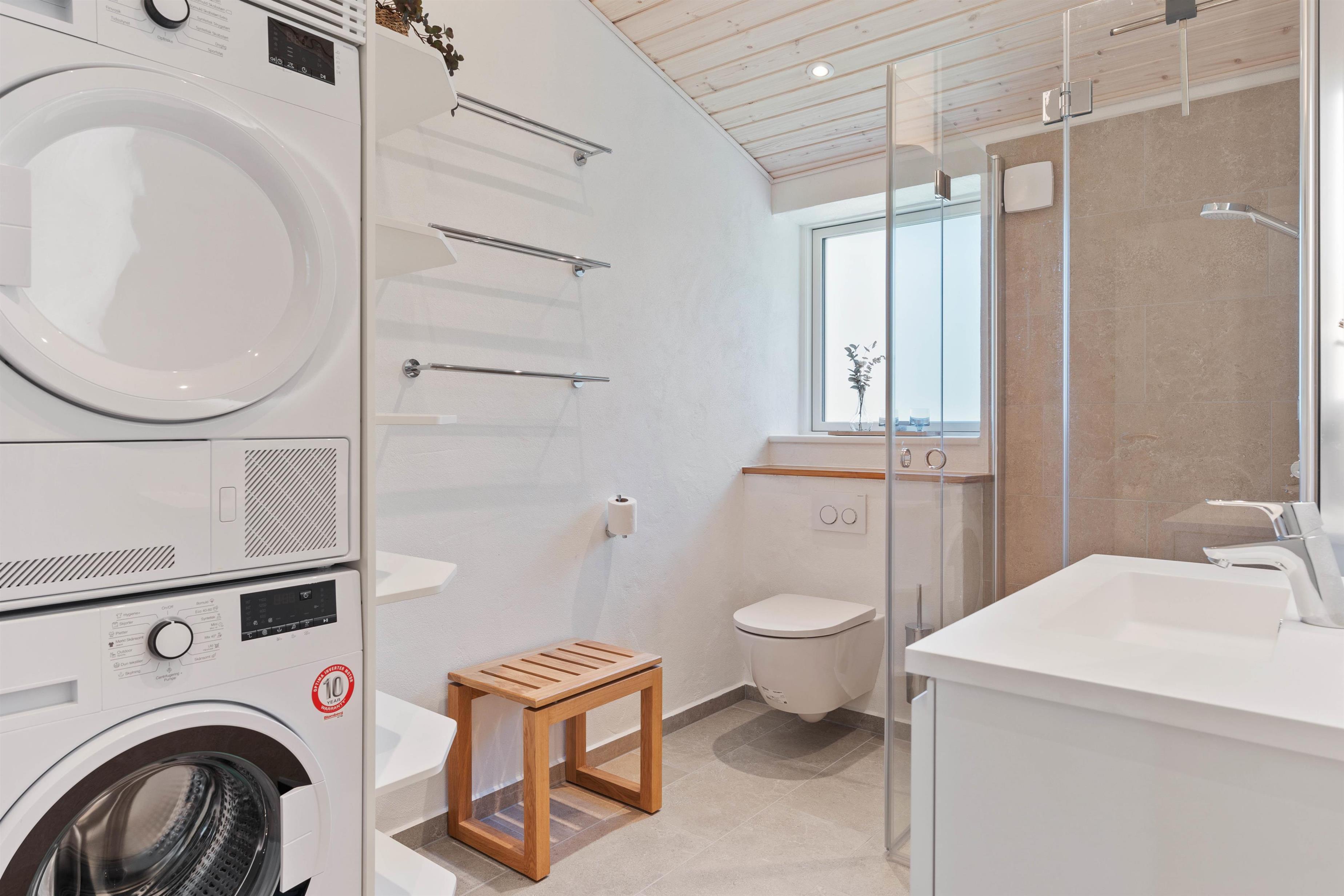 Next to the practical entrance area, there's a compact but well-appointed bathroom with shower and underfloor heating. A second bathroom in the holiday home ensures plenty of facilities for all guests. Additional conveniences include a washing machine and tumble dryer.