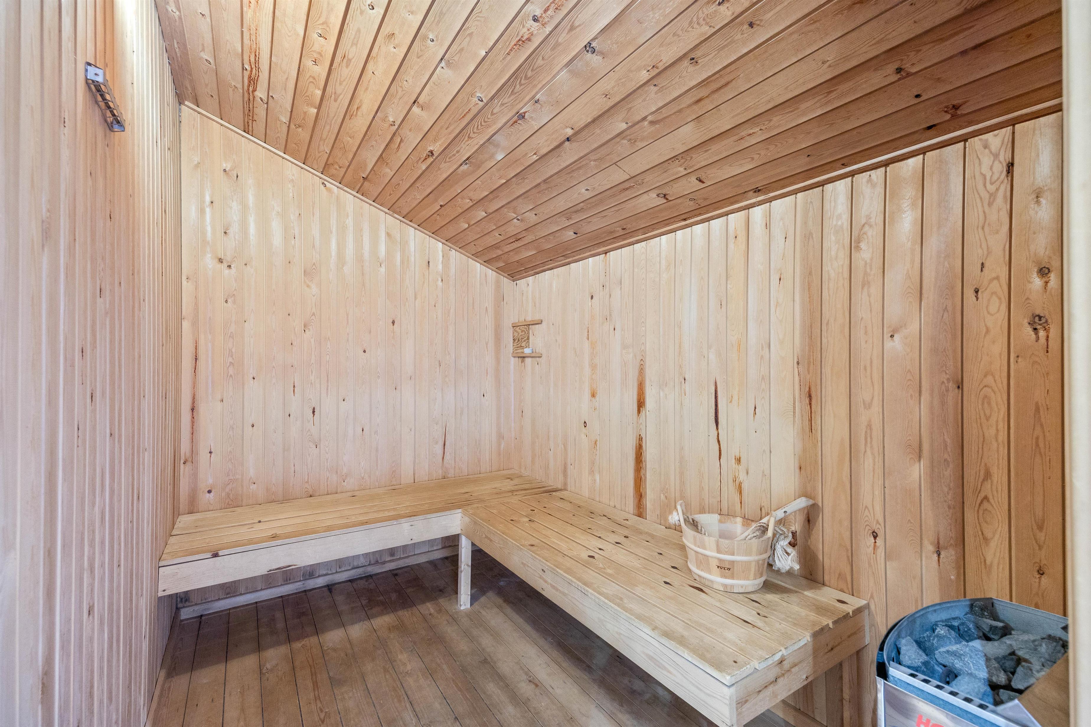 In the bright living room, you can relax in front of the wood-burning stove and enjoy its comfortable warmth. The bathroom features a lovely sauna with a glass door, perfect for unwinding after a long beach walk.