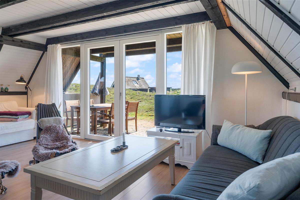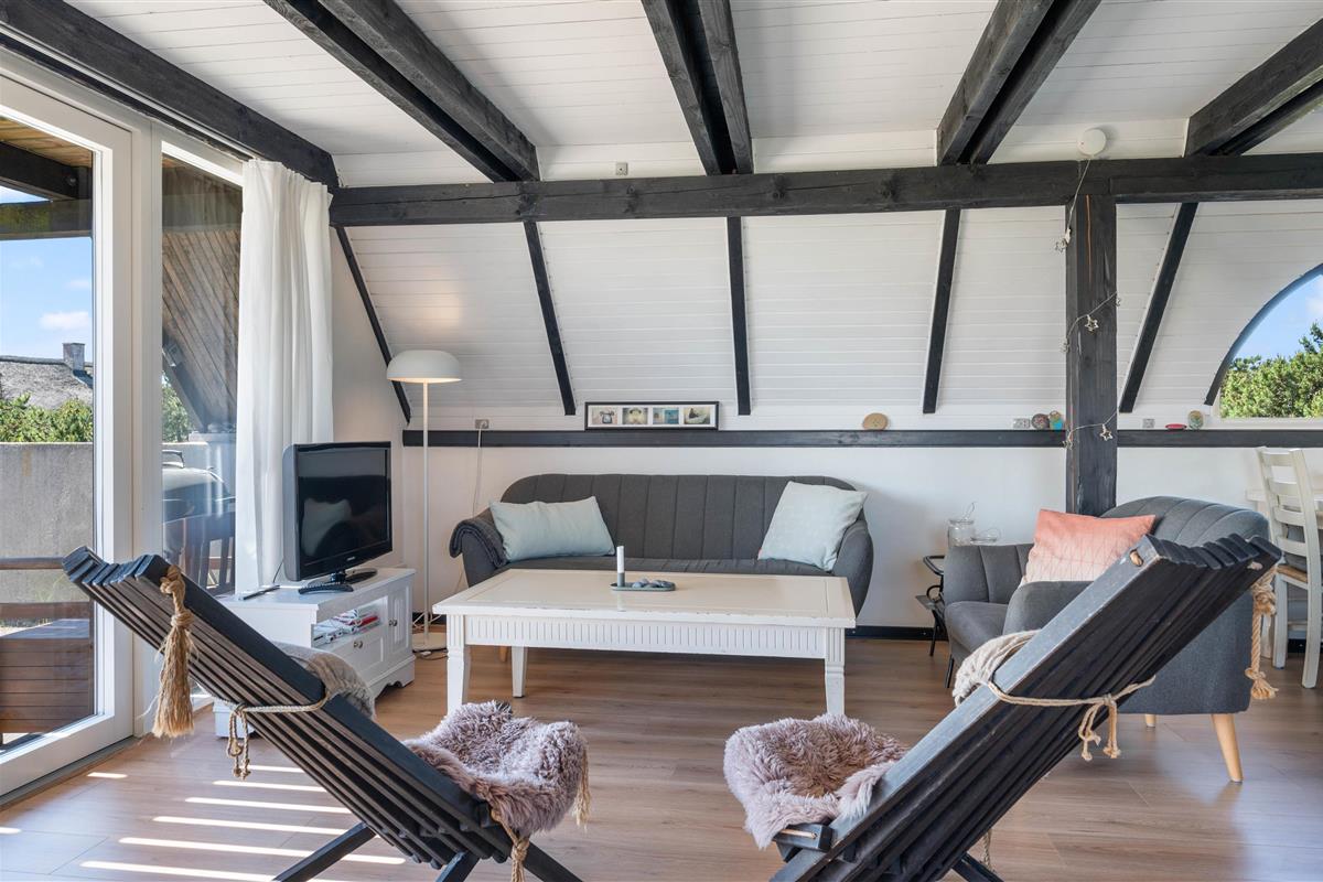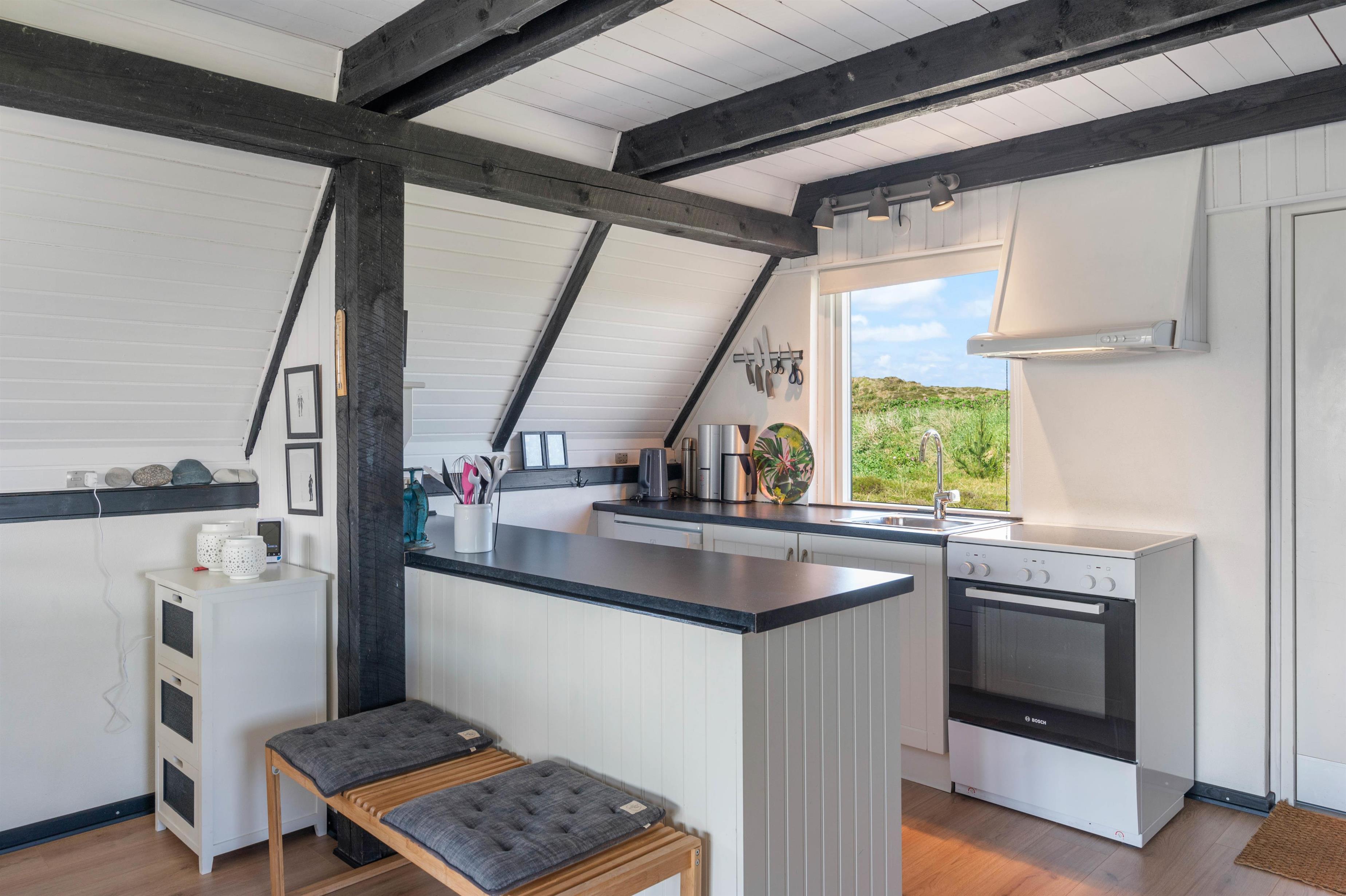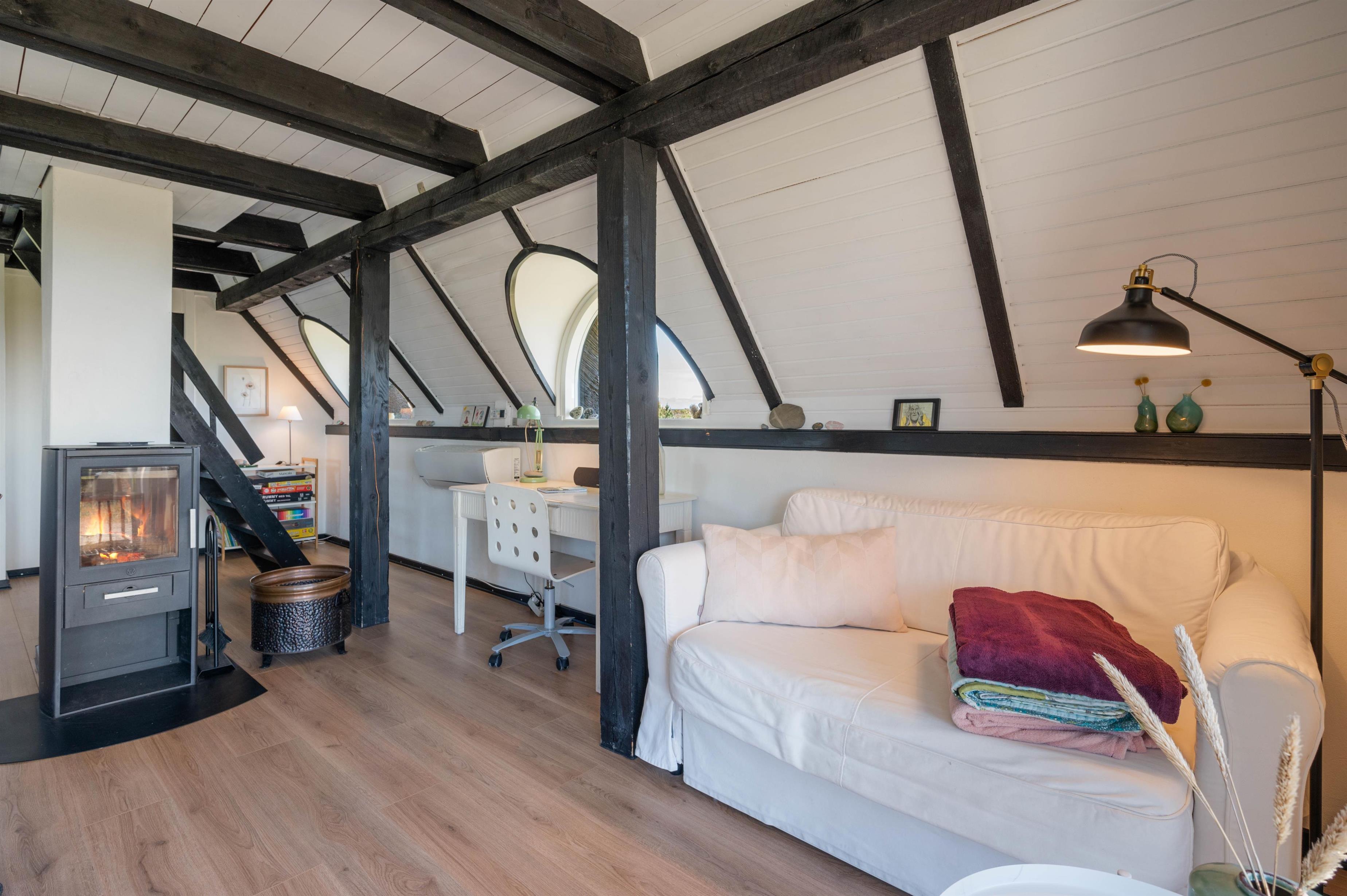 The open living area creates a bright and welcoming space where you can spend time together throughout the day. Whether you are enjoying a relaxed evening, sharing meals or simply unwinding after a walk along the beach, this area forms the natural centre of the holiday home. On cooler days, the wood-burning stove adds warmth and a cosy atmosphere, while the energy-efficient heat pump helps maintain a comfortable indoor climate.