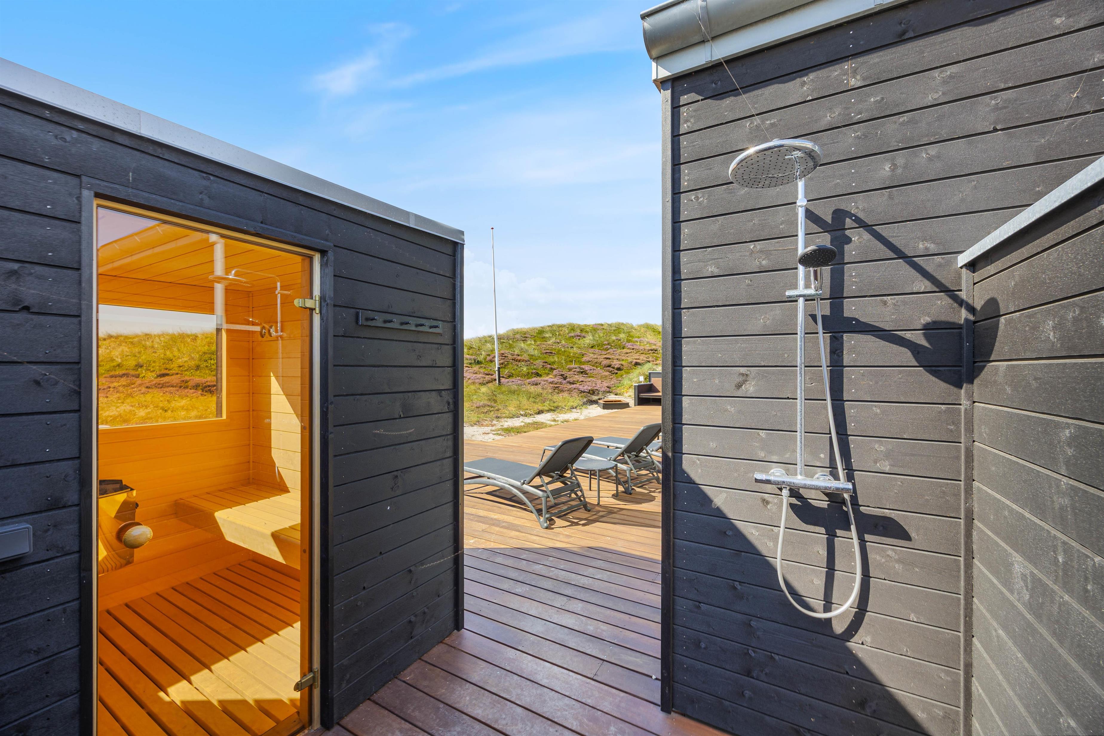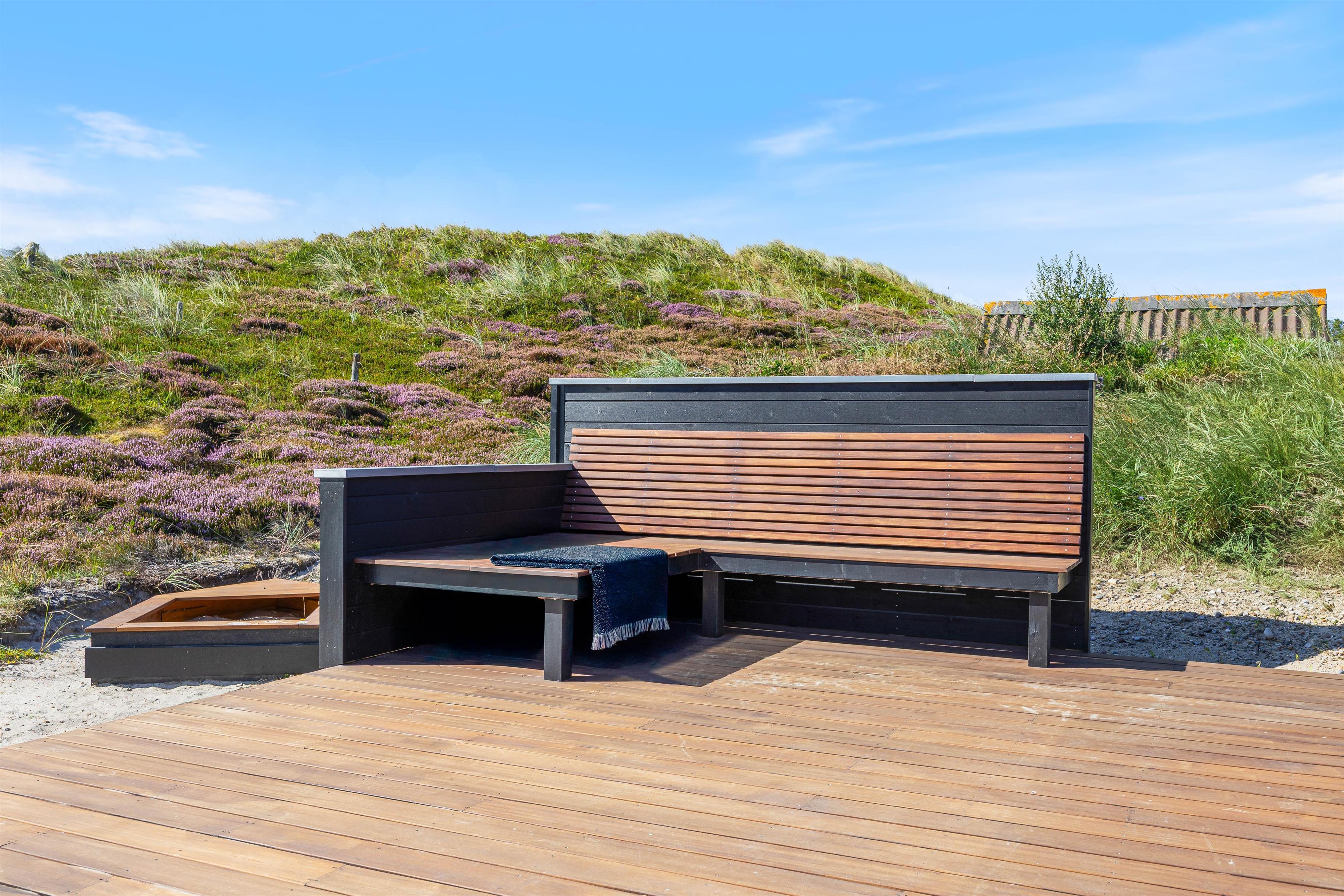 The outdoor area, with its partially covered large terrace surrounded by beautiful dunes, invites relaxation. The terrace features comfortable garden furniture and sun loungers for soaking up the sunshine. A gas barbecue is available for sociable evening meals, and a refreshing outdoor shower is available from April to November.