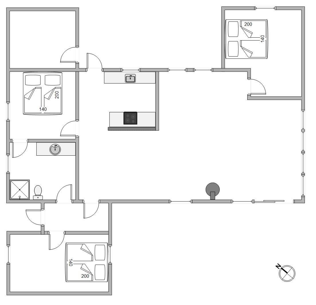 The living room flows into the open-plan kitchen, which includes a separate 60-litre freezer and dishwasher. Here you can prepare evening meals to be cooked later on the barbecue. Conveniently, all three bedrooms are placed in different corners of the holiday home. Each is furnished with comfortable double beds and fitted wardrobes.