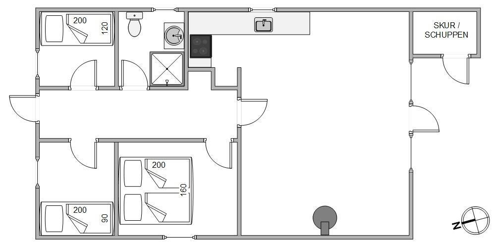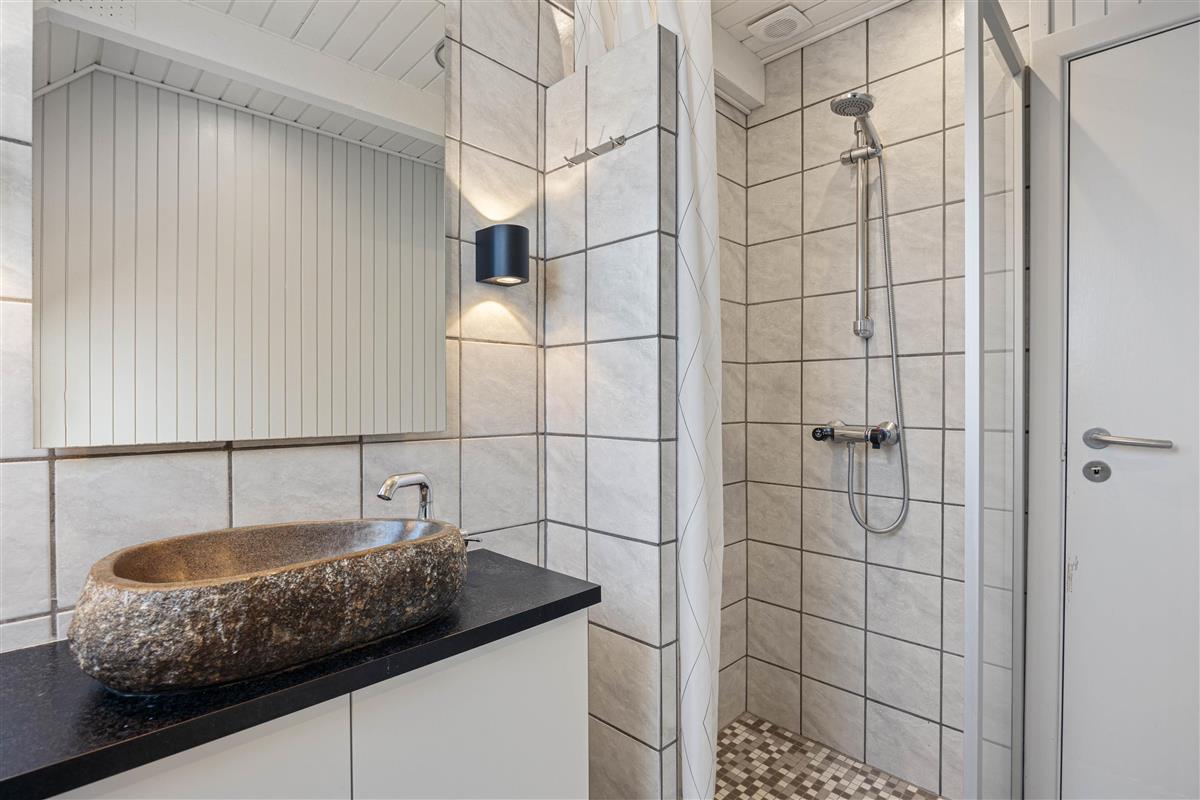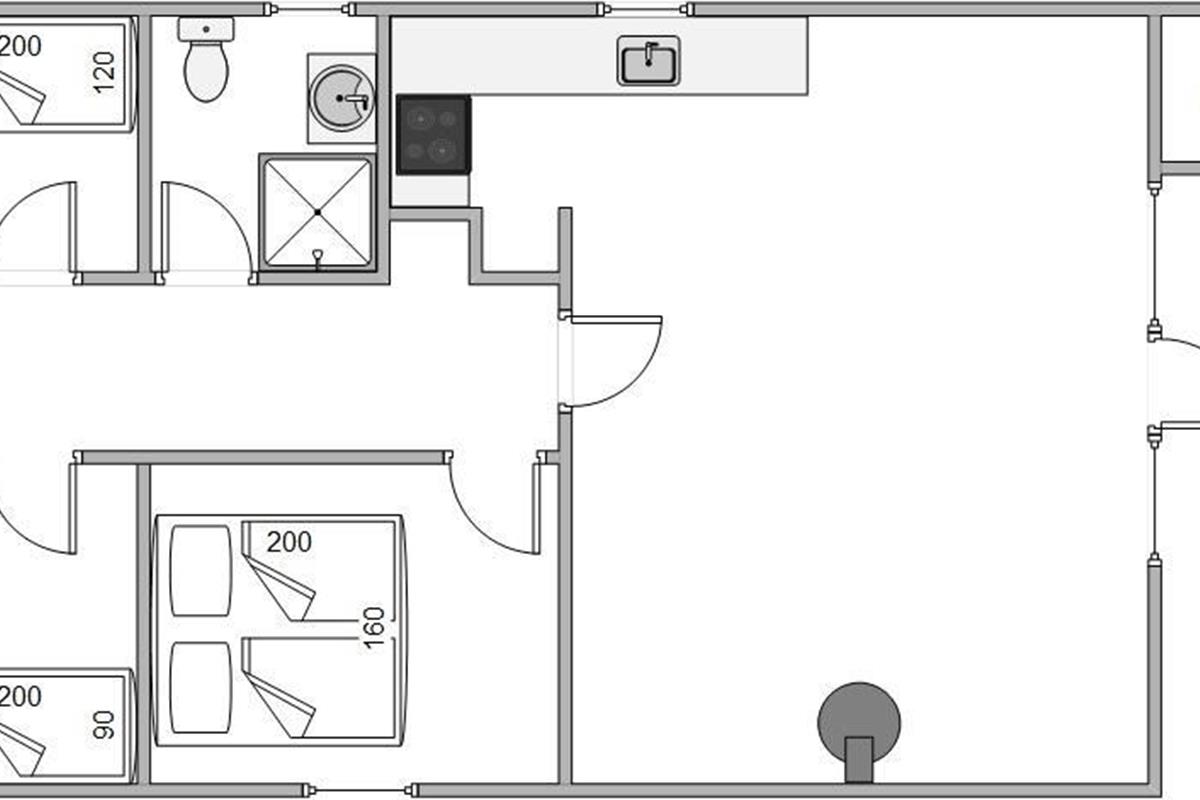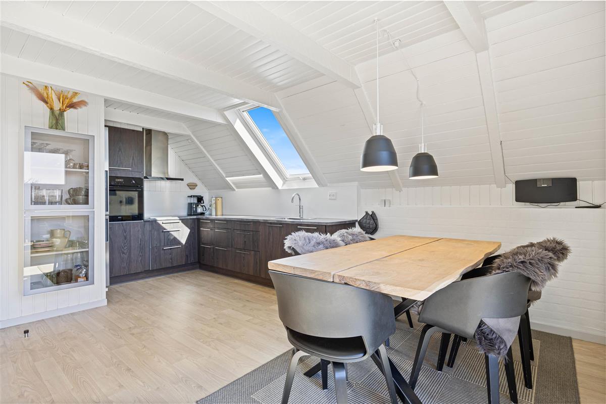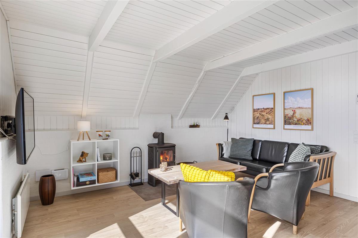 Inside the holiday home, you'll find a comfortable, open-plan living area with a television, comfortable seating and a cosy wood-burning stove that provides warming heat on cooler days. The light-coloured walls and floors create an airy feel despite the low ceiling. An energy-efficient heat pump ensures a pleasant indoor climate year-round.