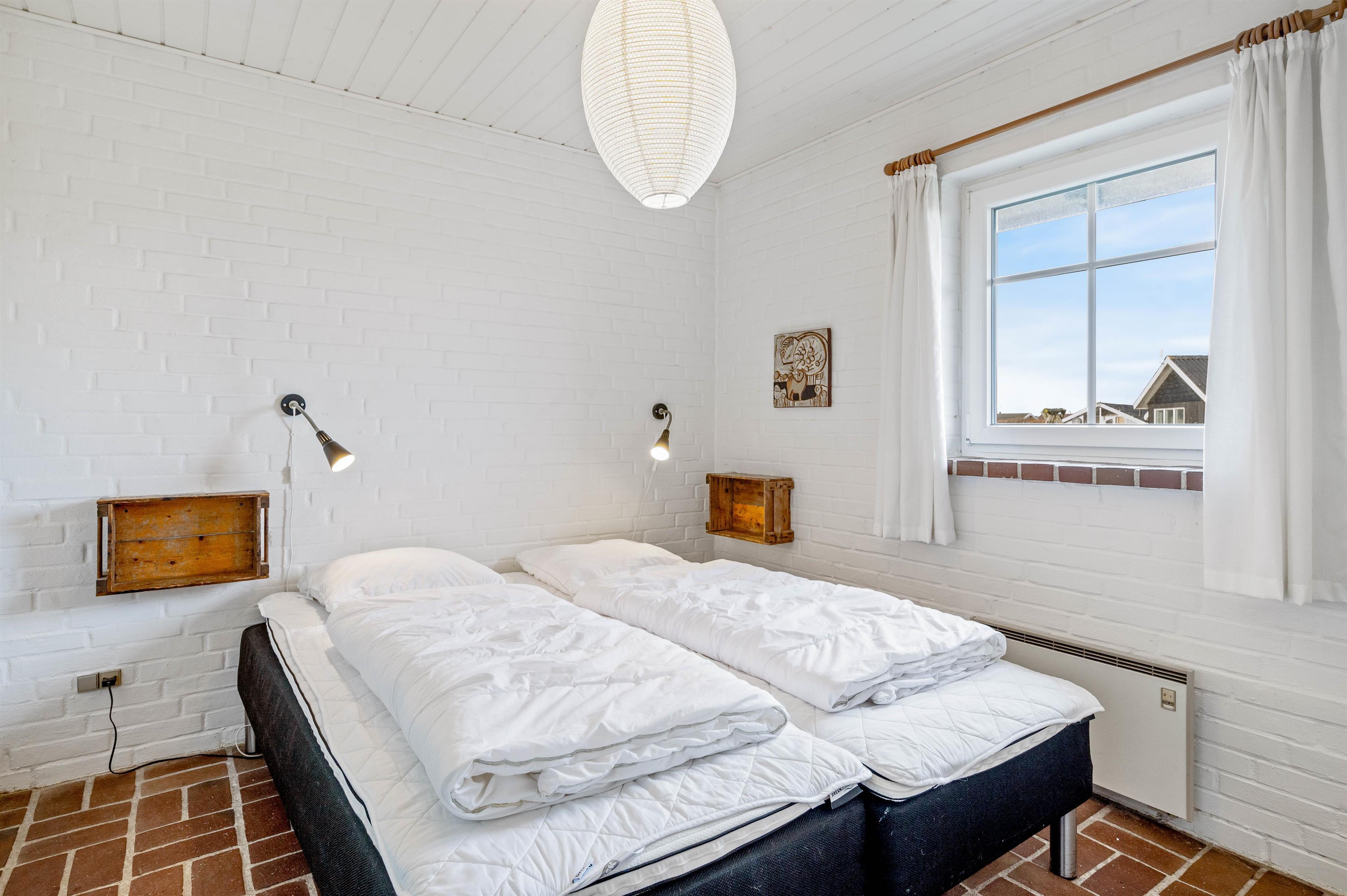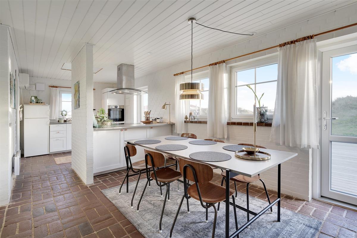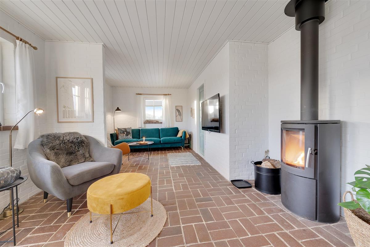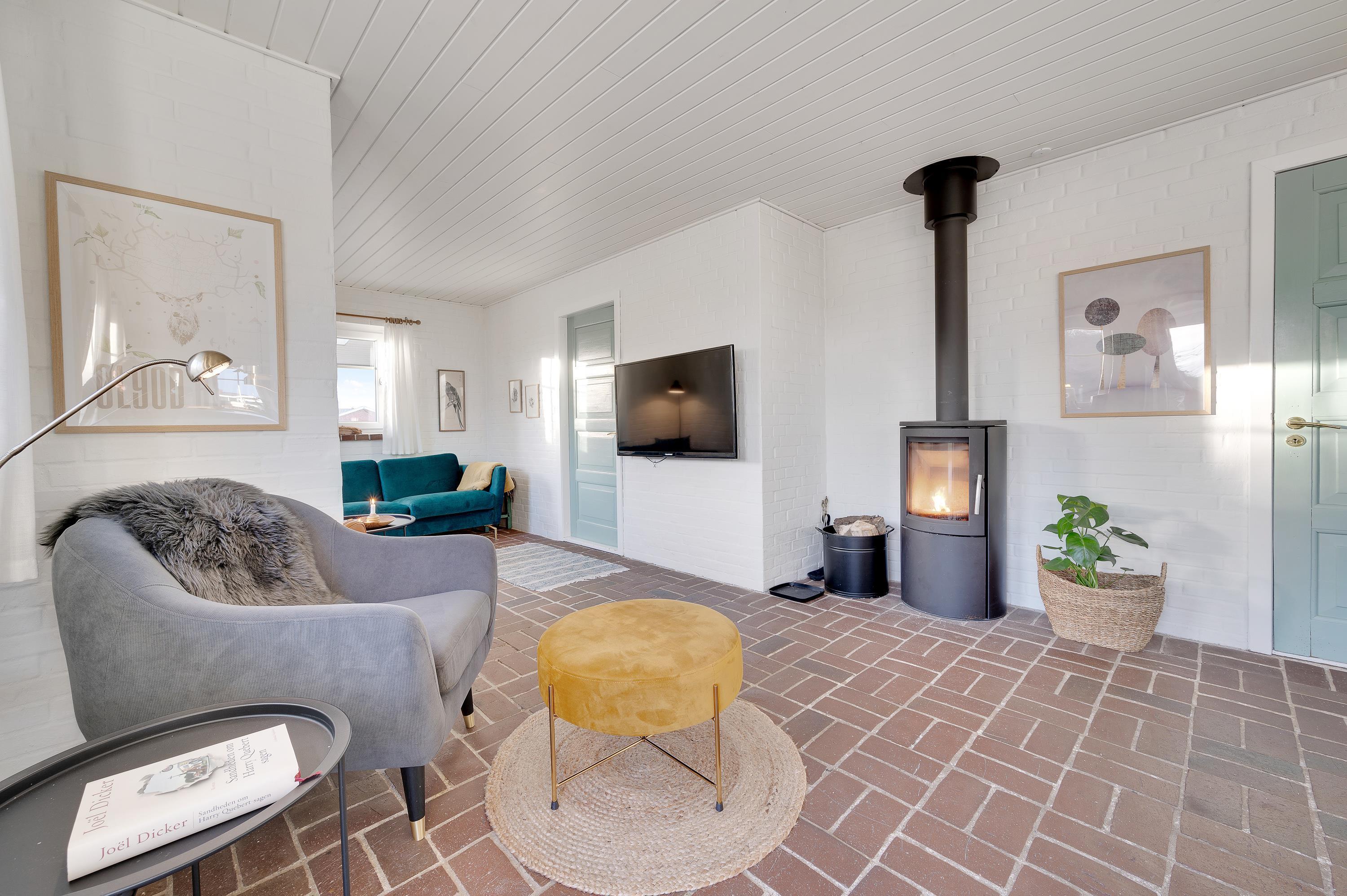 At the heart of this holiday home at Auroravej 40 is the light-filled living room with brick flooring, connecting all other rooms. The typical Scandinavian décor in natural tones and carefully chosen furnishings create a harmonious overall look and cosy atmosphere.
